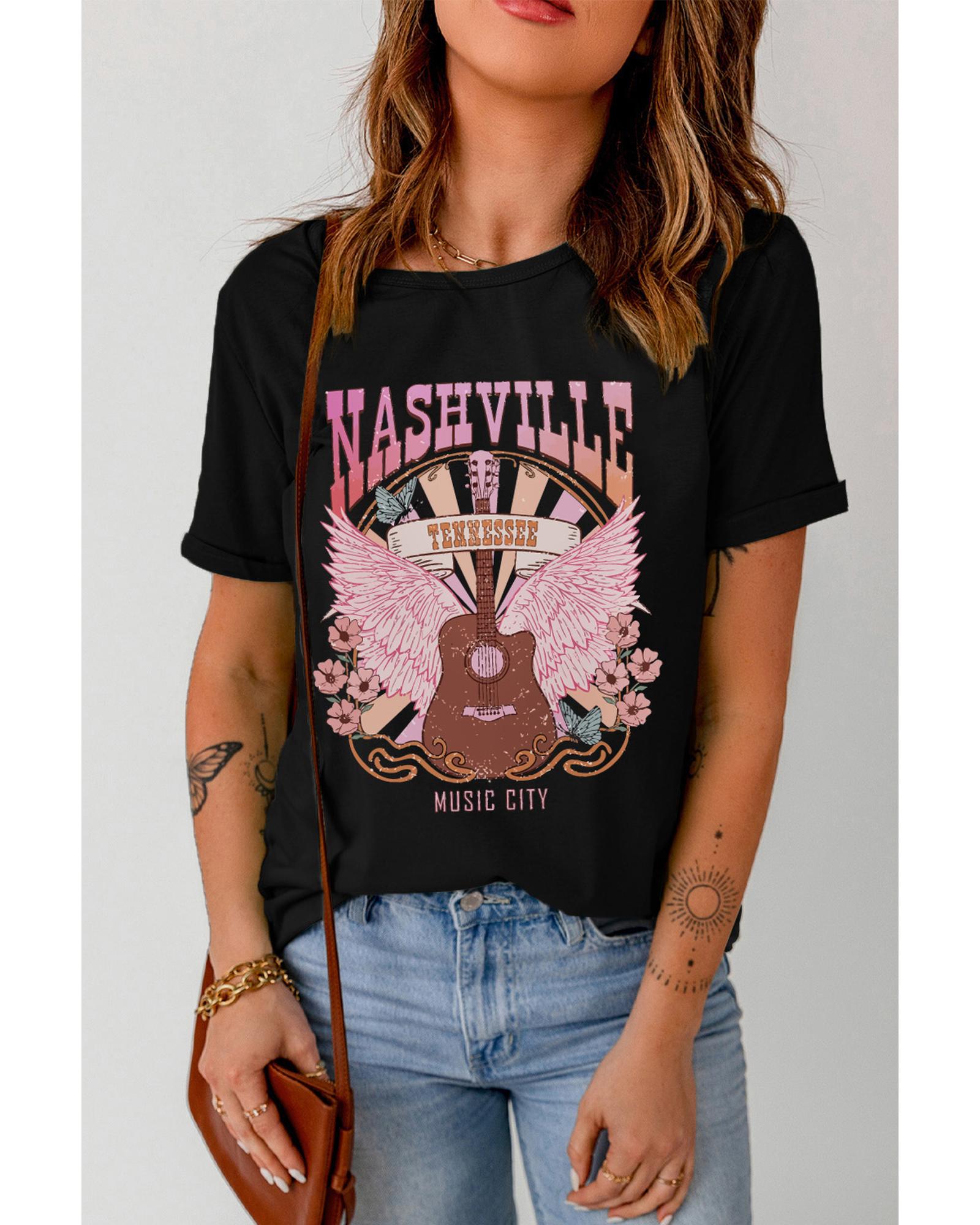 Stylish and trendy black short sleeve top Features a unique NASHVILLE Music City graphic print design Made from high - quality materials for comfort and durability Perfect for warmer weather with its short sleeves Available in various sizes for a perfect fit Pairs well with jeans or shorts for a casual and chic look