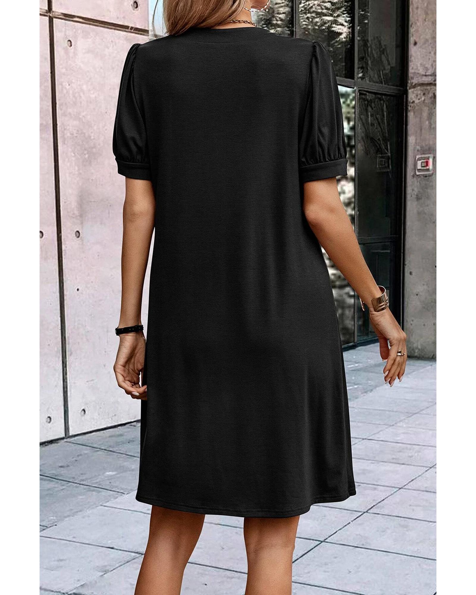 Black Notched Neck Pleated Puff Sleeve Shift T-shirt Dress – S
