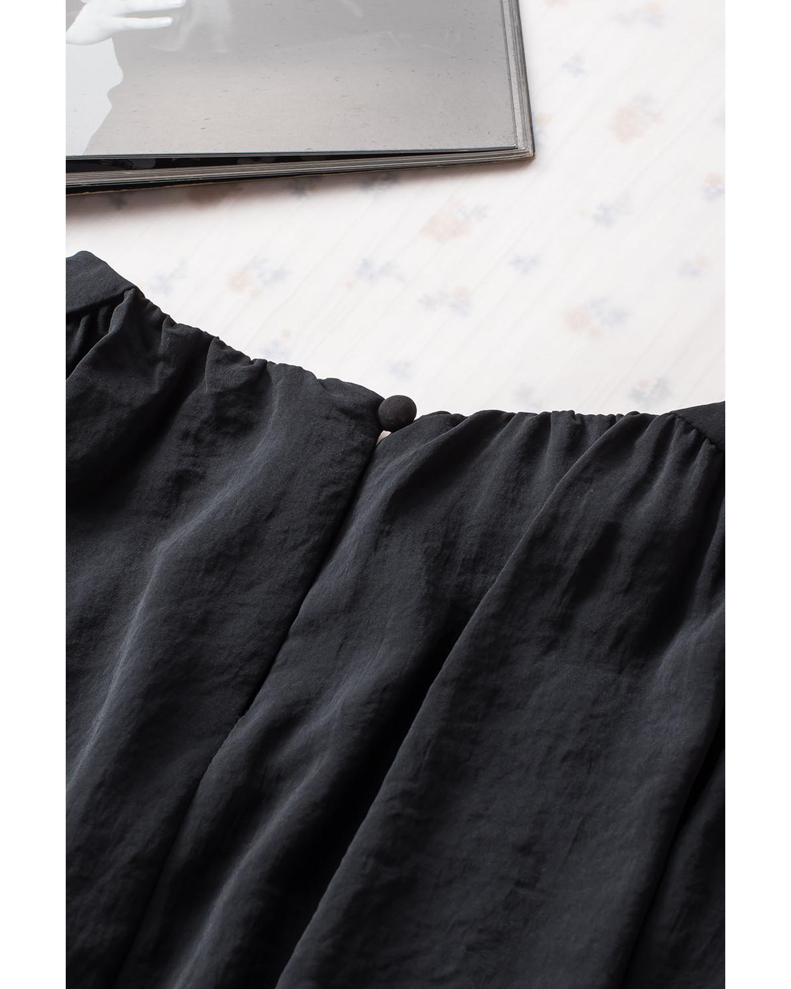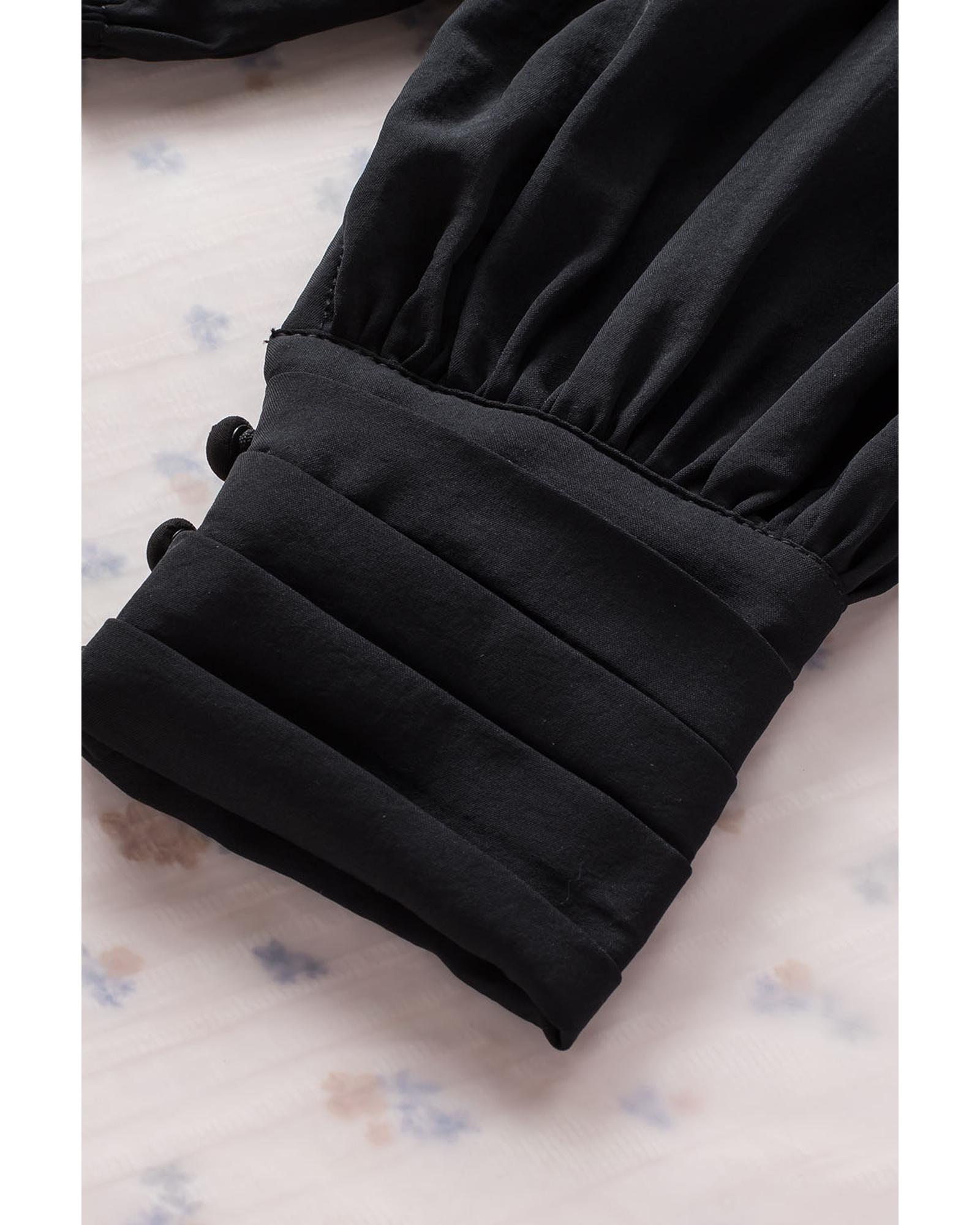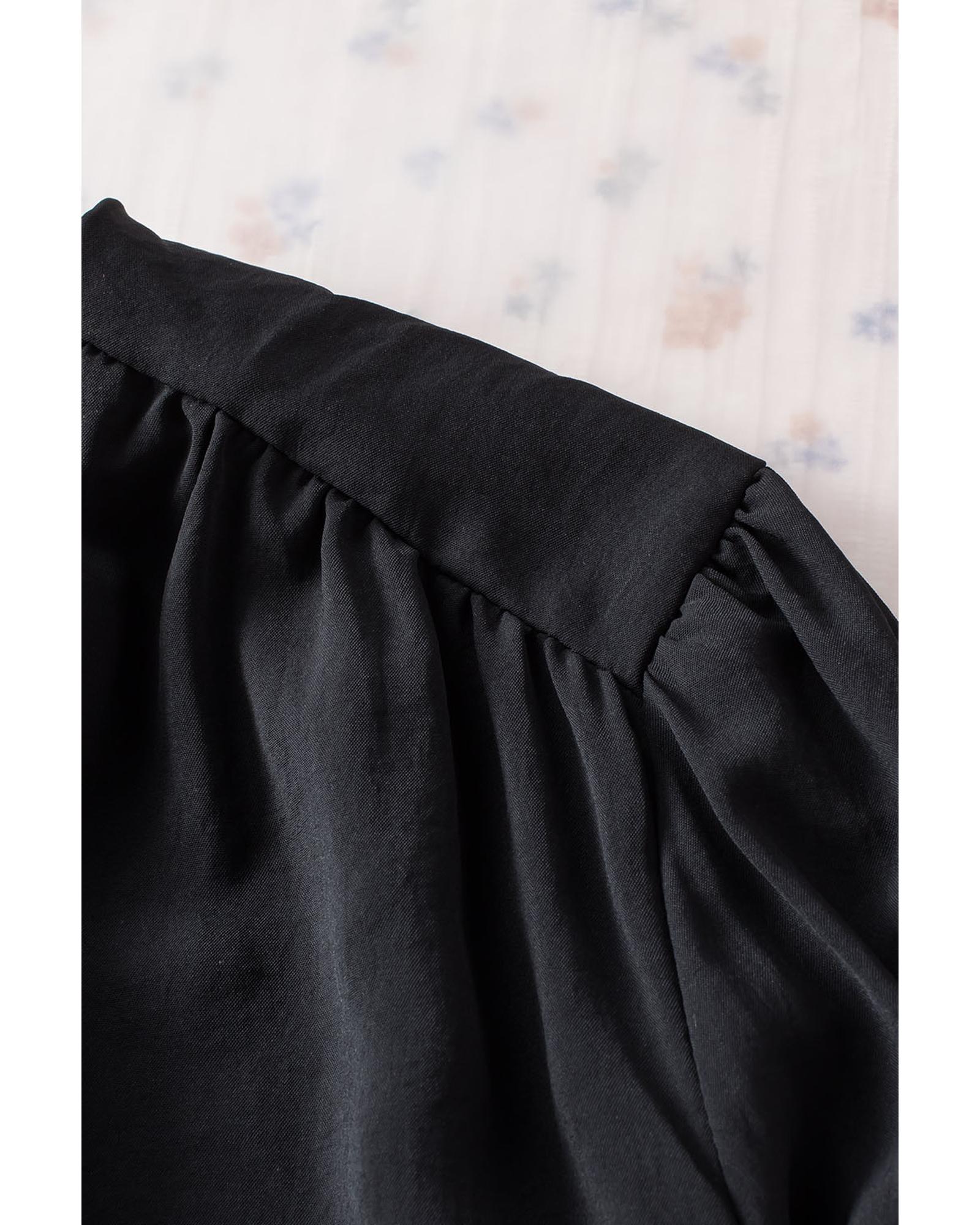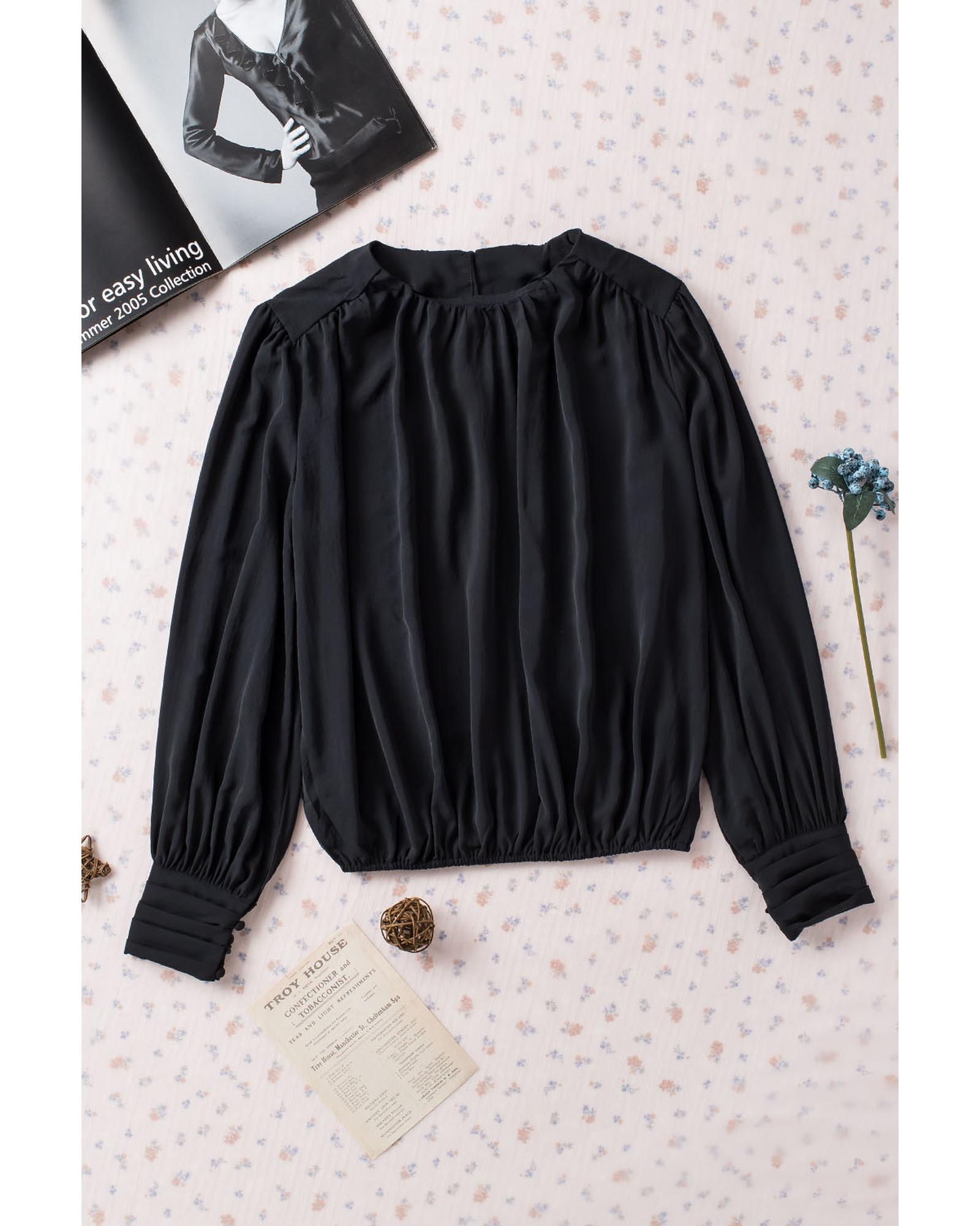 Black Padded Shoulder Buttoned Cuffs Pleated Loose Blouse – L