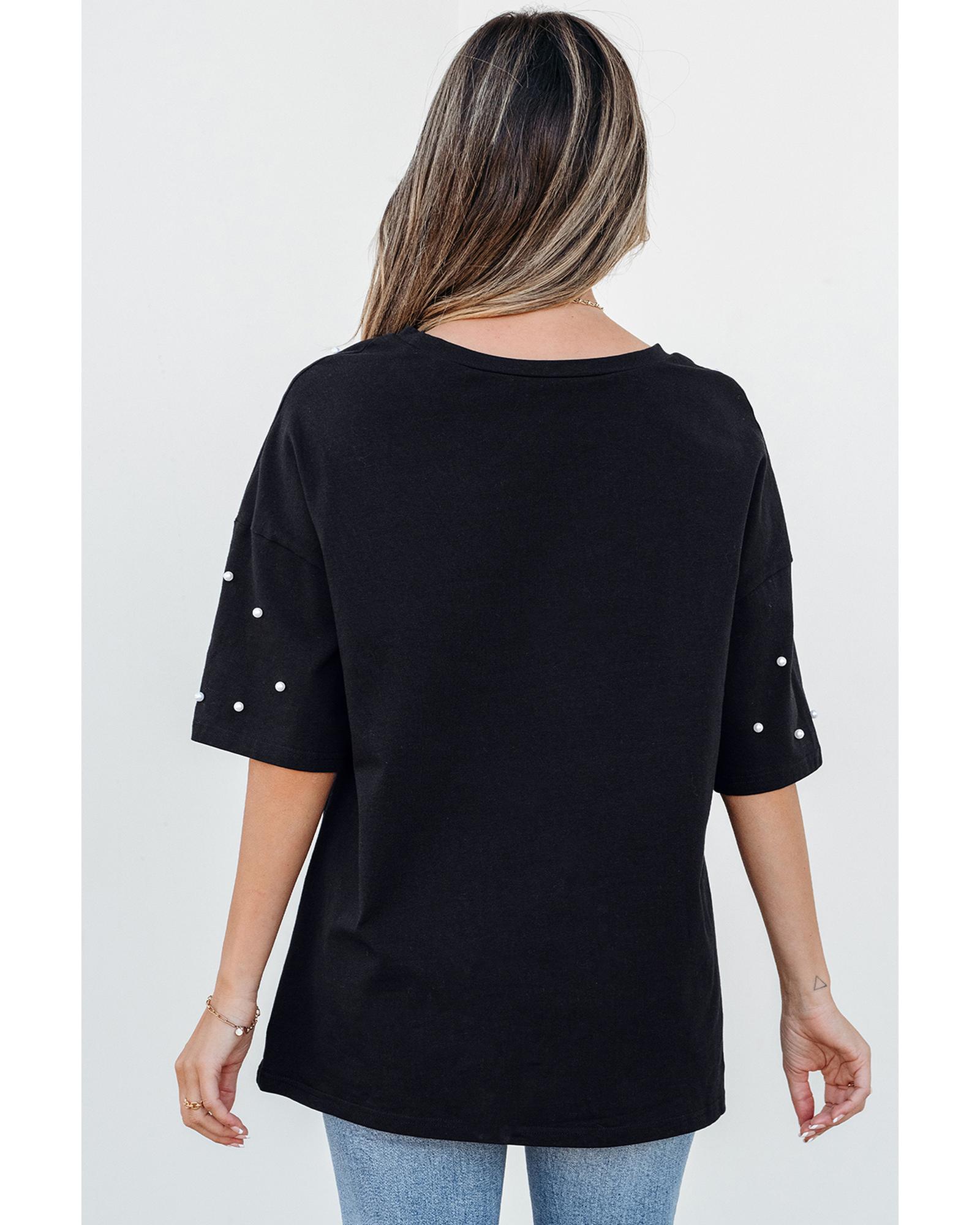 Black Pearl Beaded Drop Shoulder Crewneck T Shirt – M