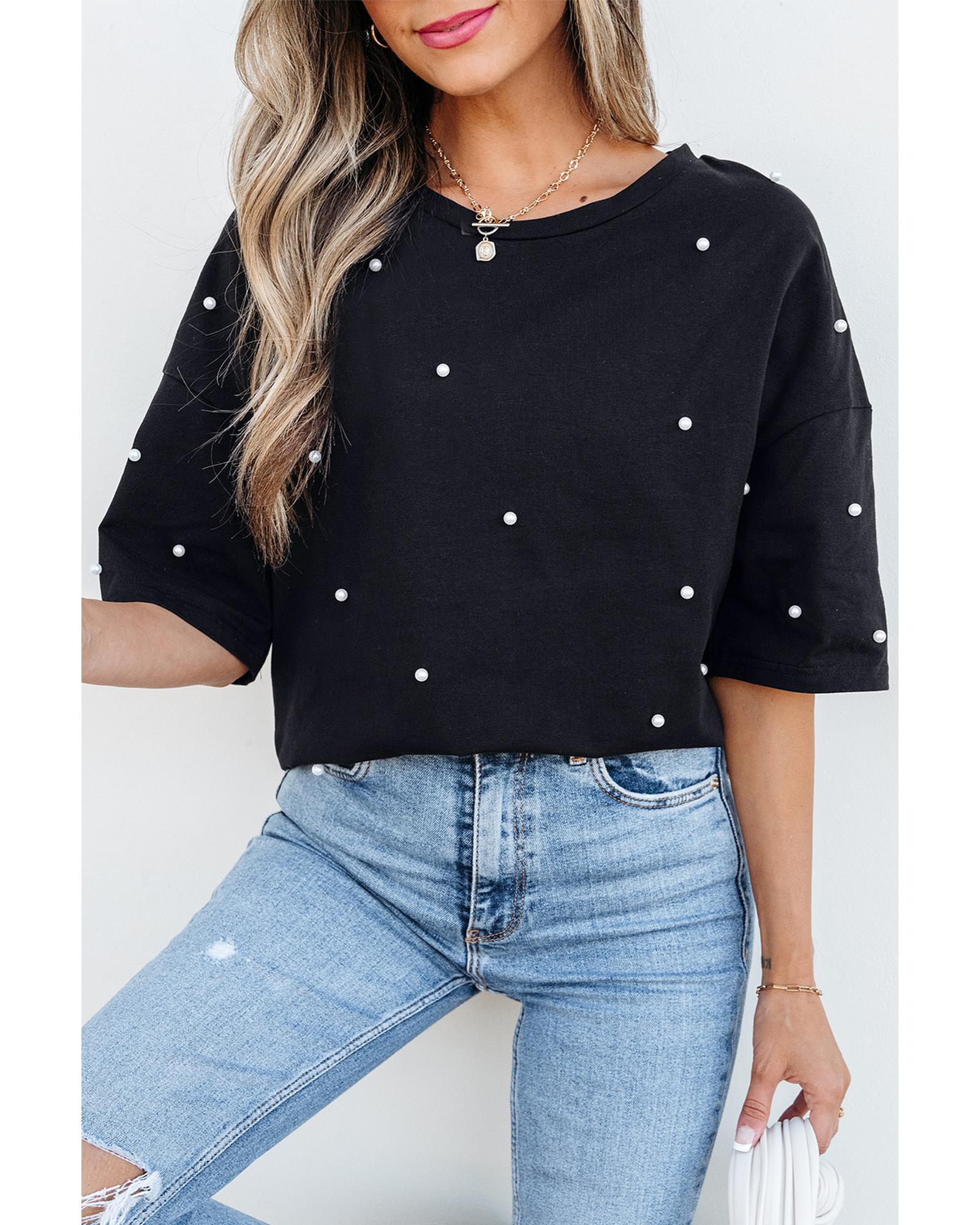 Black Pearl Beaded Drop Shoulder Crewneck T Shirt – S