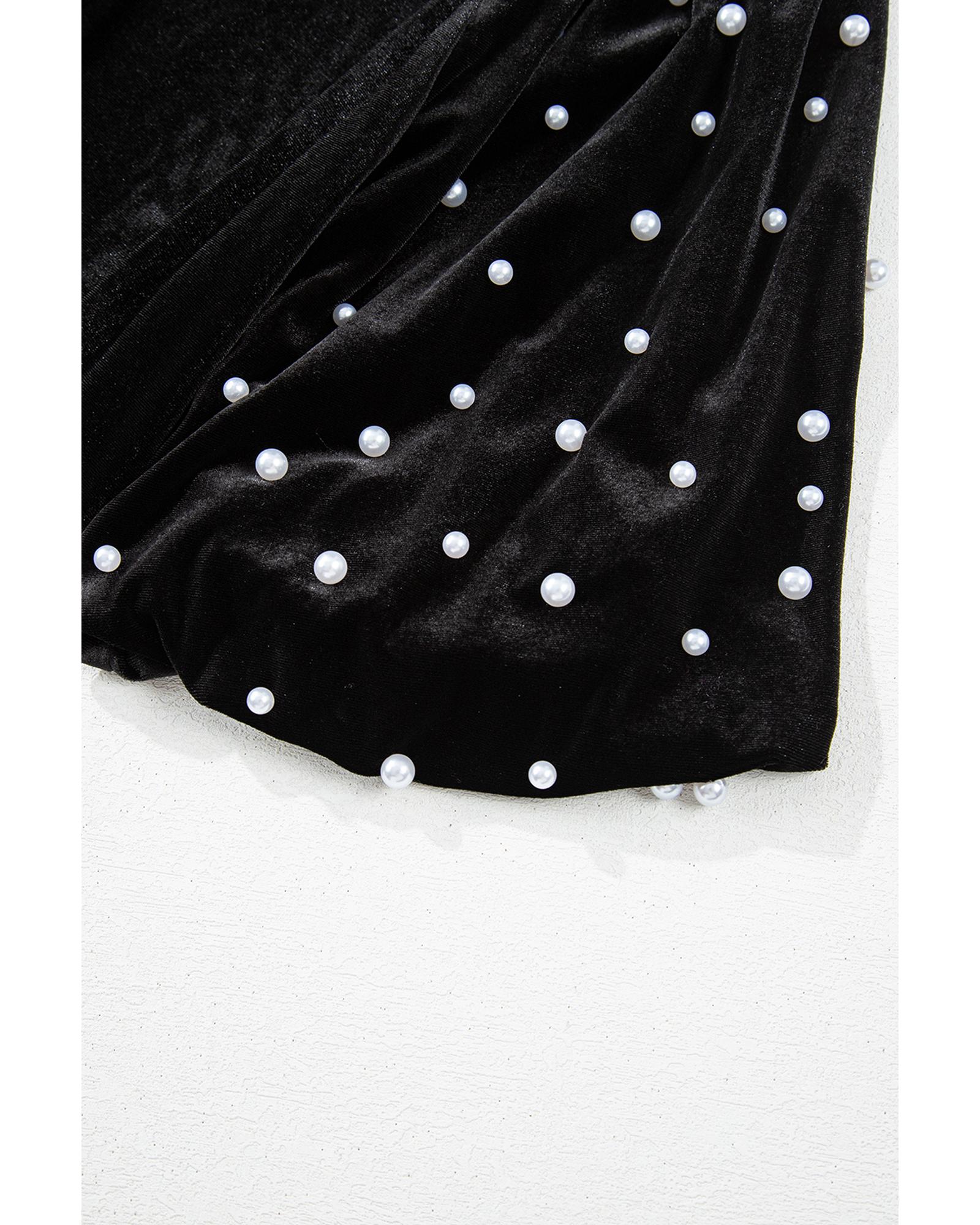 Black Pearl Beaded Half Sleeve Velvet Top – S