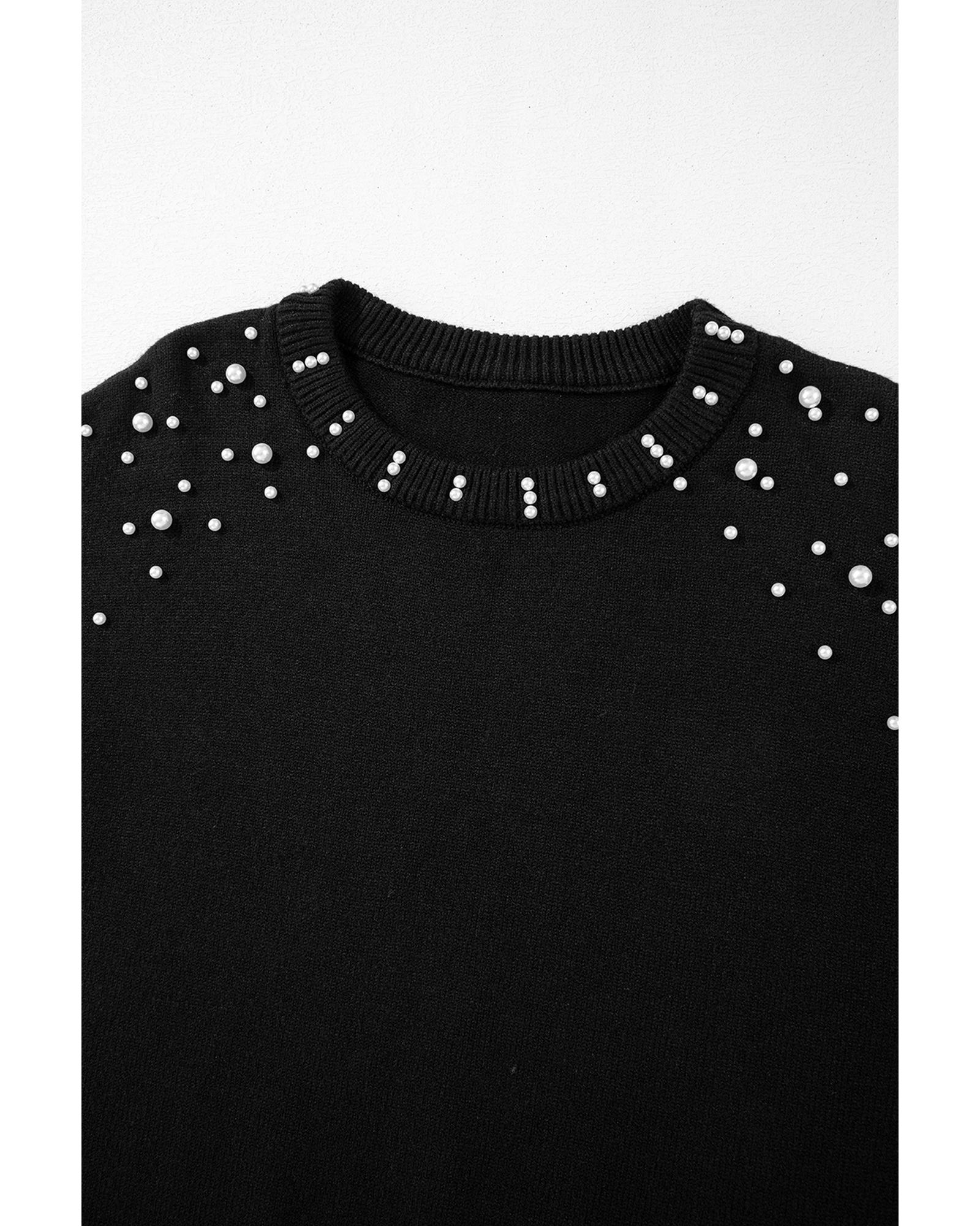 - Luxurious Black Pearled Drop Shoulder Round Neck Sweater