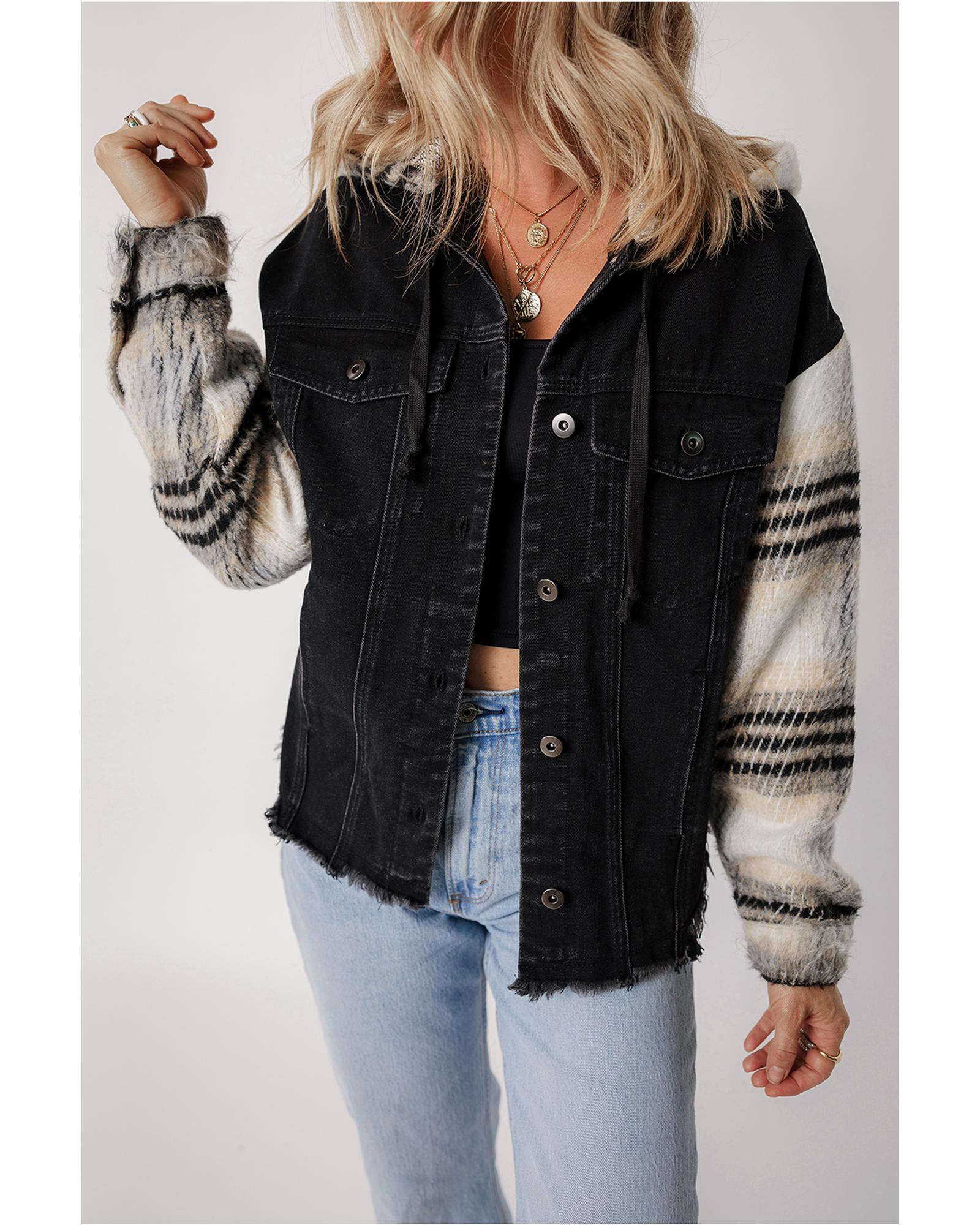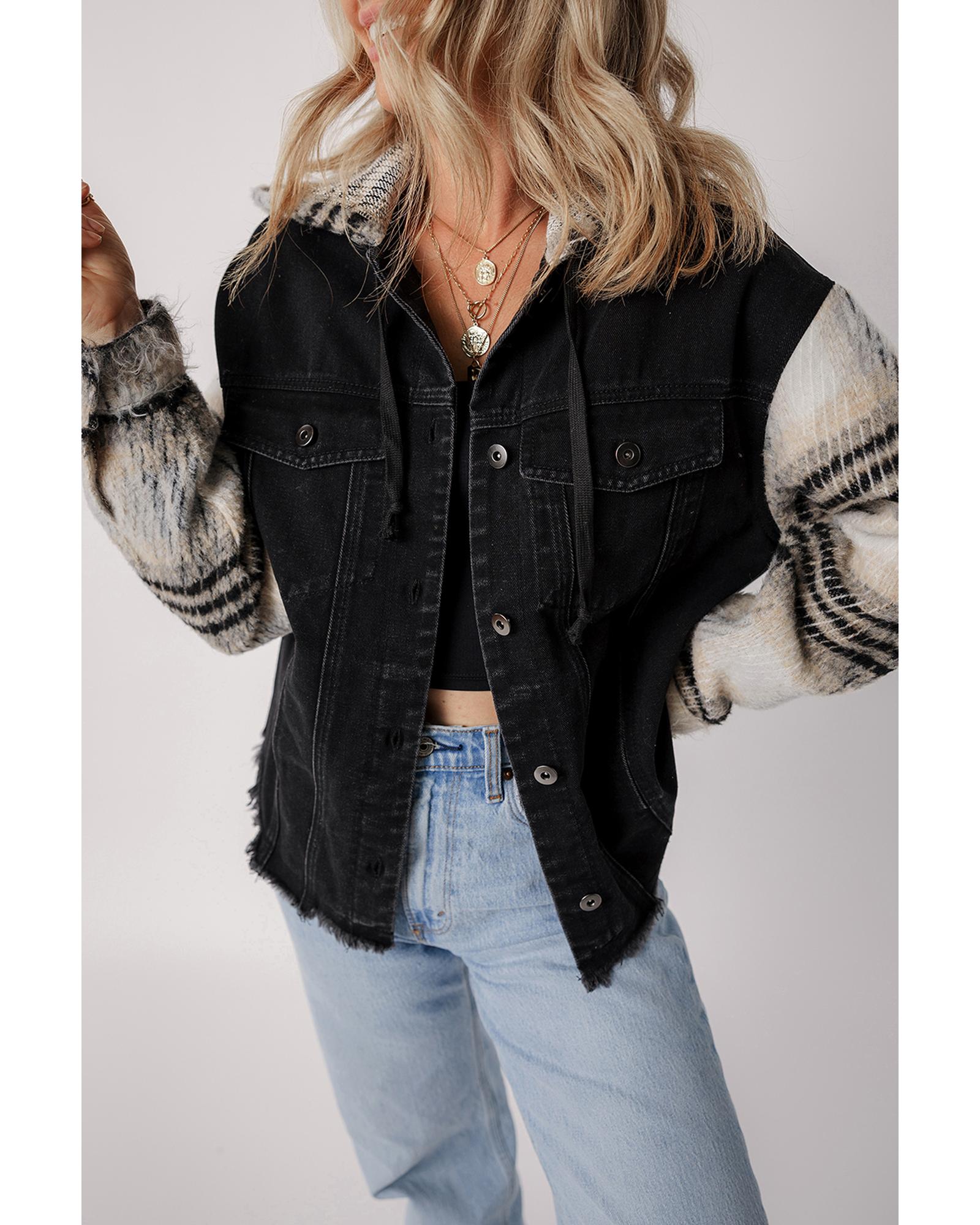 - Black Plaid Sleeve Frayed Hem Hooded Denim Jacket
