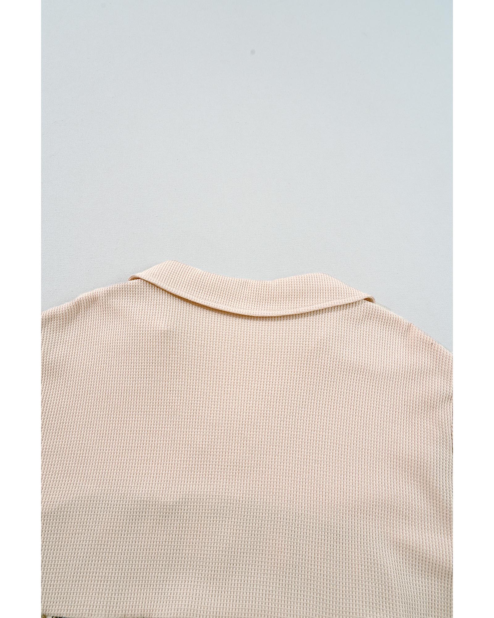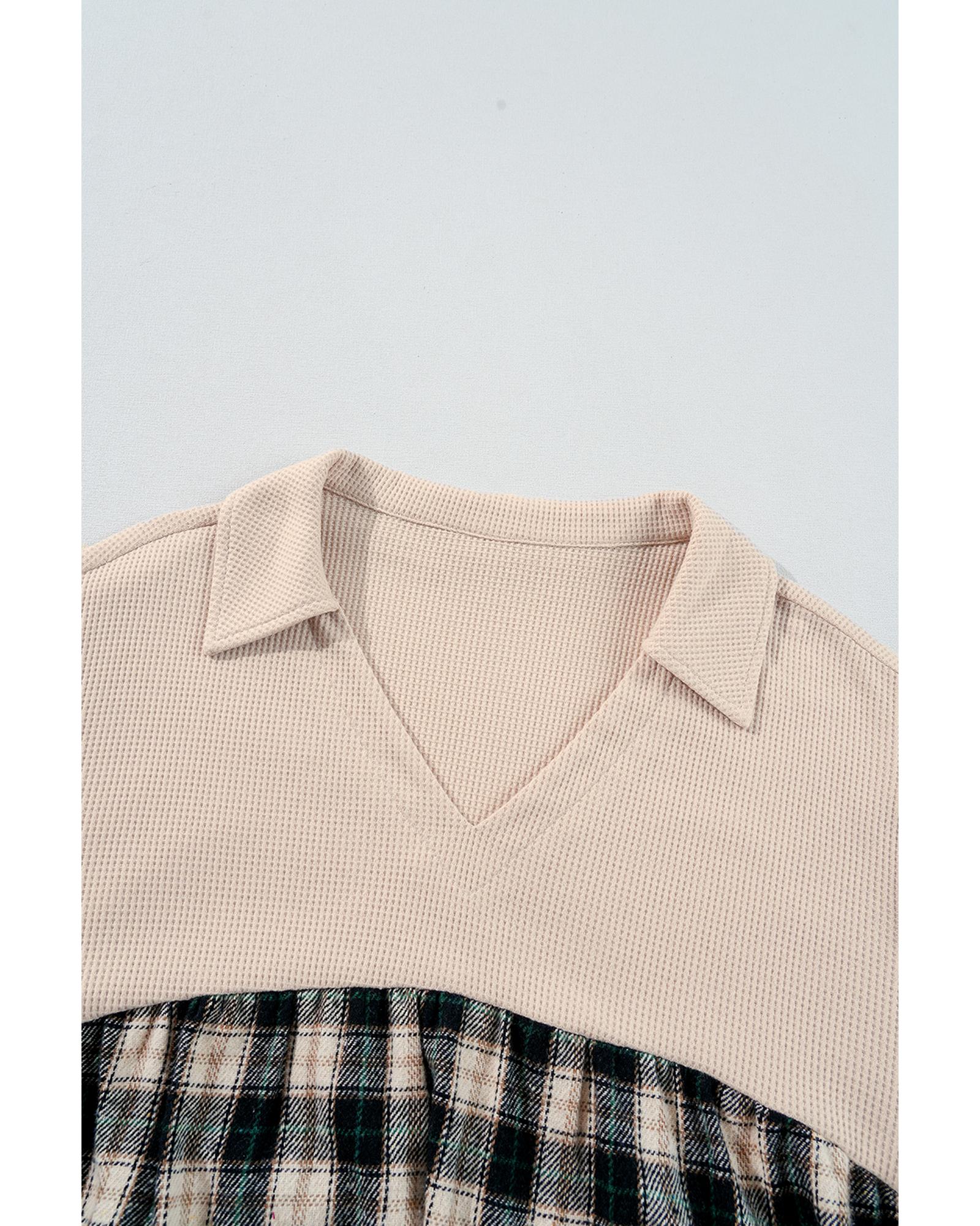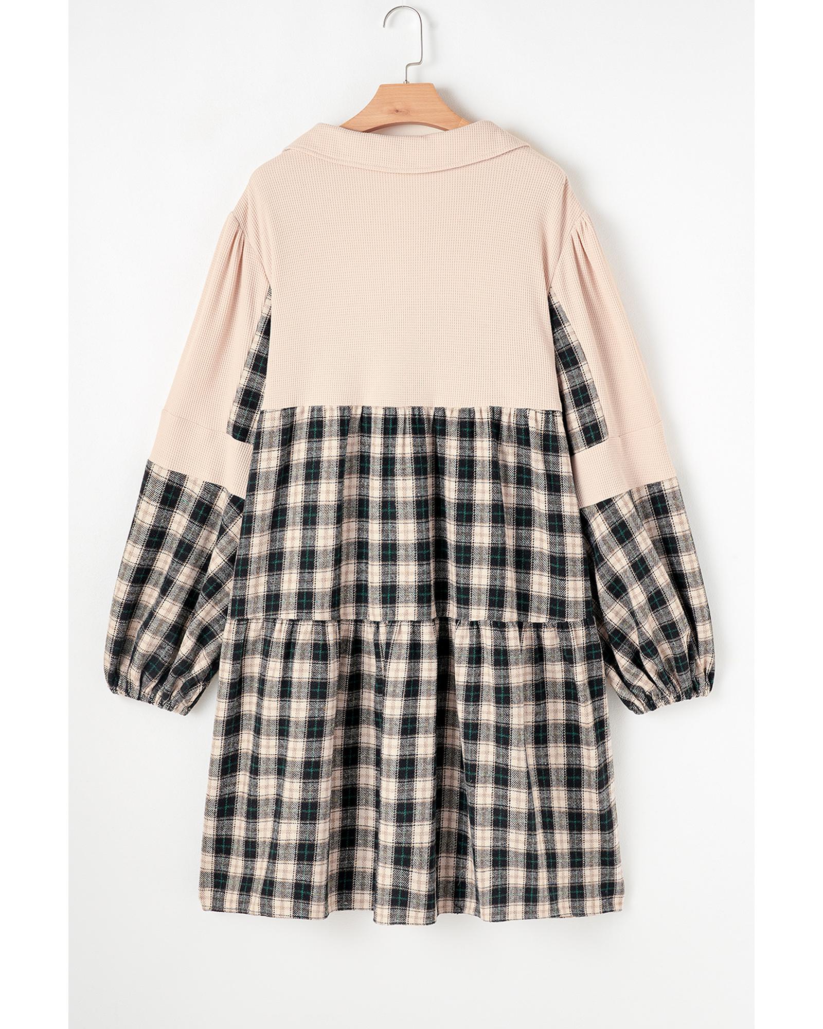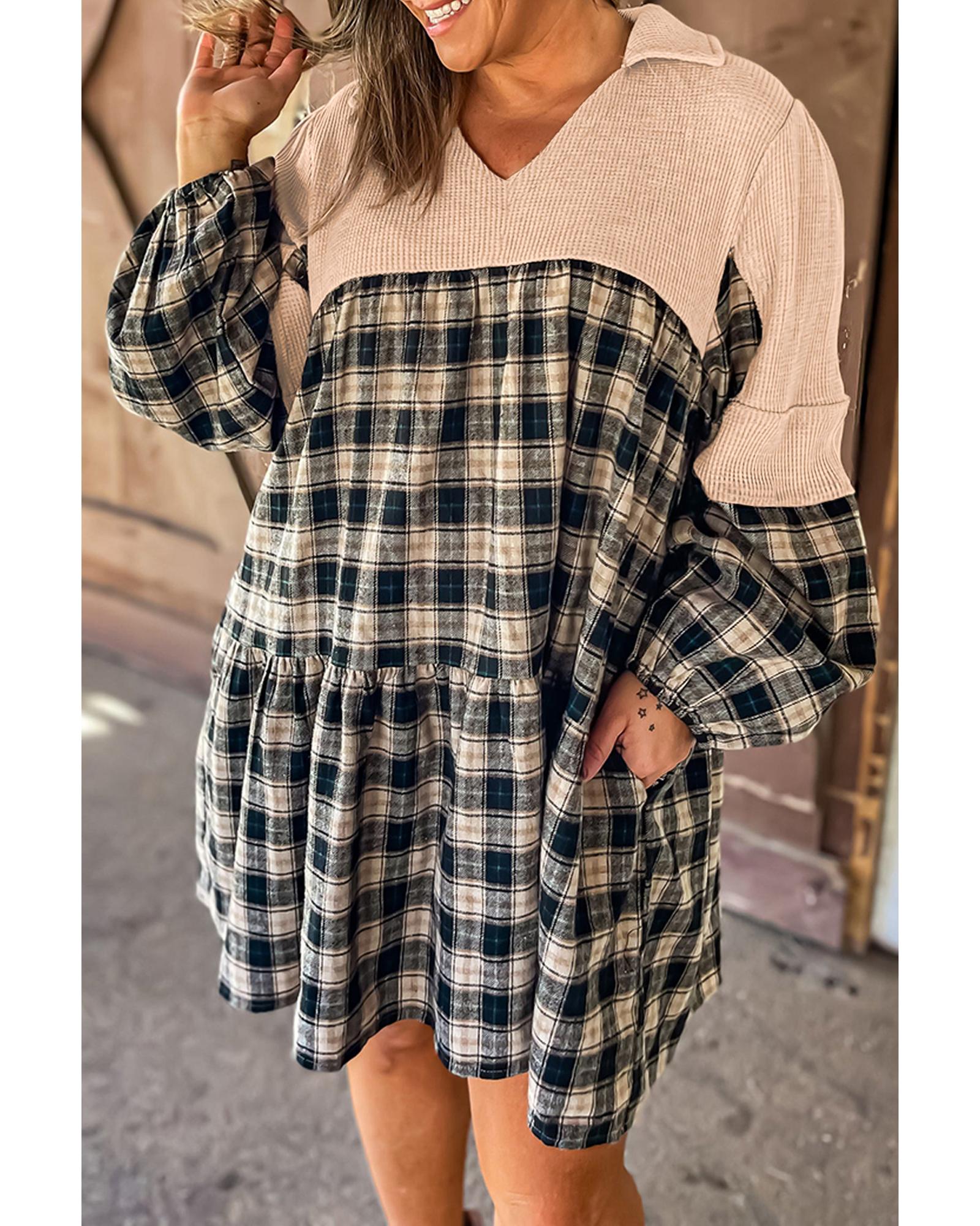 Black Plaid Waffle Knit Patchwork Collared V Neck Plus Size Mini Dress – 1X