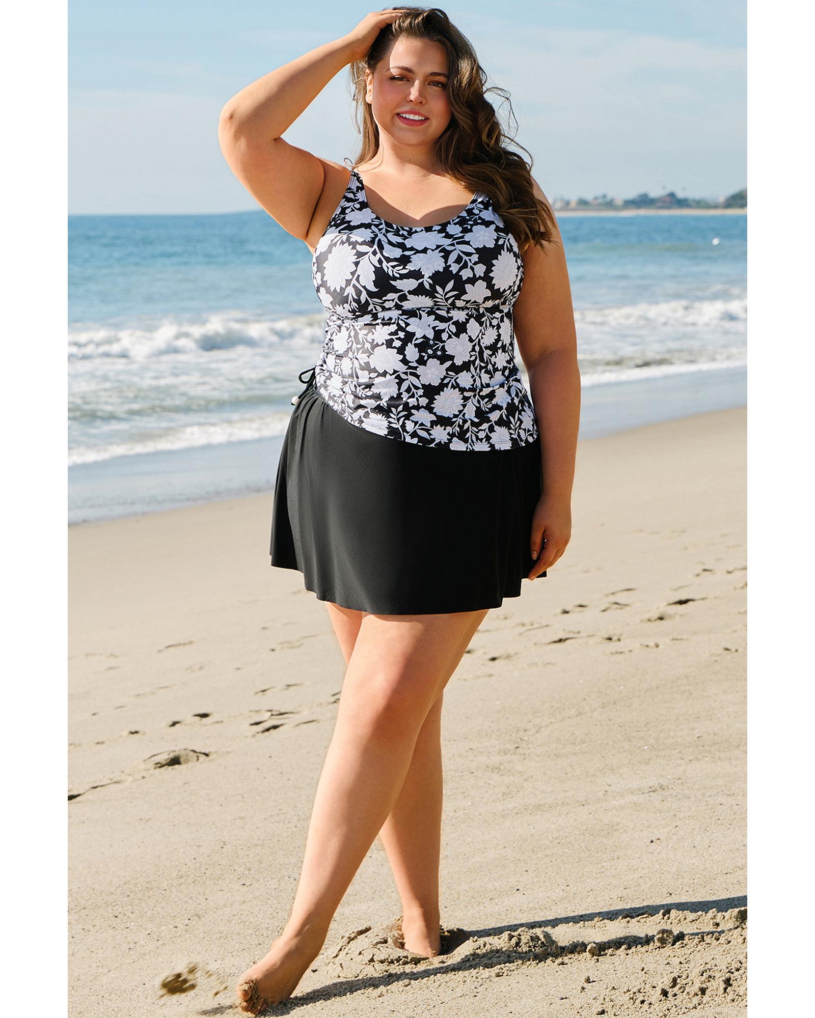 Black Plus Size Printed Square Neck Drawstring Ruffled Tankini Set – 4X
