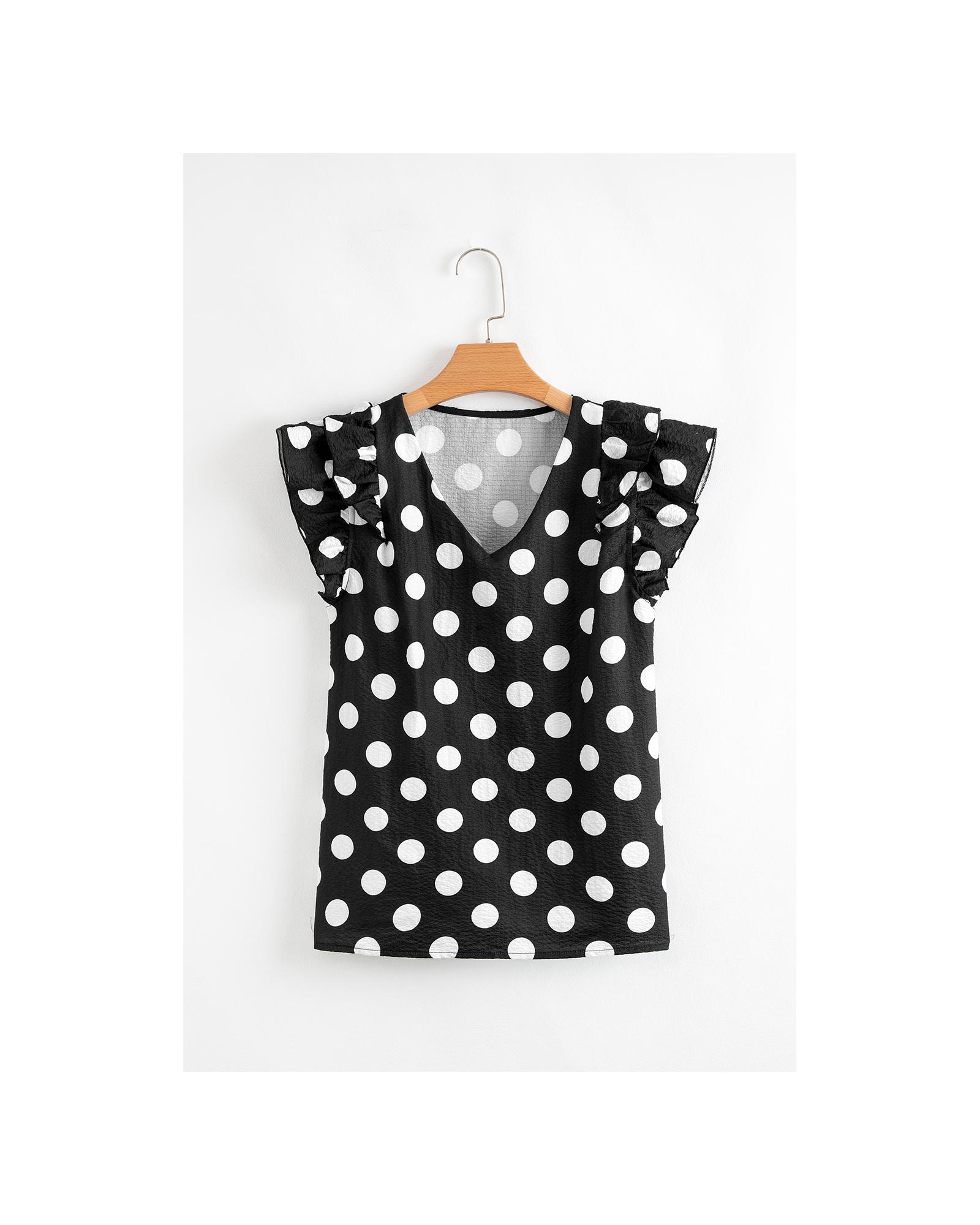 Black Polka Dot Print Ruffled Sleeve V Neck Blouse – XL