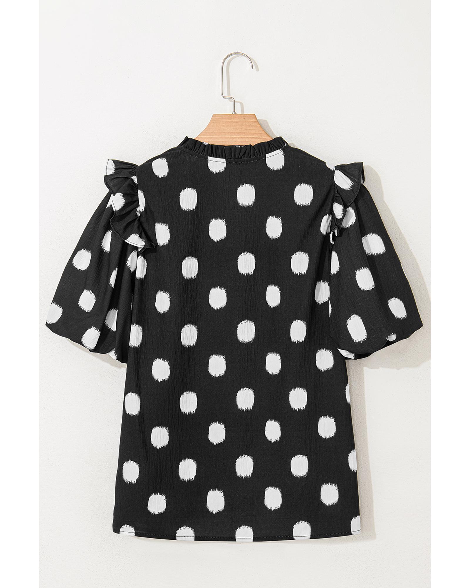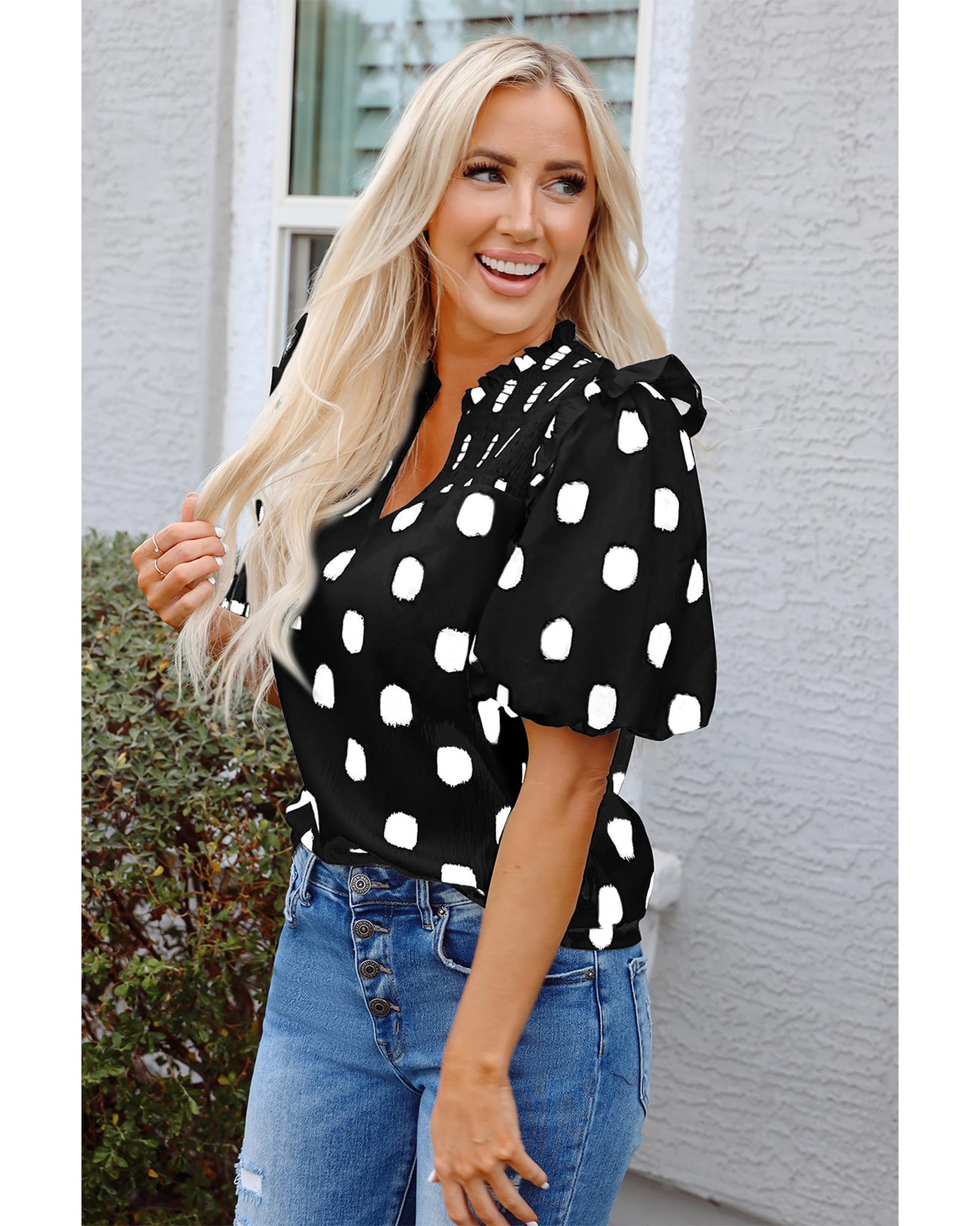 Black Polka Dot Print Shirred Yoke Notched Neck Balloon Sleeve Blouse – XL