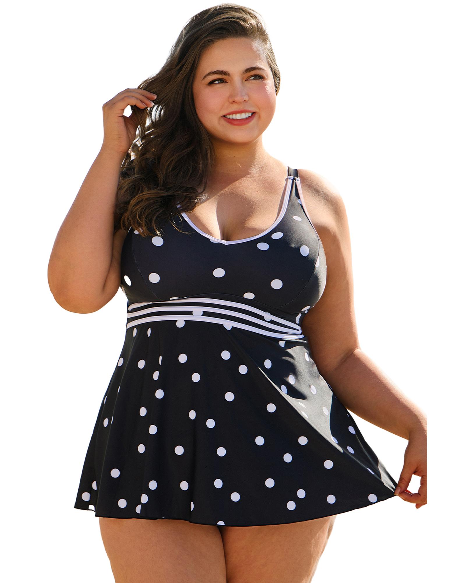 Black Polka Dot Trim V Neck Plus Size Swim Dress – 2X