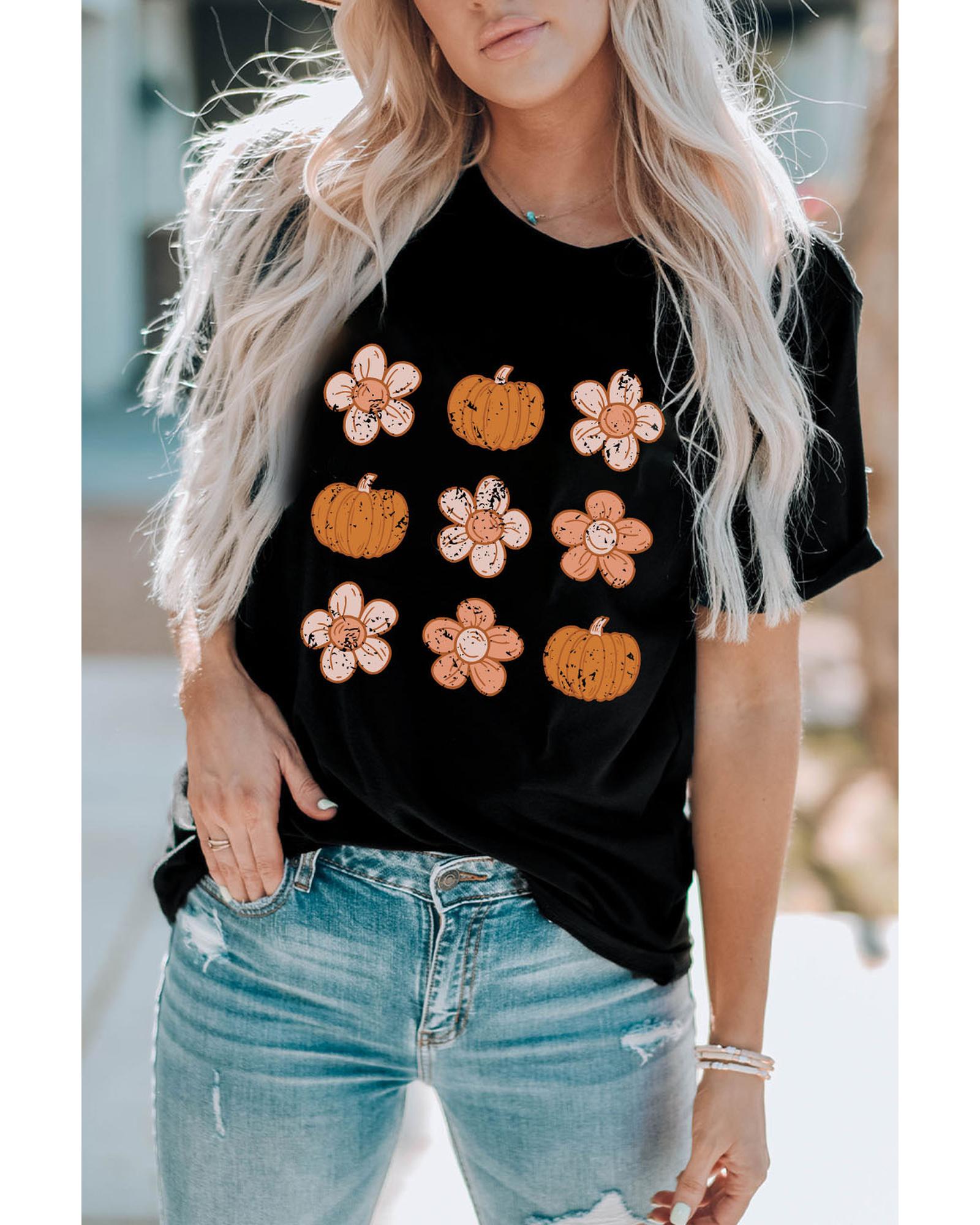 Stylish and trendy Black Pumpkin Flower Print Short Sleeve Graphic Top Made with high