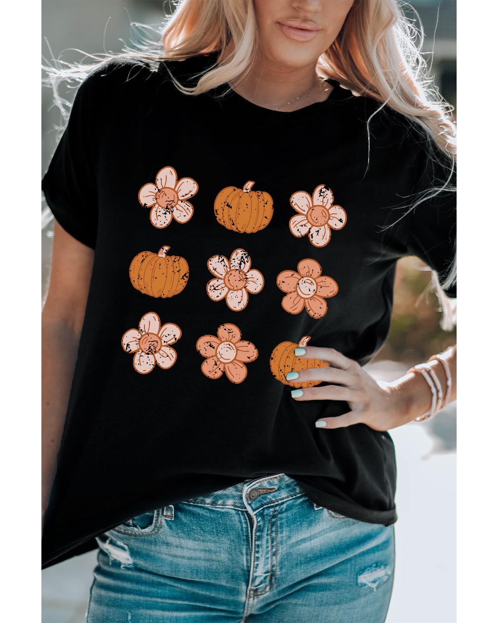Stylish and trendy Black Pumpkin Flower Print Short Sleeve Graphic Top Made with high