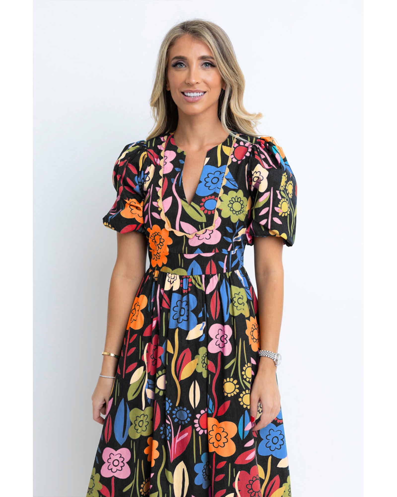 Black Retro Floral Printed Split Neck Maxi Dress – M