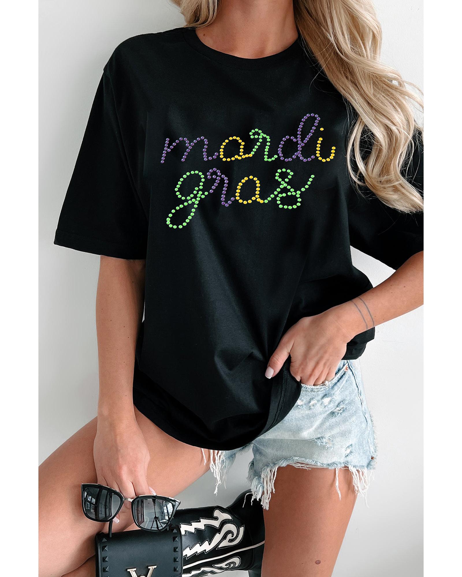 Black Rhinestone Mardi Gras Letter Graphic T Shirt – L