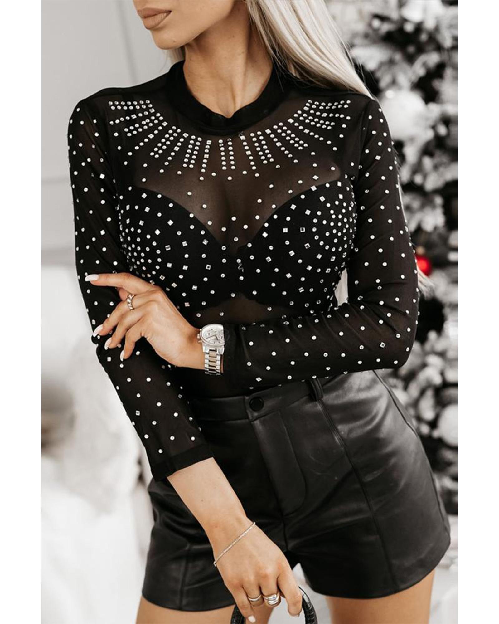 Black Rhinestone Sheer Mesh Long Sleeve Bodysuit – S