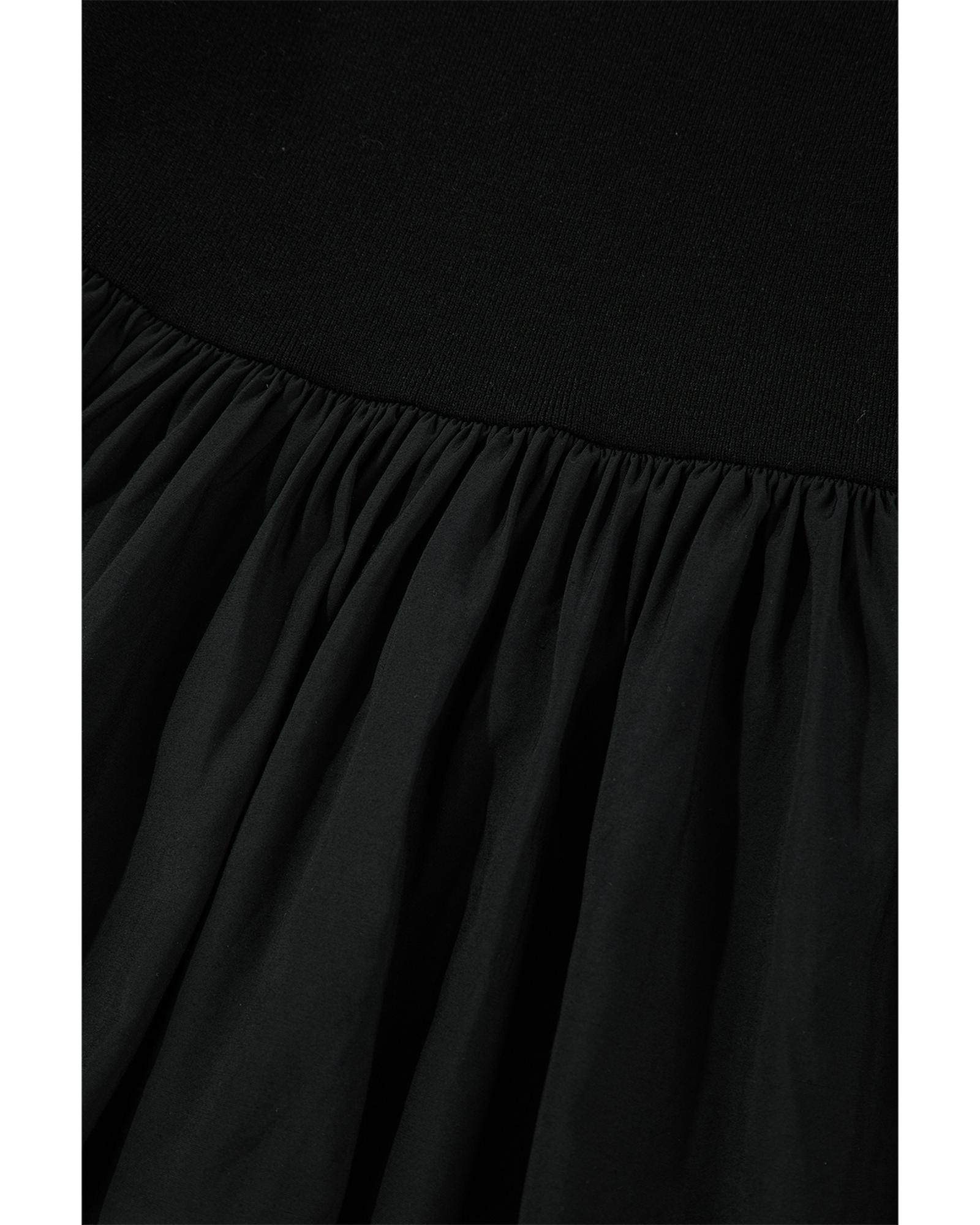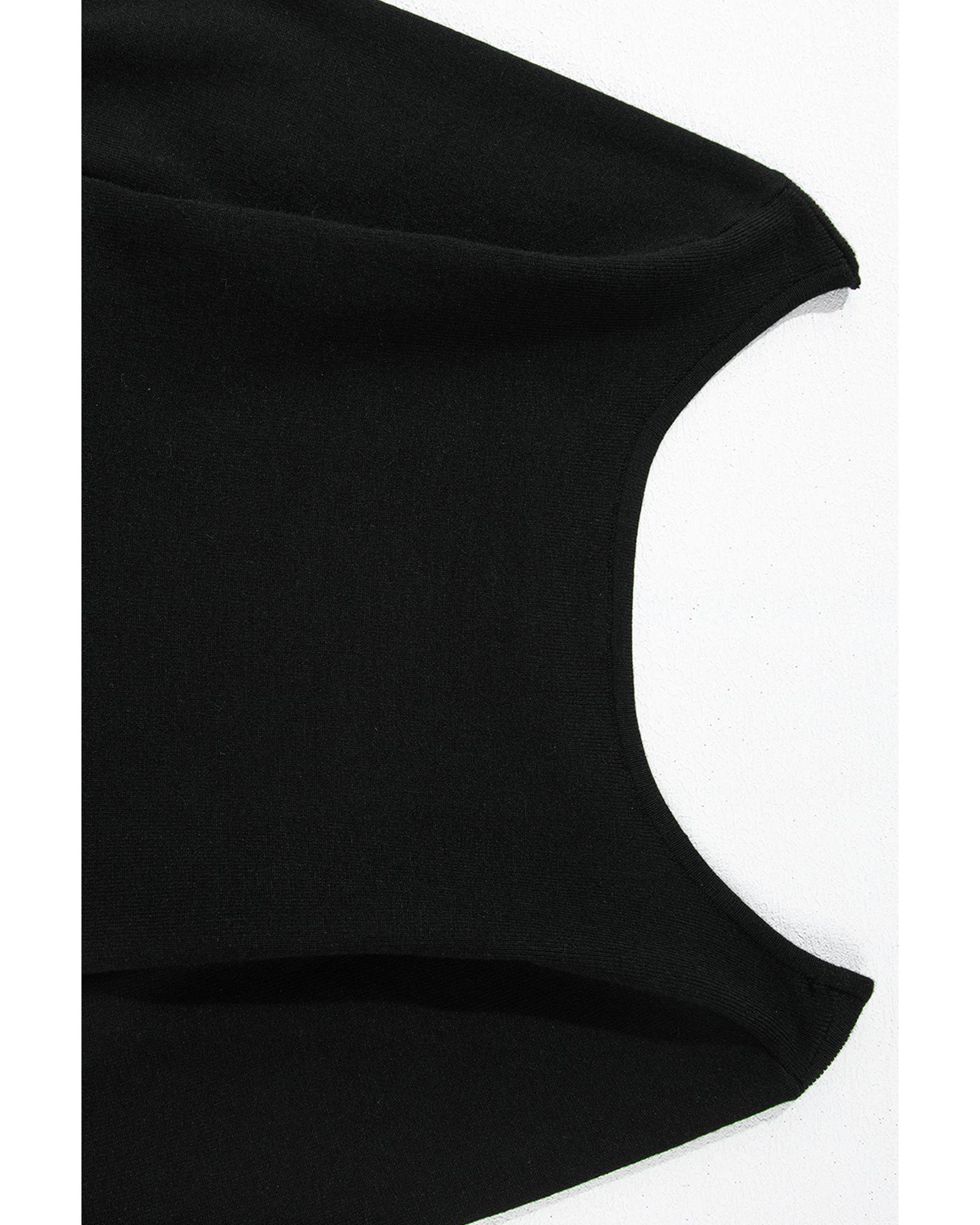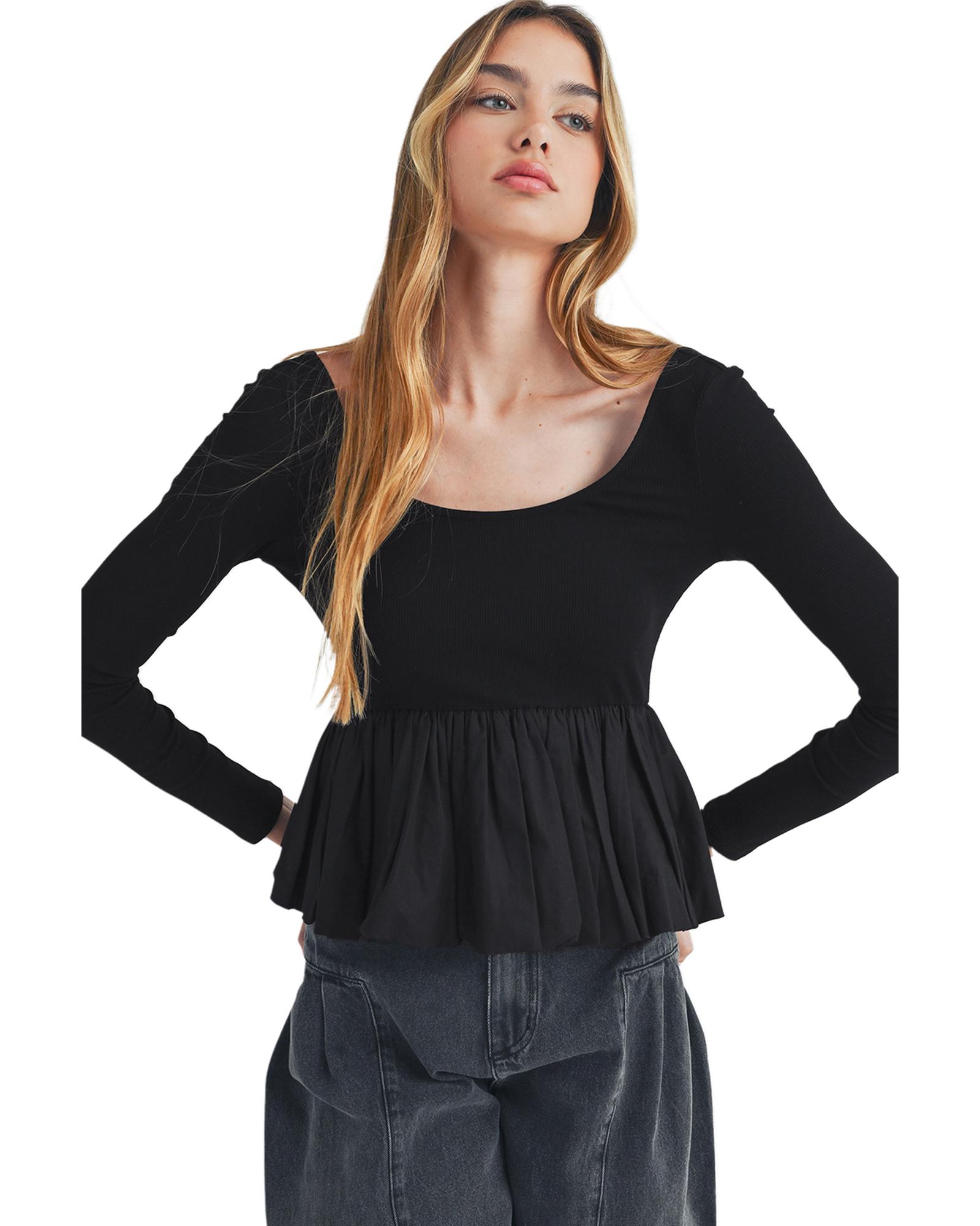 Black Ribbed Knit Long Sleeve Scoop Neck Peplum Patchwork Top – L