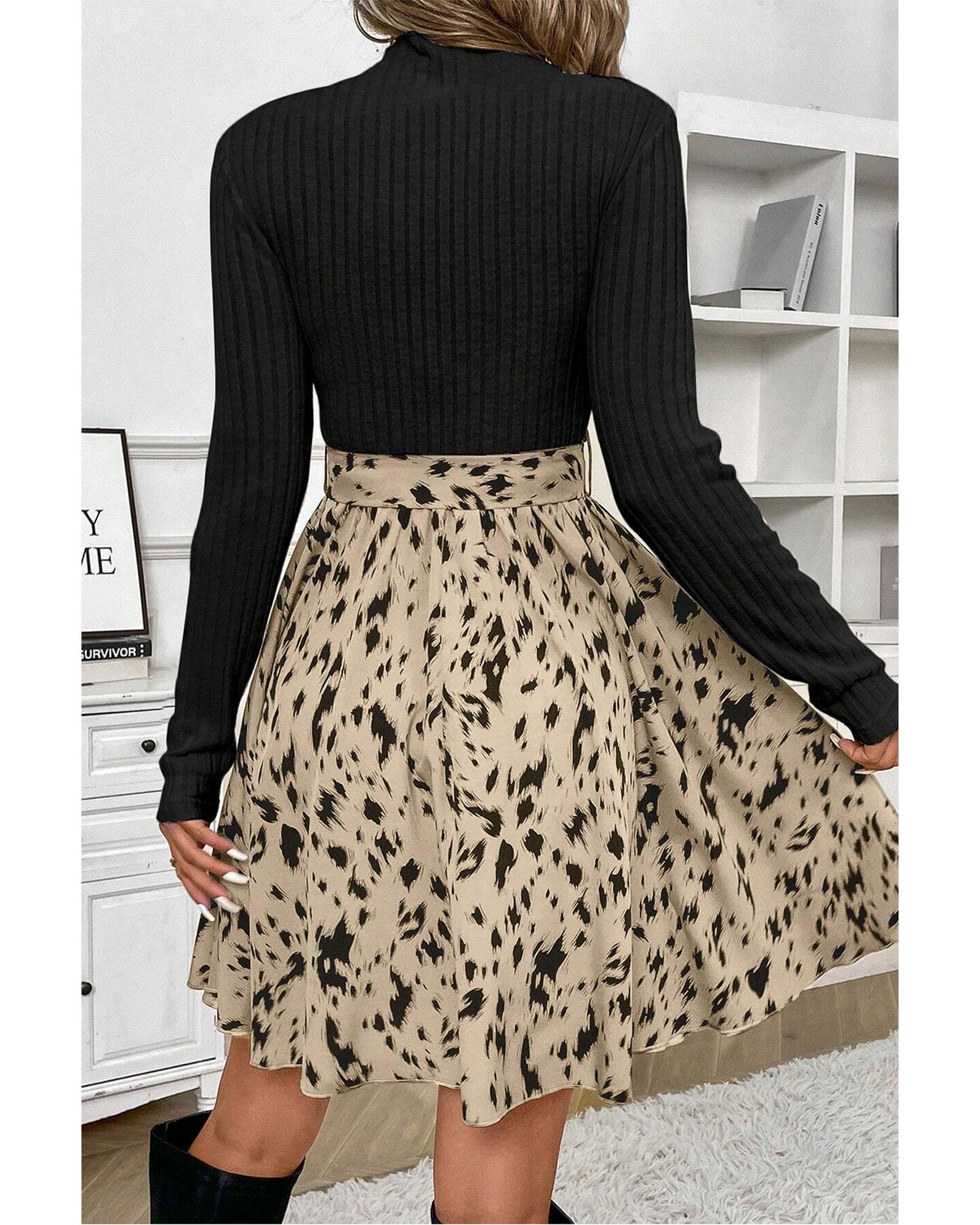 Black Ribbed Knit Patchwork Printed Belted A-line Dress – S