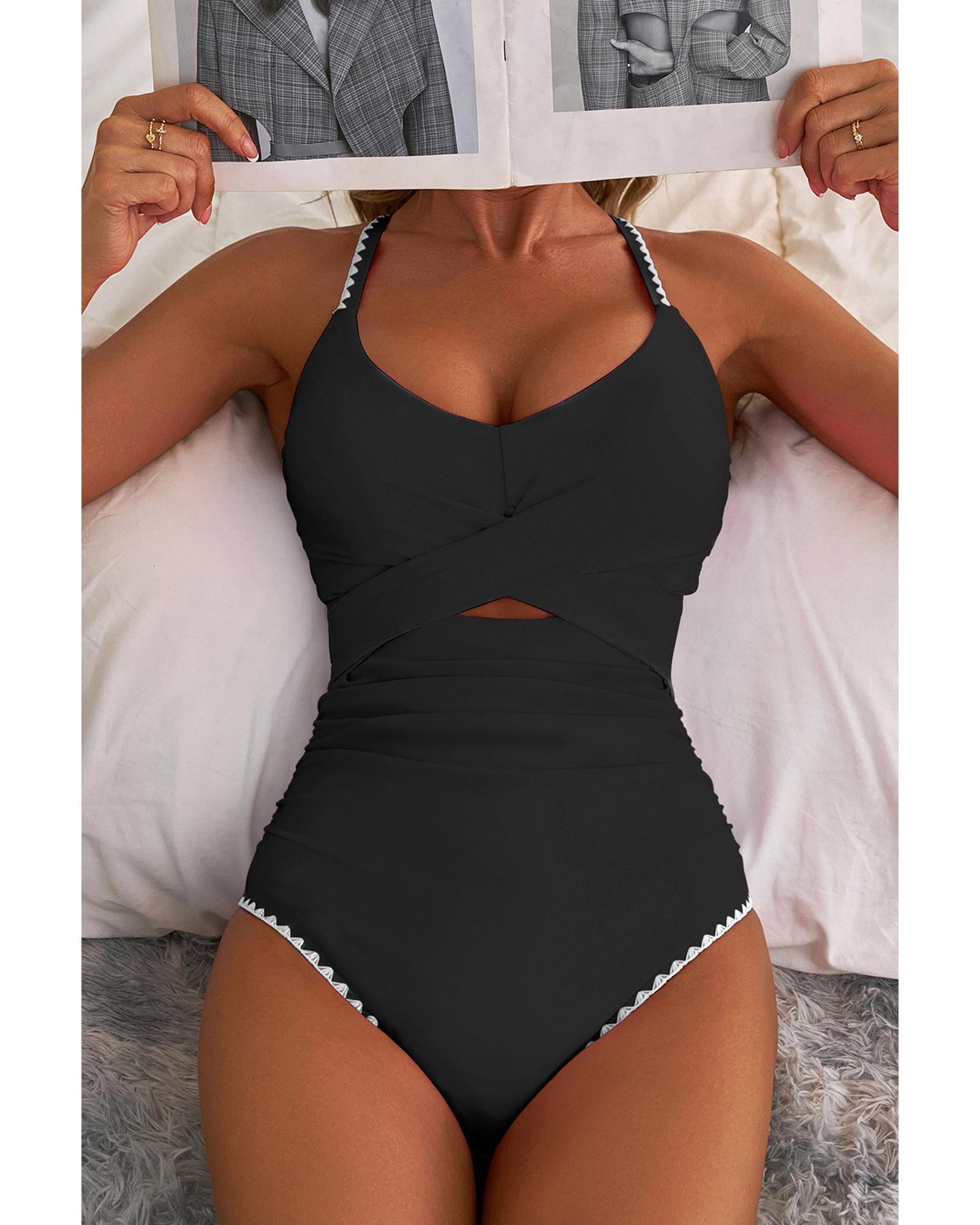 Black Ric Rac Trim Contrasted Patchwork Cutout One Piece Swimsuit – S