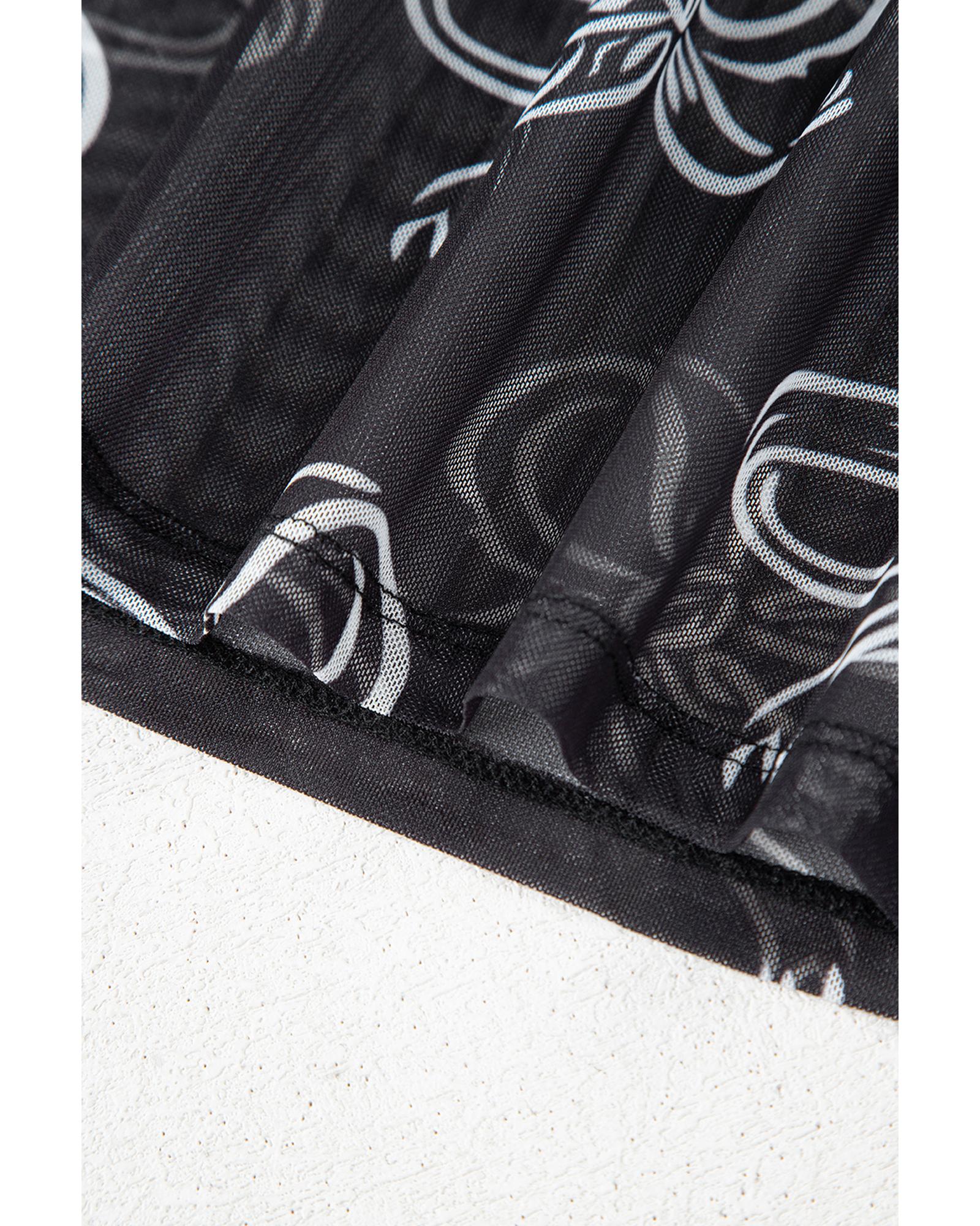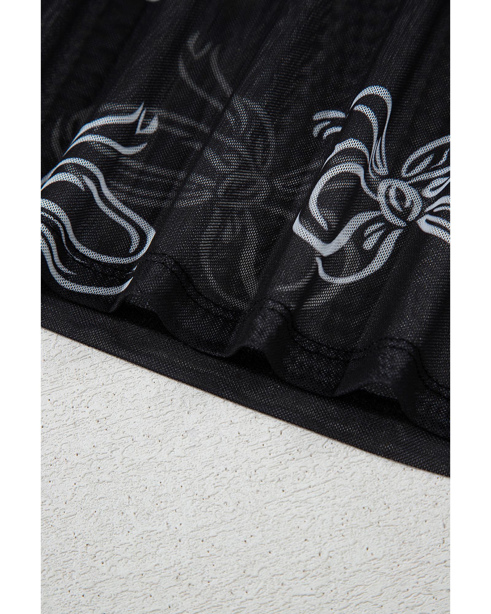 Black Round Neck Bow Print Long Sleeve Mesh Top – L