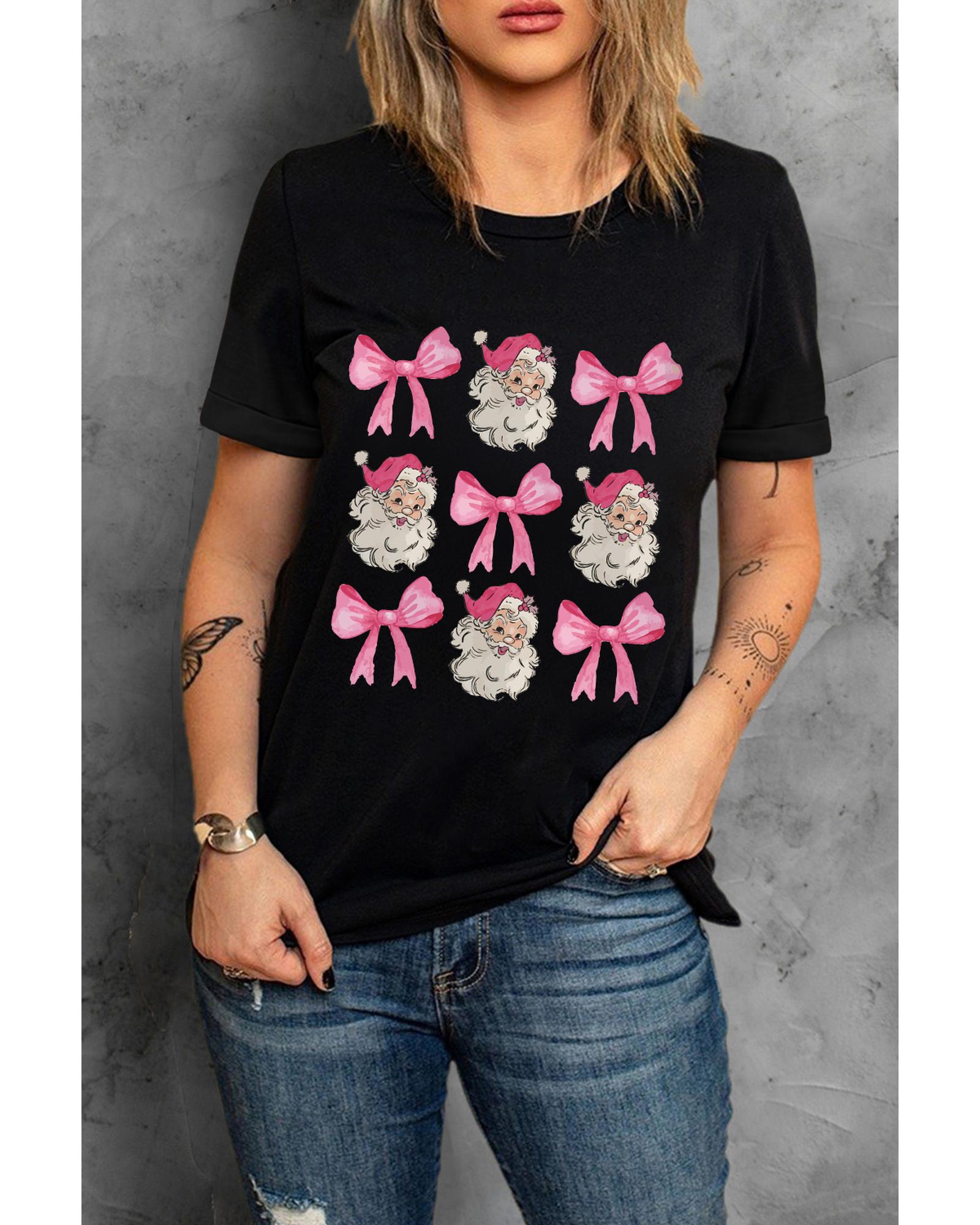 - Festive Black Santa Claus Bow Knot Christmas Graphic T Shirt