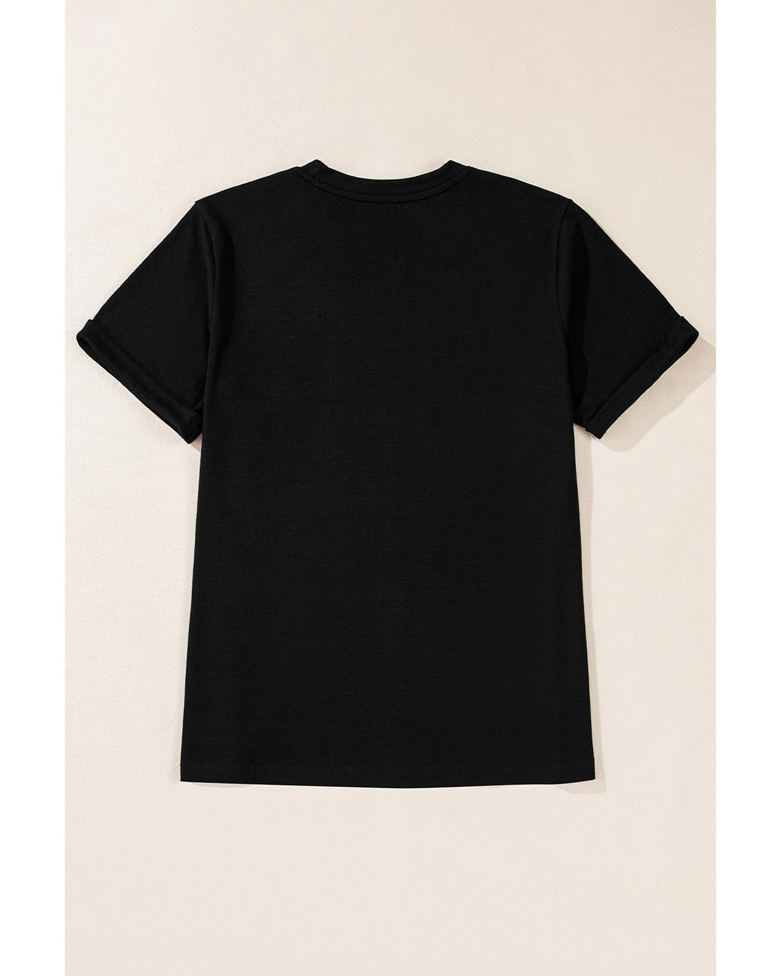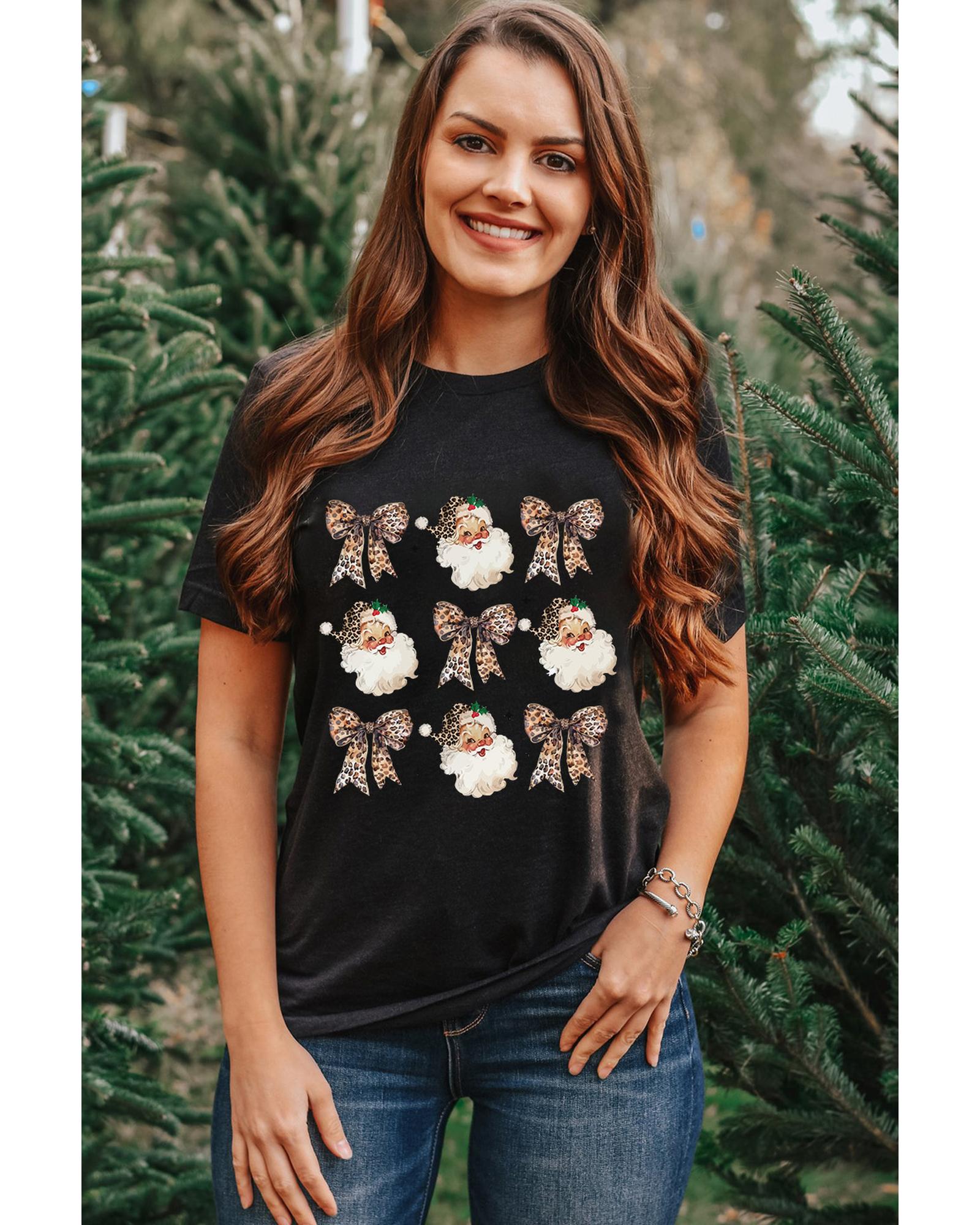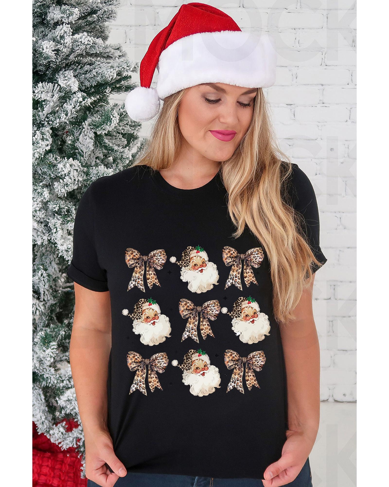 Black Santa Claus Leopard Bow Print Crew Neck Casual T Shirt – L
