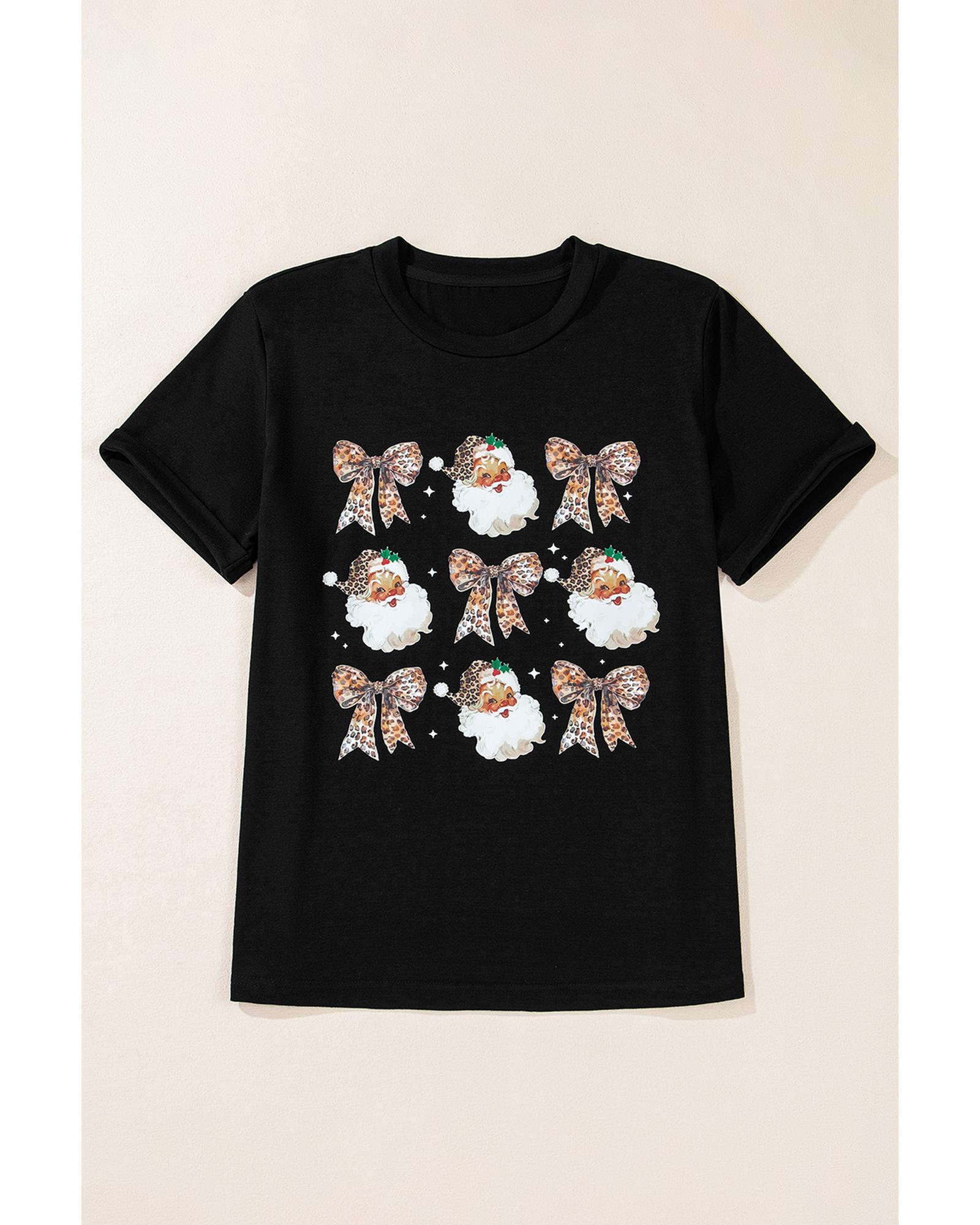 Black Santa Claus Leopard Bow Print Crew Neck Casual T Shirt – XL