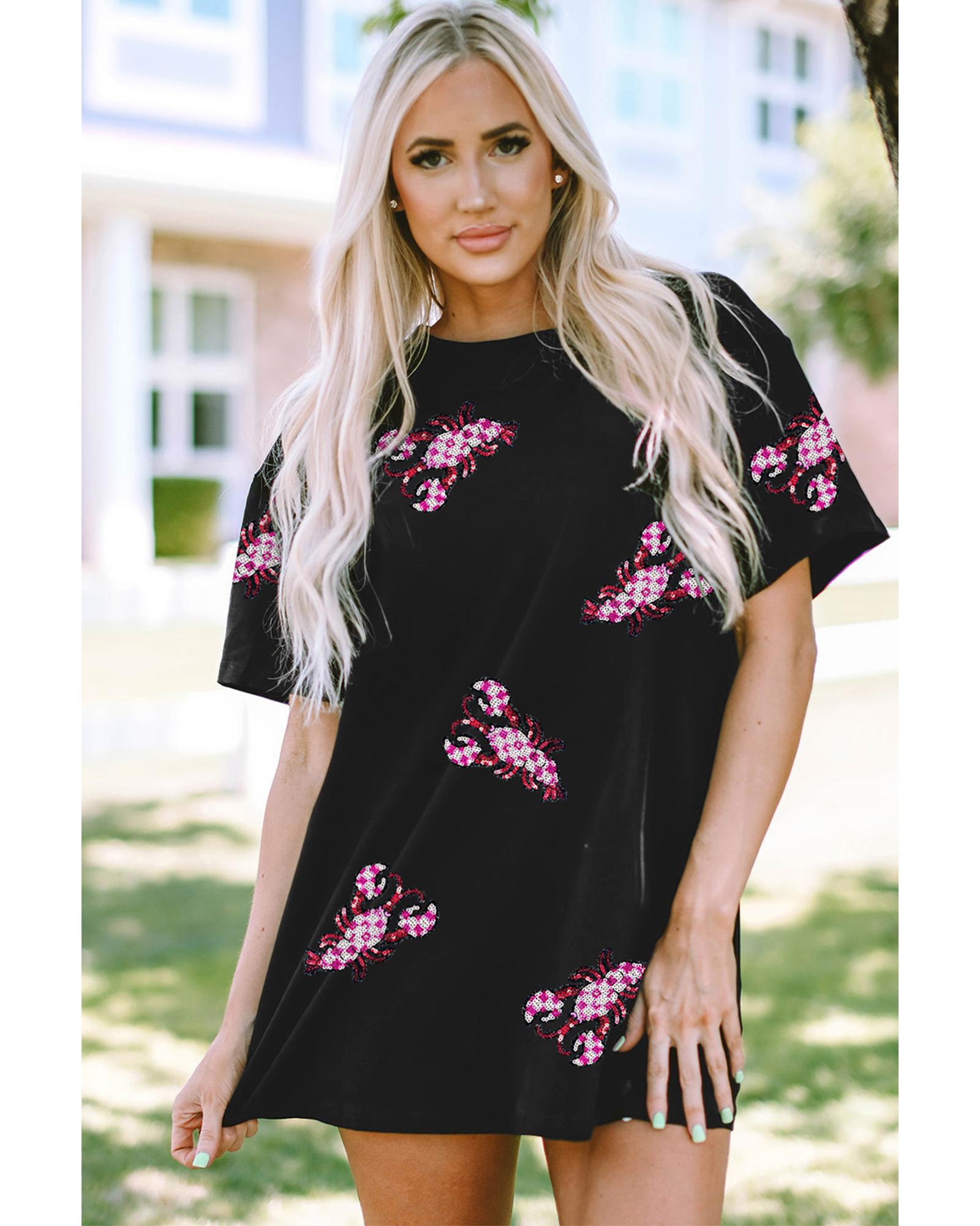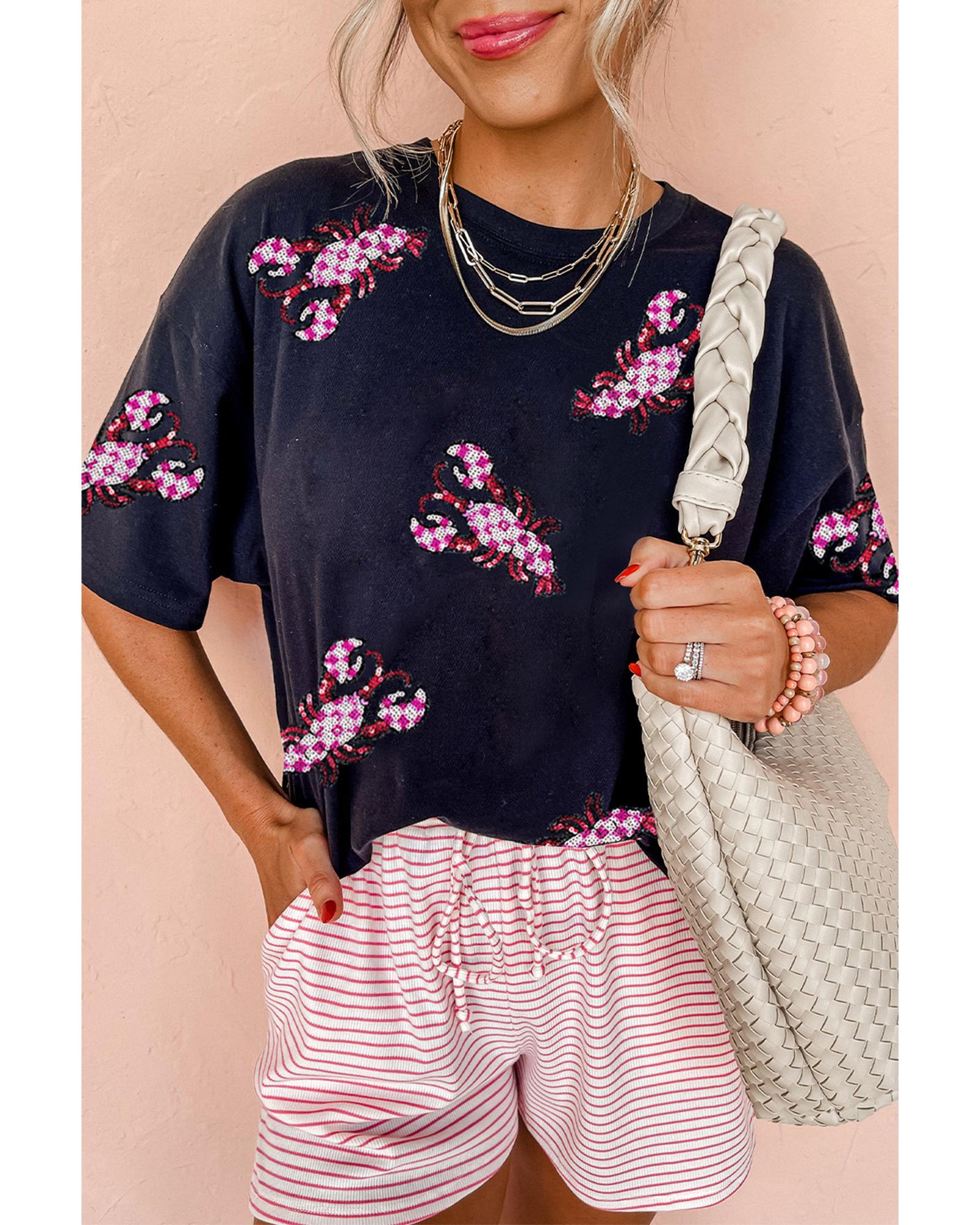 • Black Sequin Crawfish Patched Crew Neck Tee