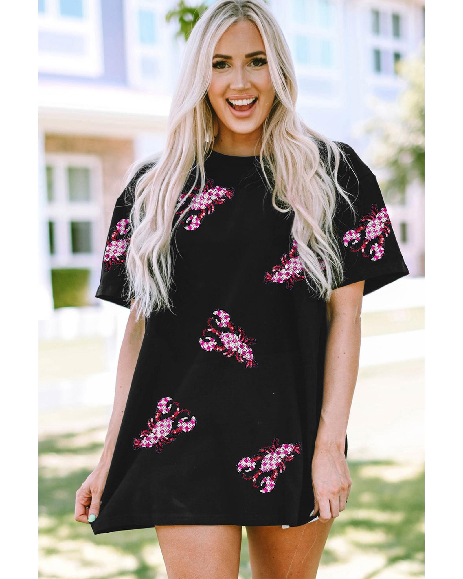 - Black Sequin Crawfish Patched Crew Neck Tee