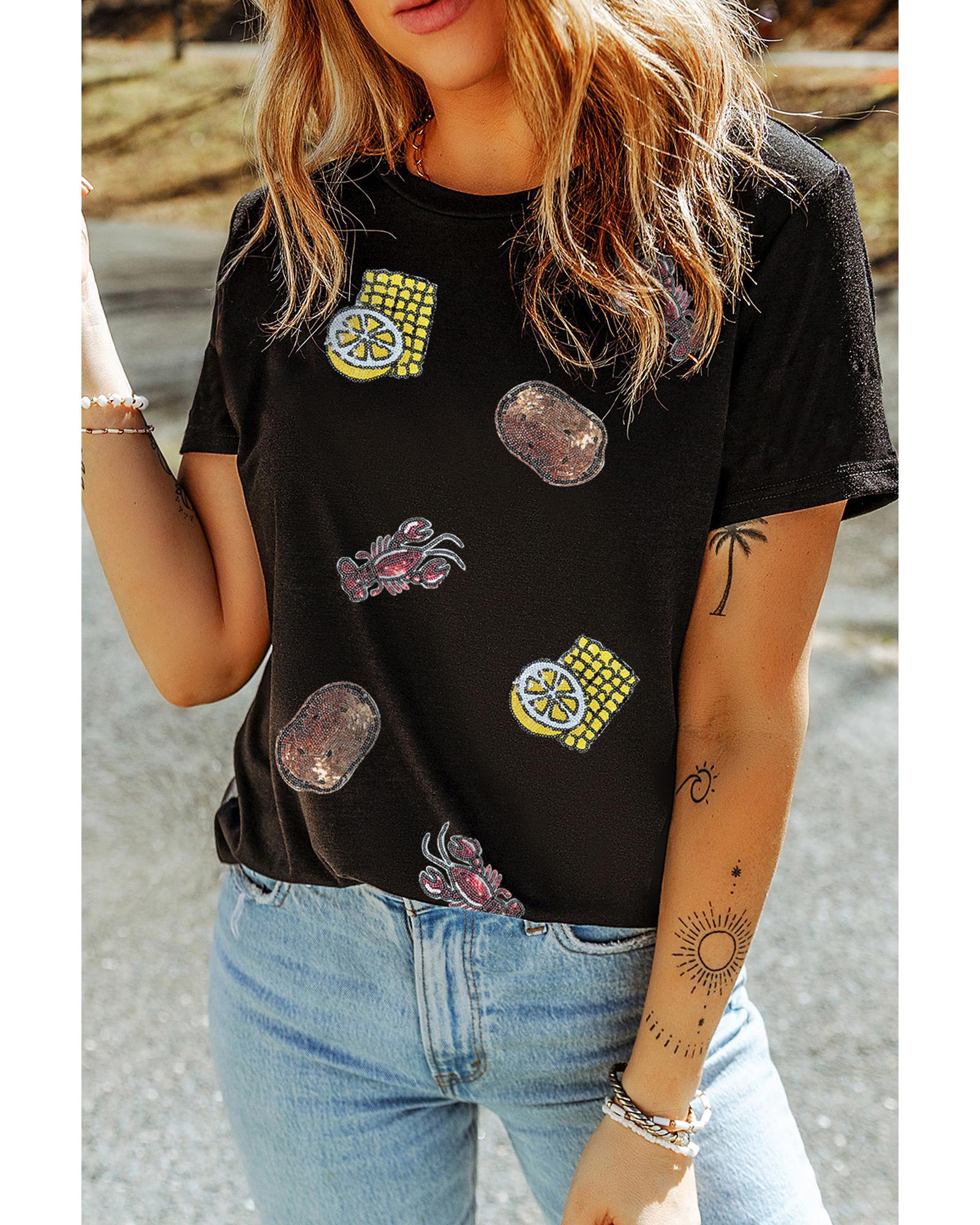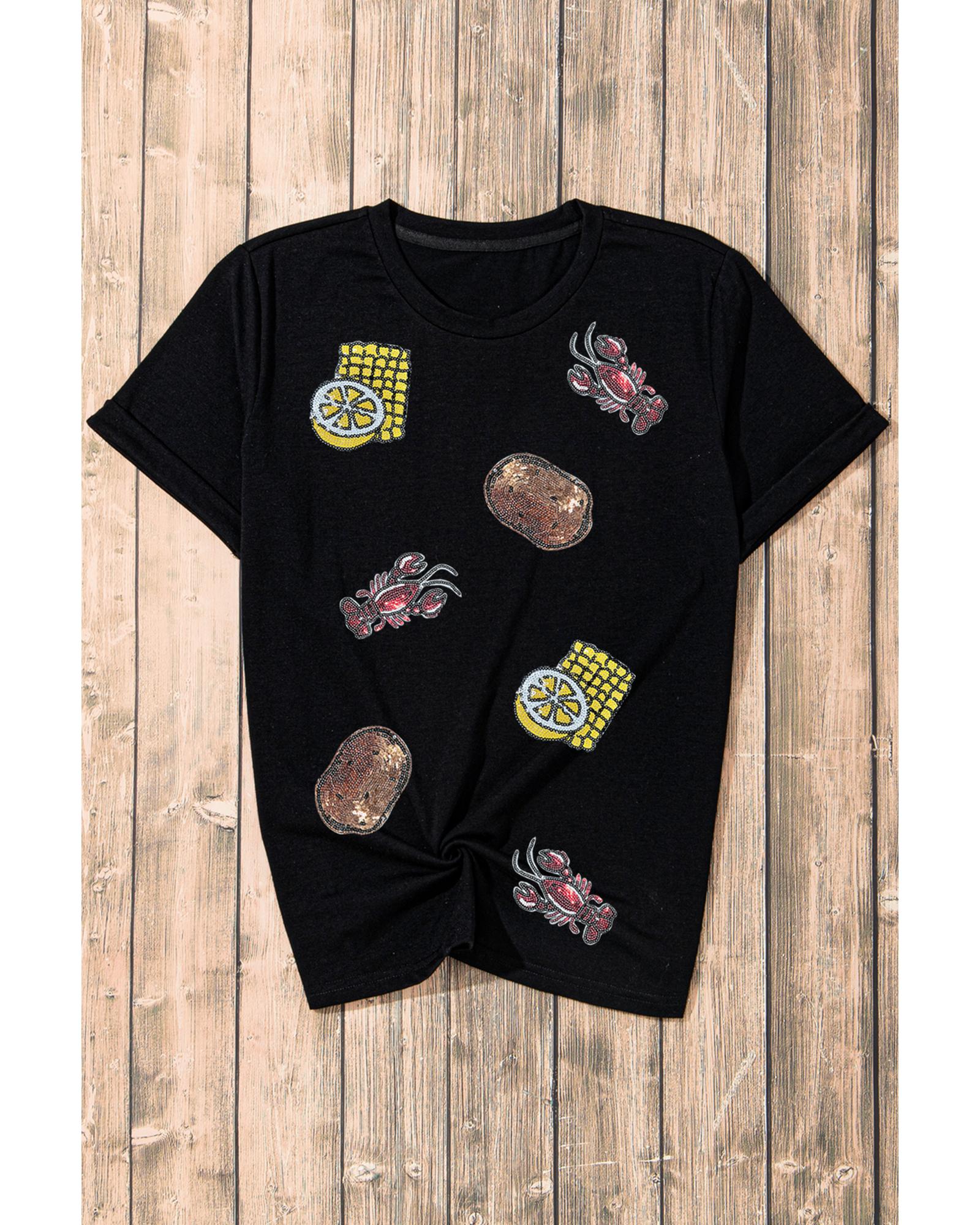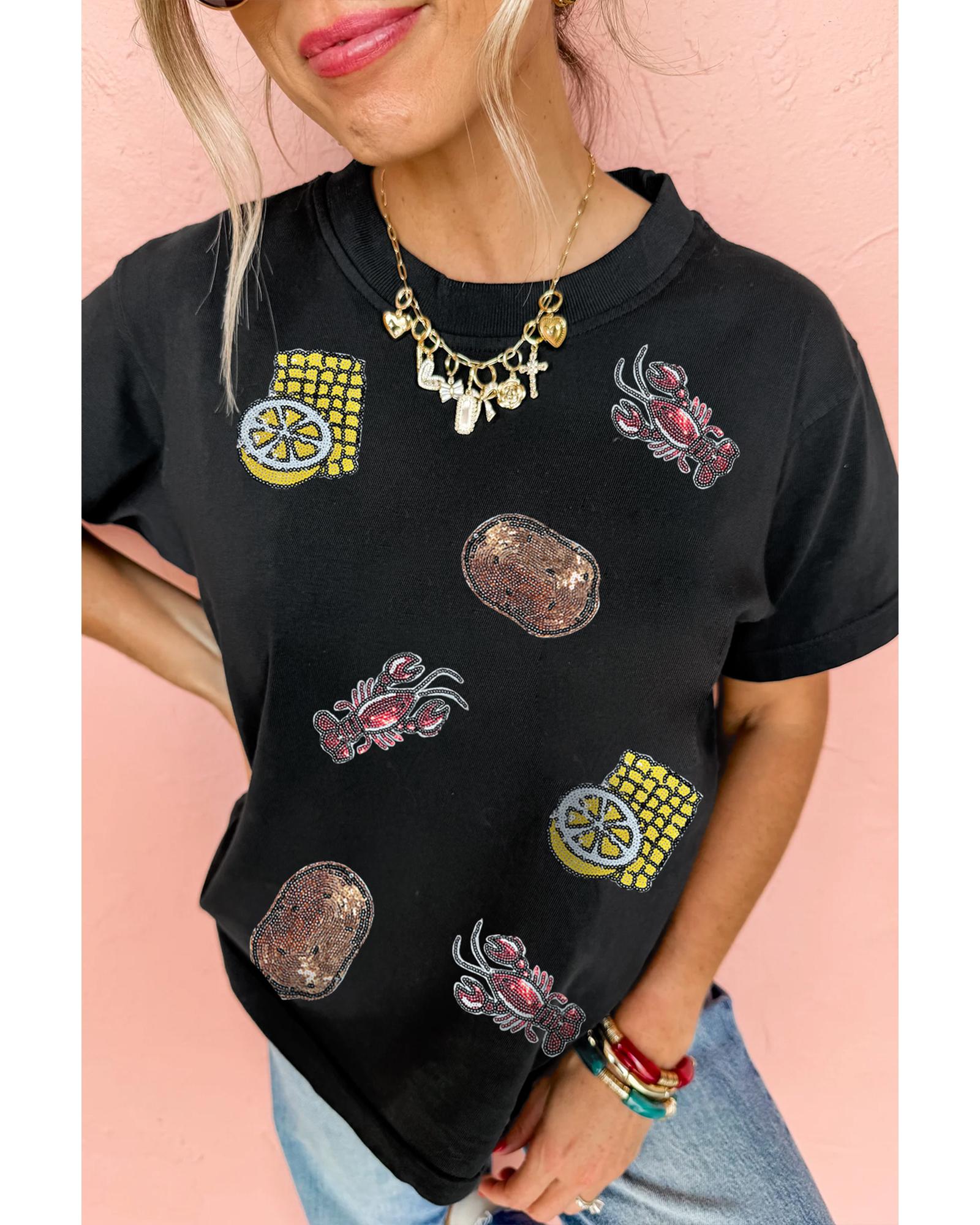 Black Sequin Crawfish Potato Lemon Corn Graphic Crewneck T Shirt – S