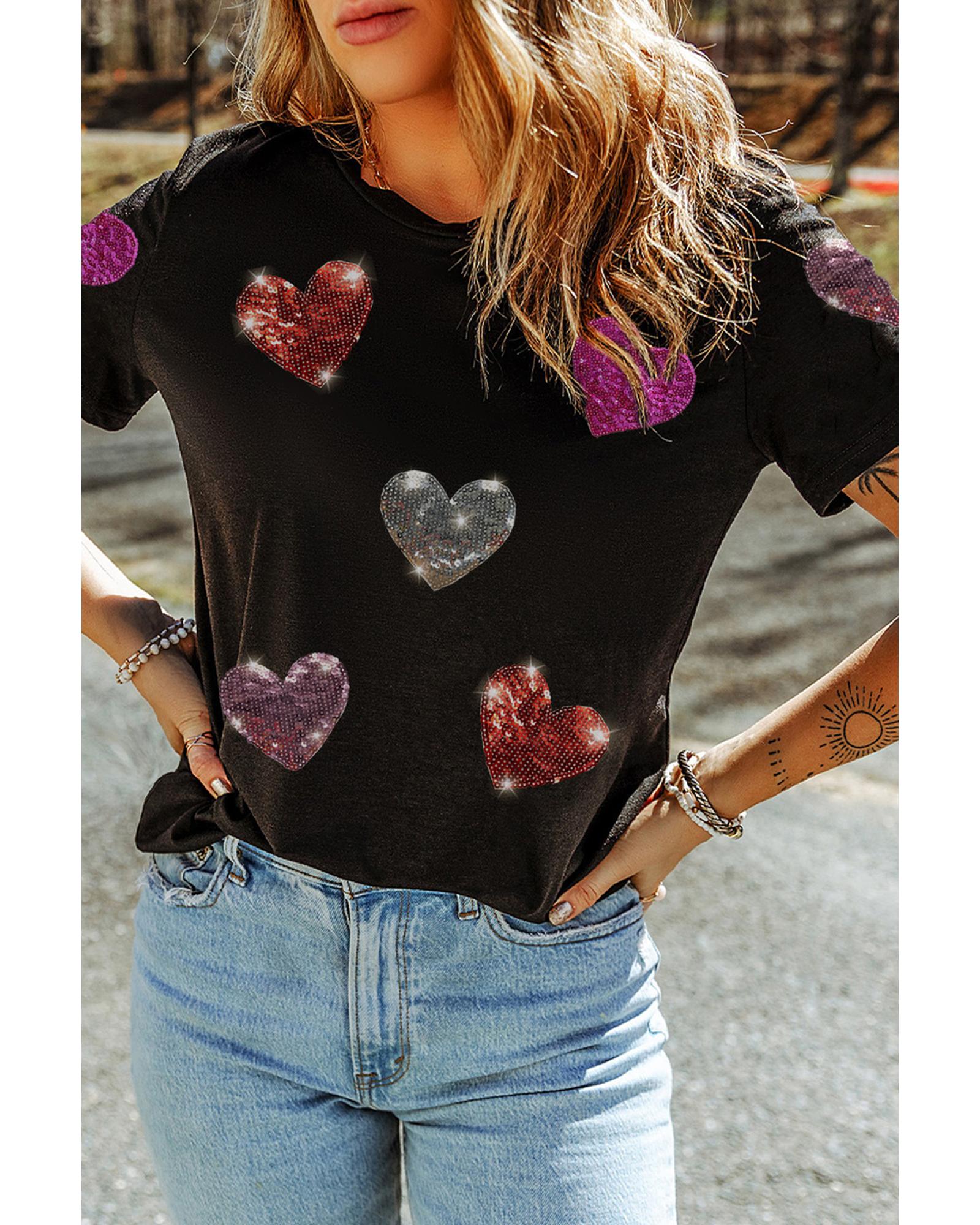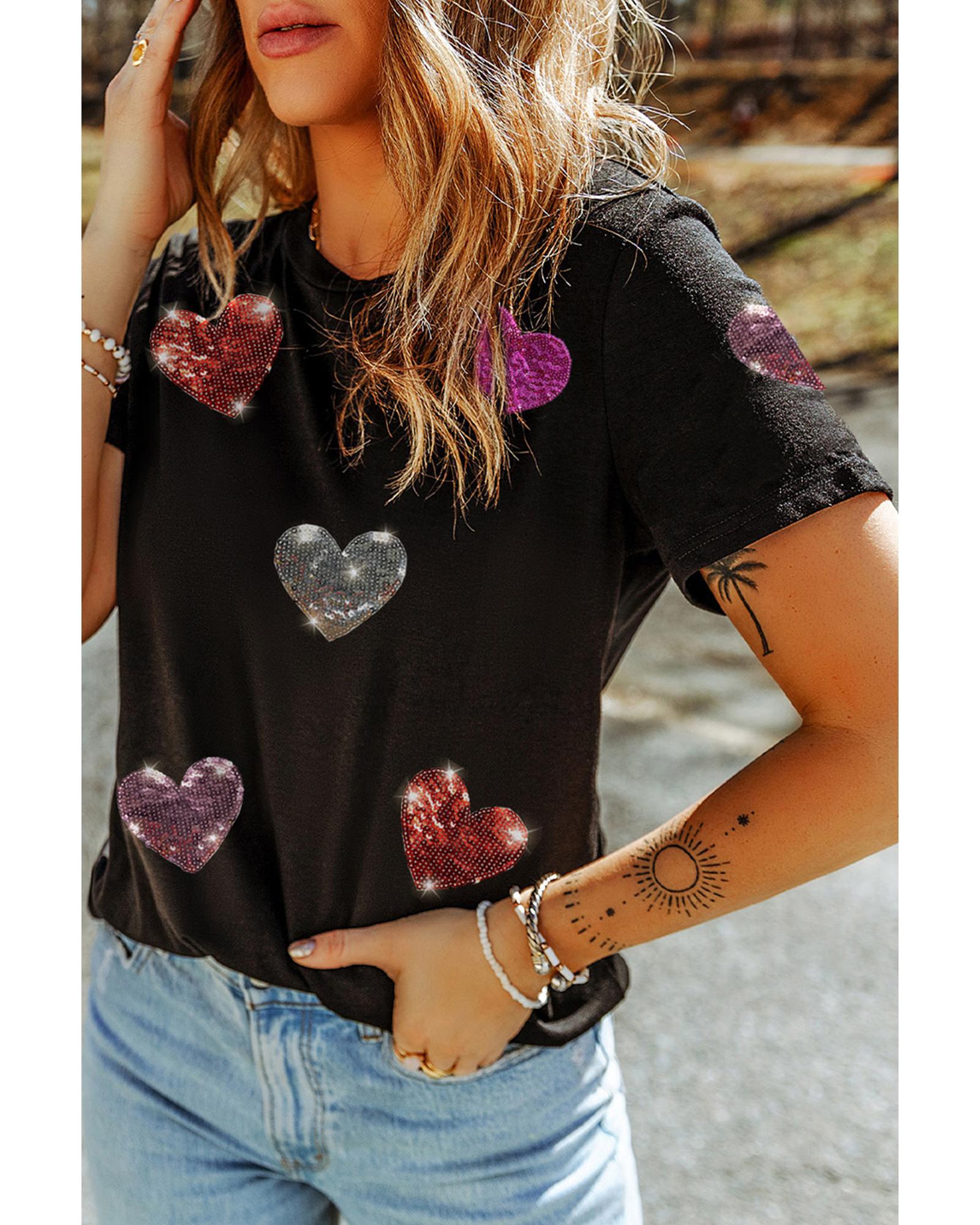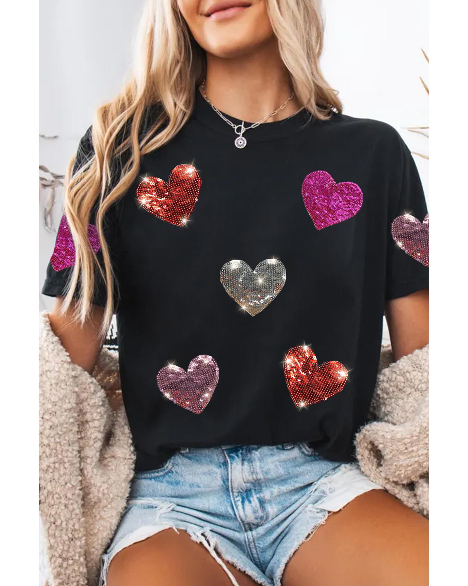 • Black Sequin Heart Patched Pattern Crewneck Valentines Tee