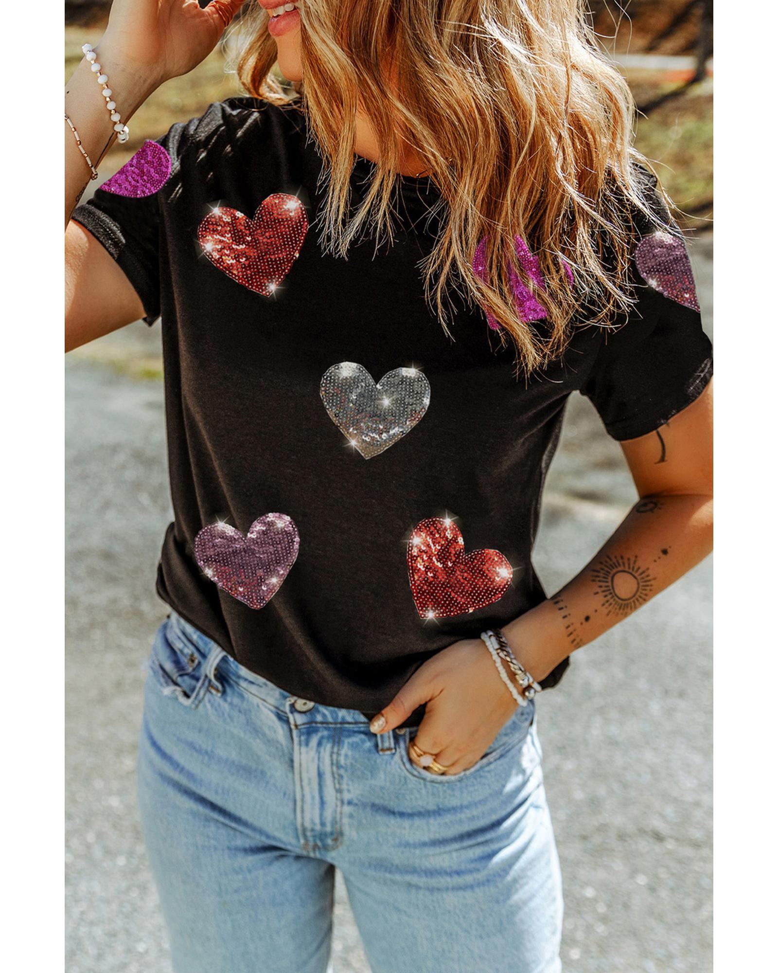 - Black Sequin Heart Patched Pattern Crewneck Valentines Tee