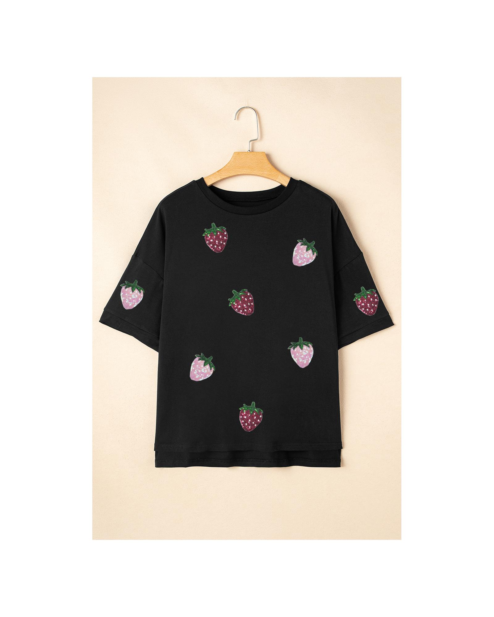 Black Sequin Strawberry Graphic High Low Relaxed Fit Tee – L