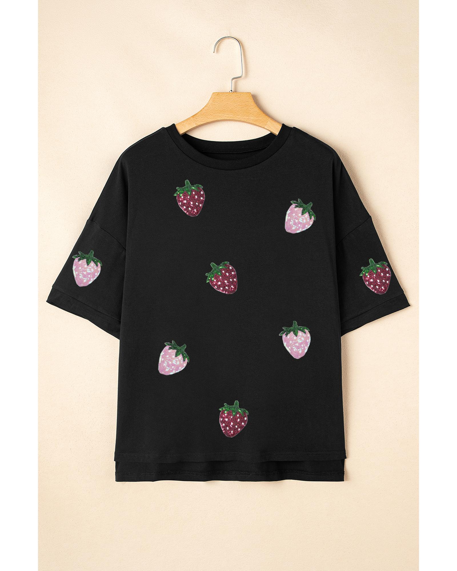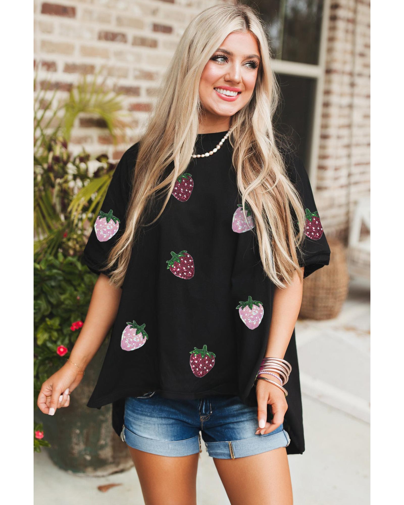 Black Sequin Strawberry Graphic High Low Relaxed Fit Tee – S