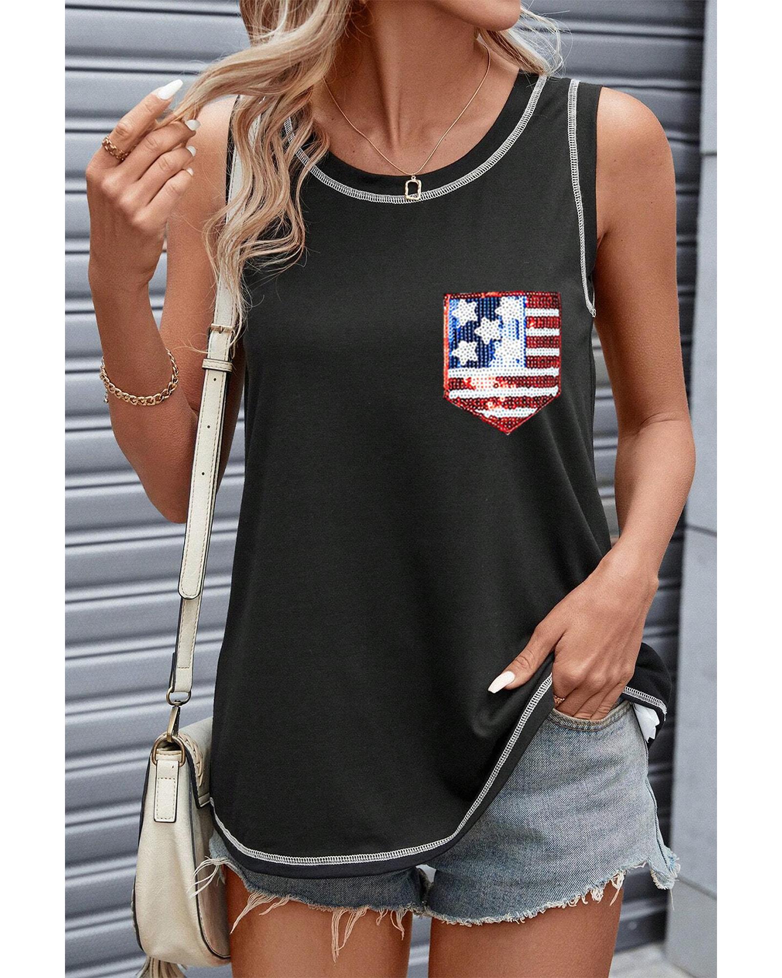 - Black tank top with sequined American flag patch