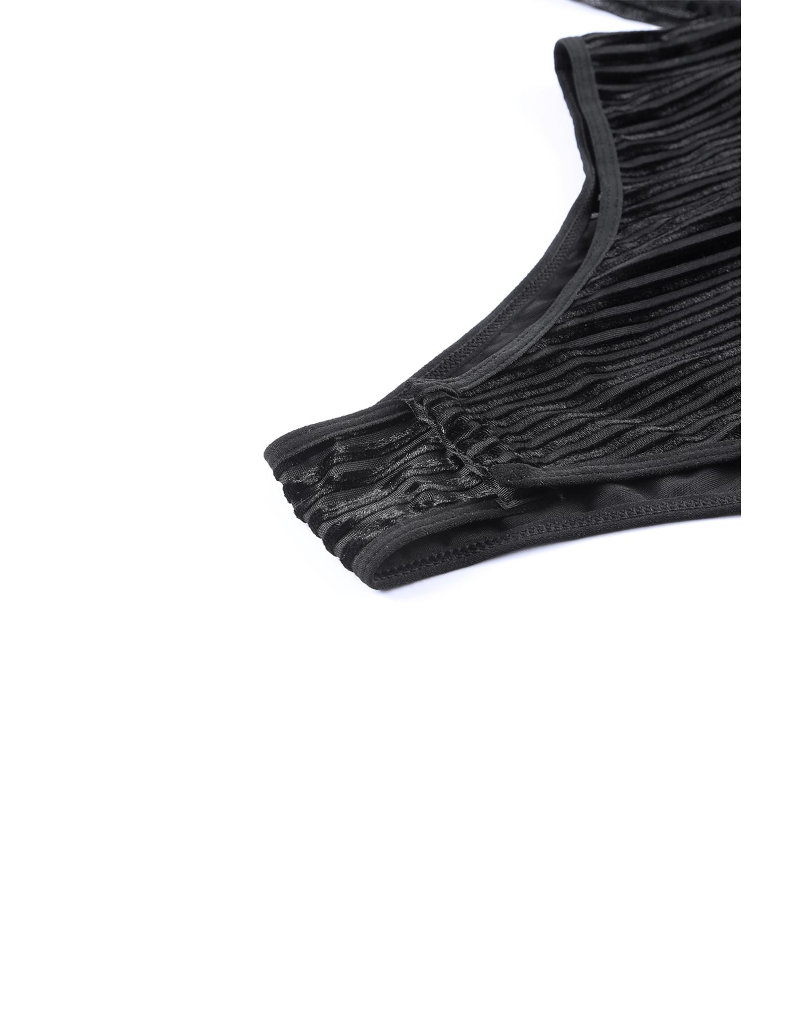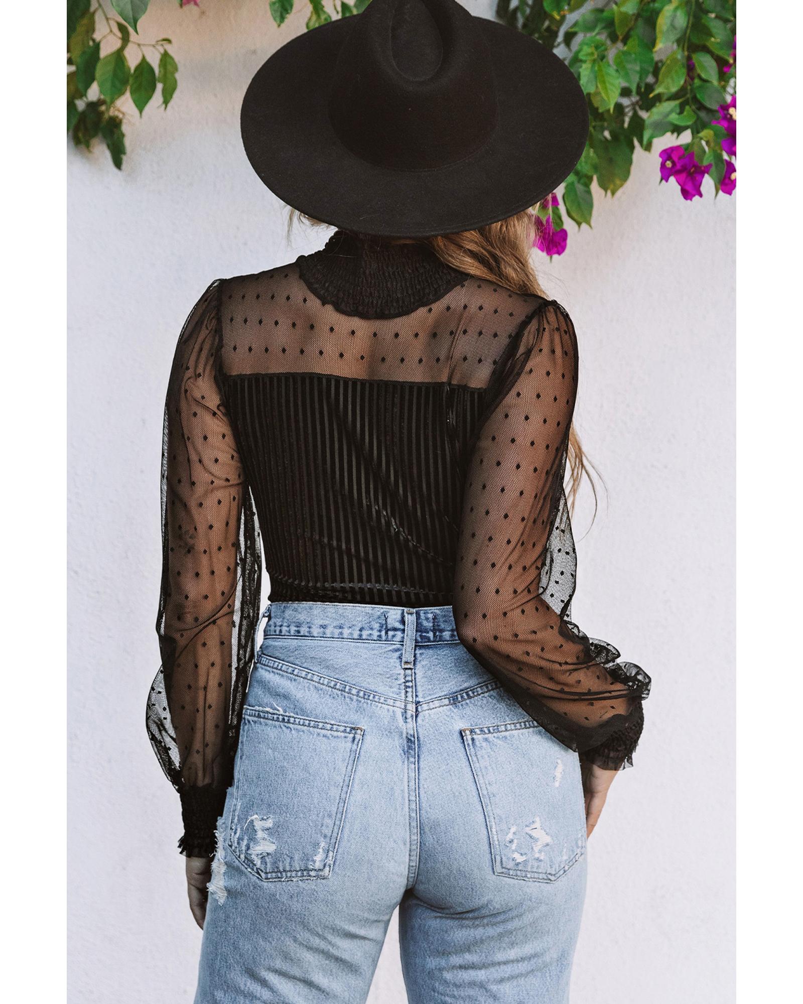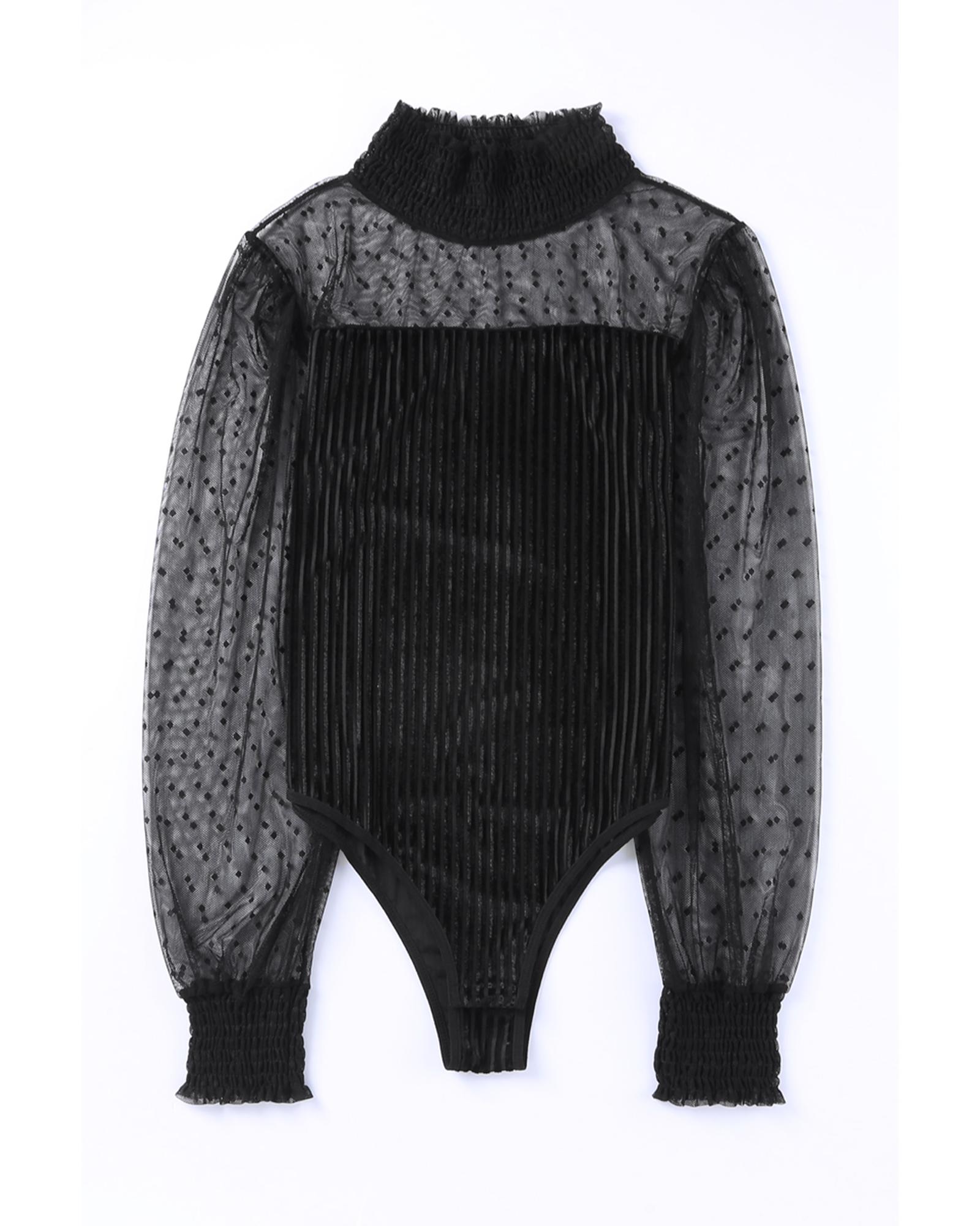 Black Sheer Dotty Long Sleeve Ribbed Velvet Bodysuit – S