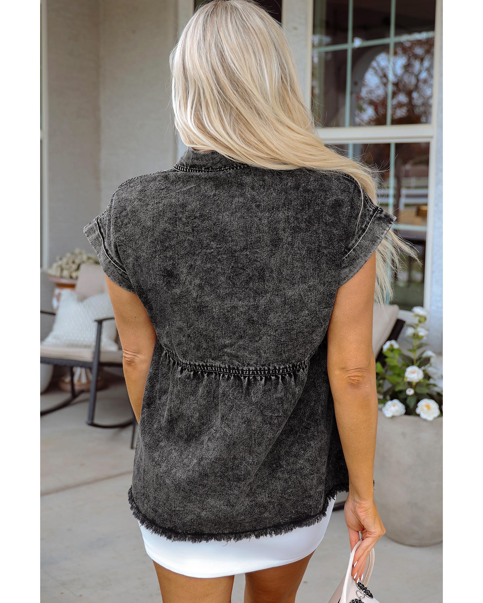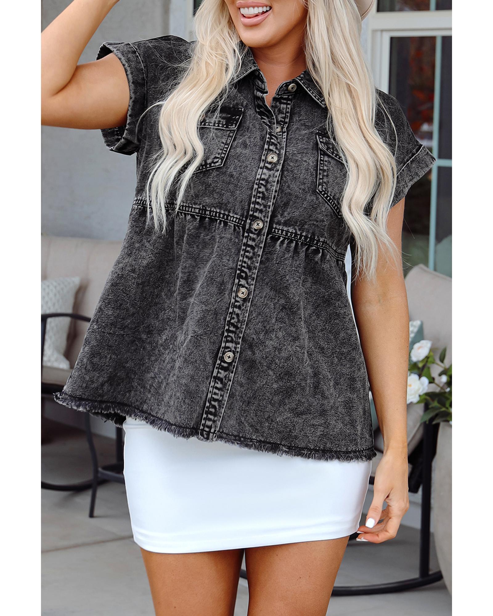 Black Short Sleeve Flap Pocket Button Up Raw Hem Denim Shirt – M