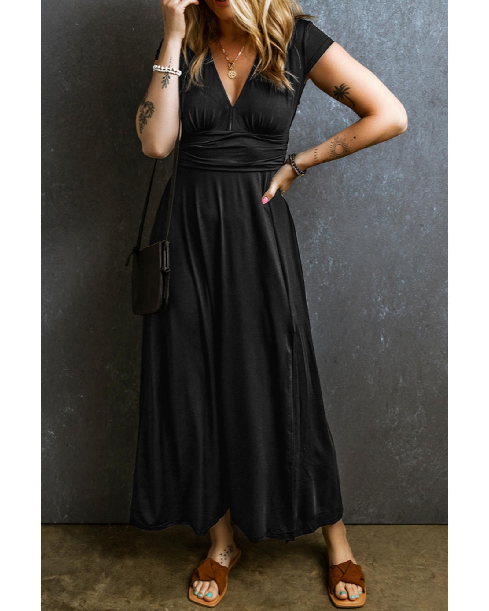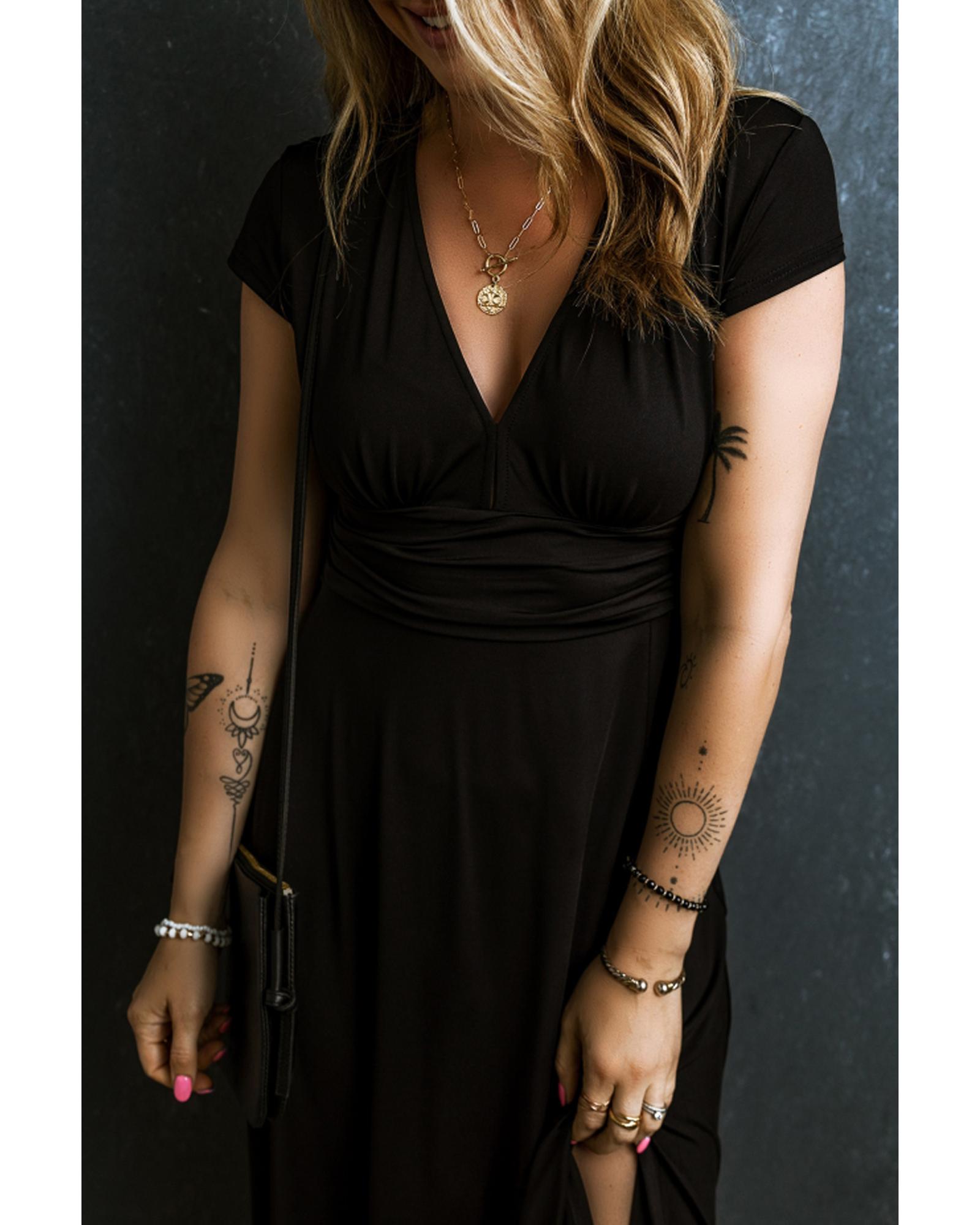 Black Short Sleeve Shirred High Waist V Neck Maxi Dress – L