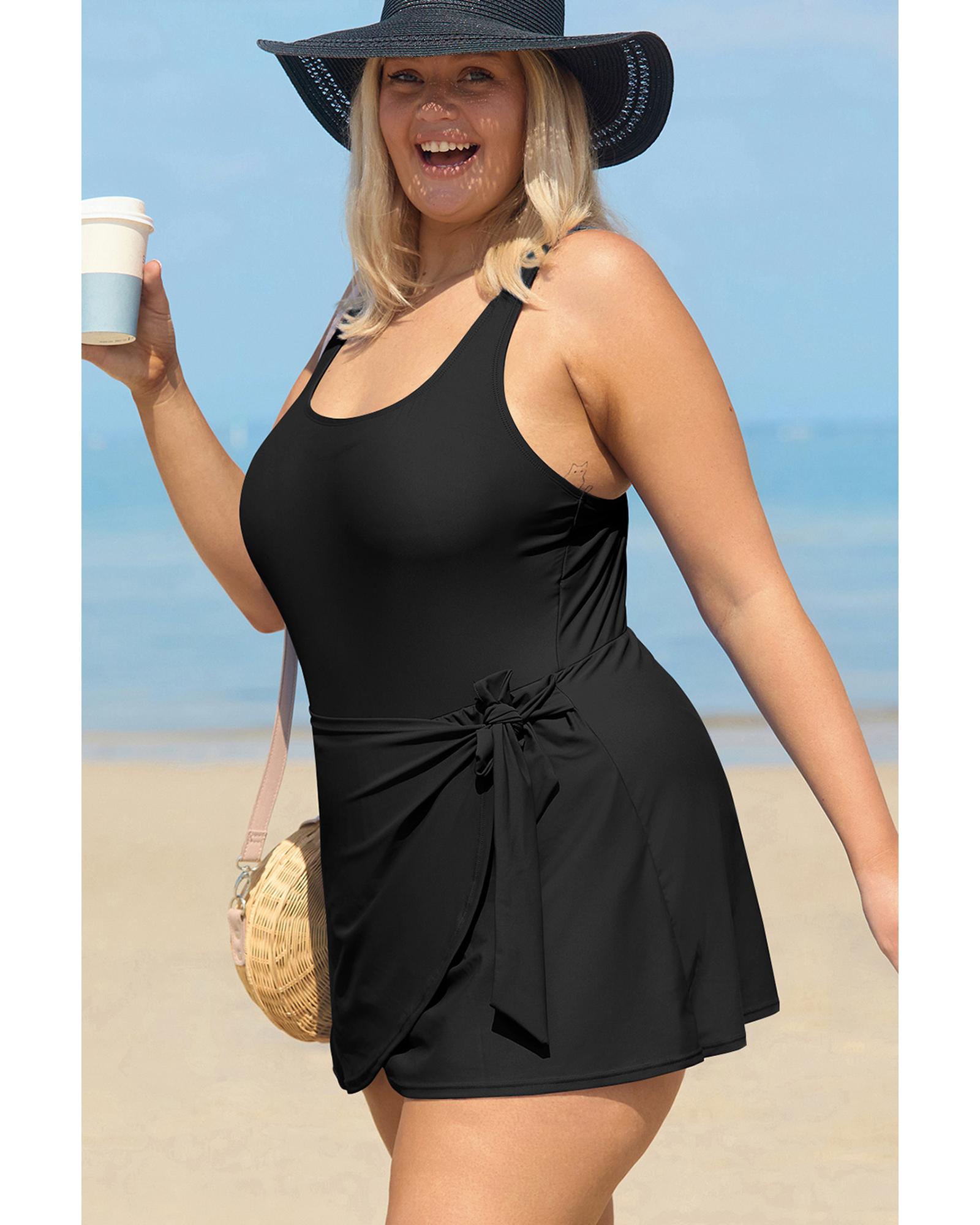Black Solid Color Square Neck Knotted Plus Size One Piece Swimsuit – 2X