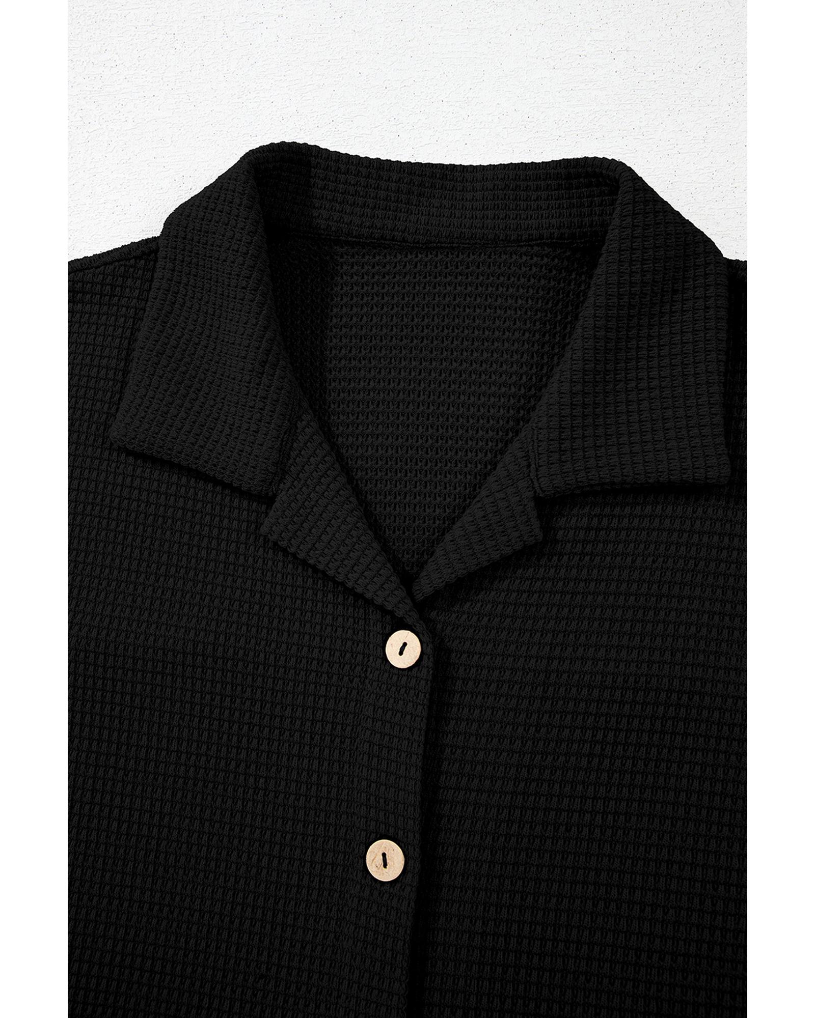 Black Solid Color Textured Buttoned Shirt and Casual Pants Set – M