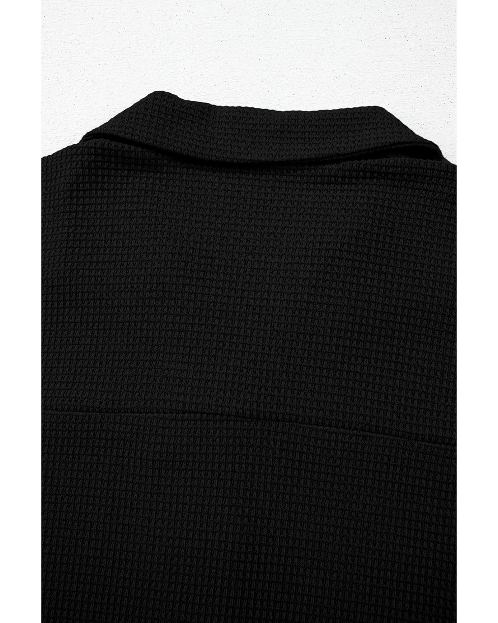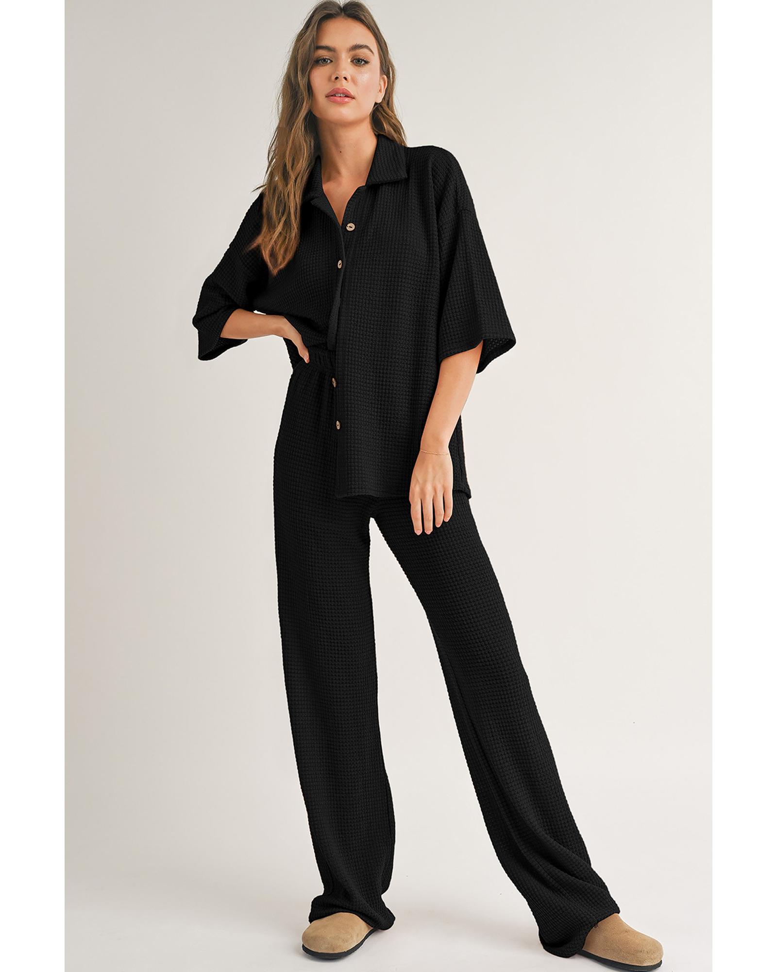 Black Solid Color Textured Buttoned Shirt and Casual Pants Set – XL