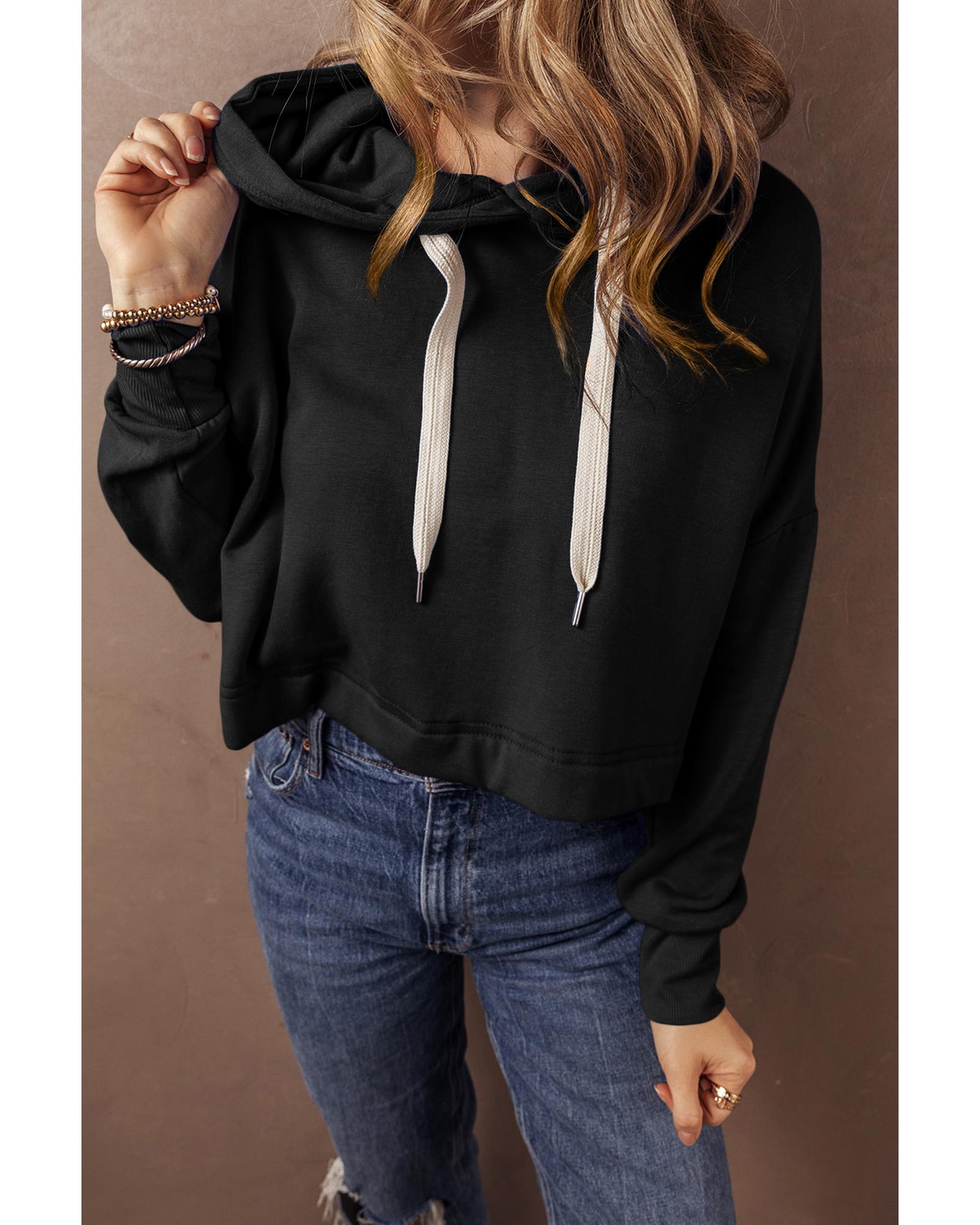 Black Solid Drop Shoulder Drawstring Cropped Hoodie – S
