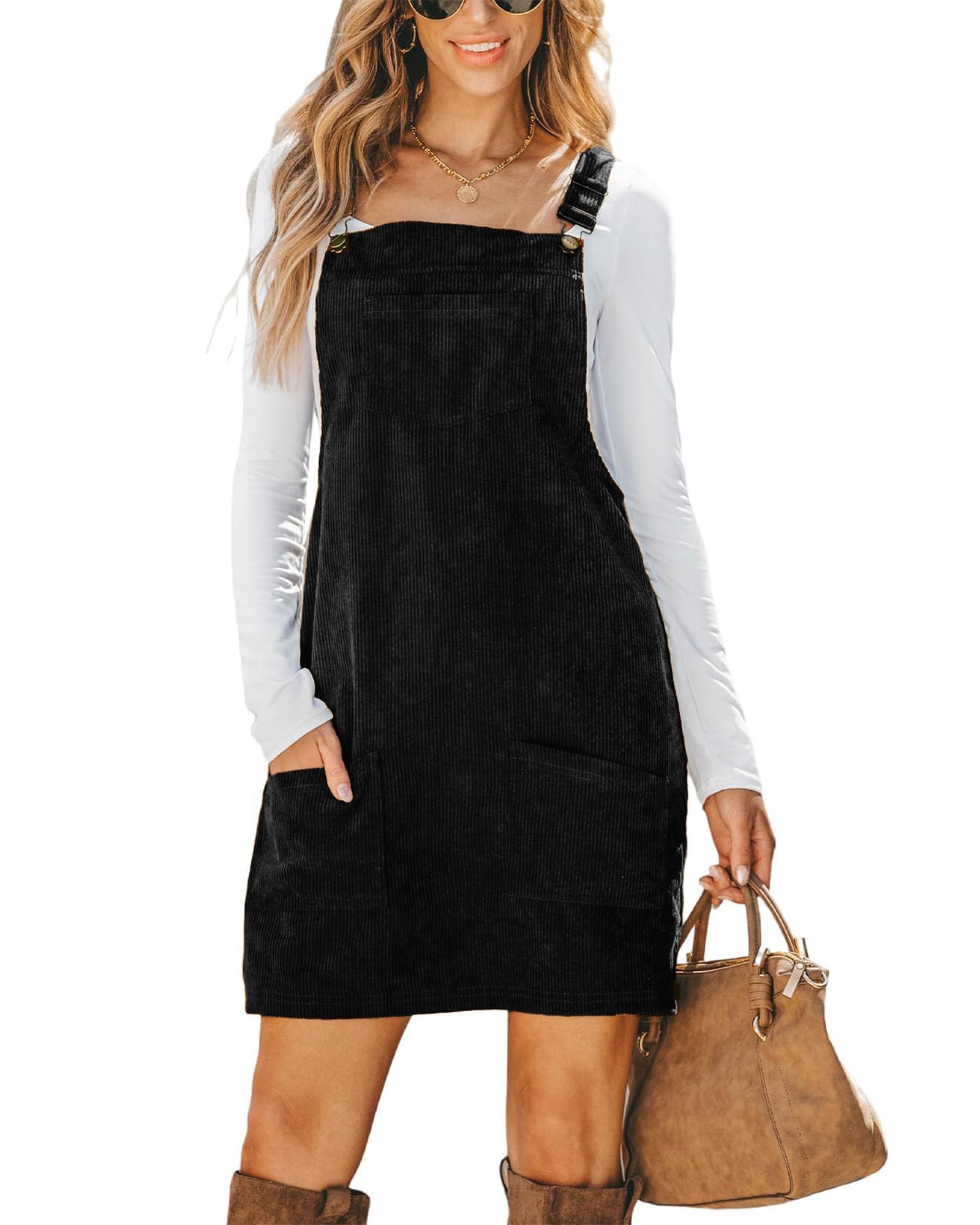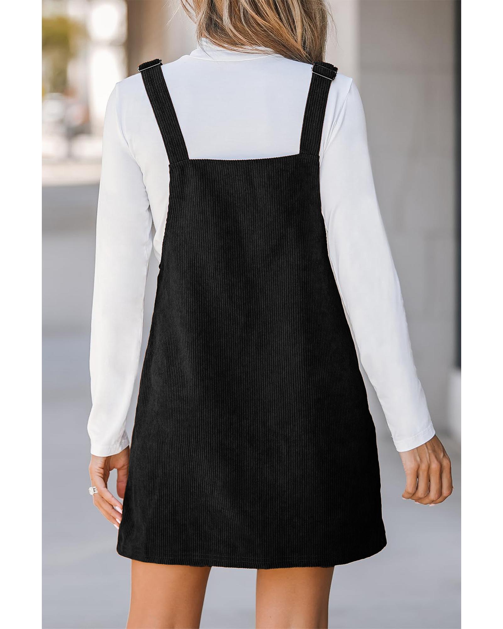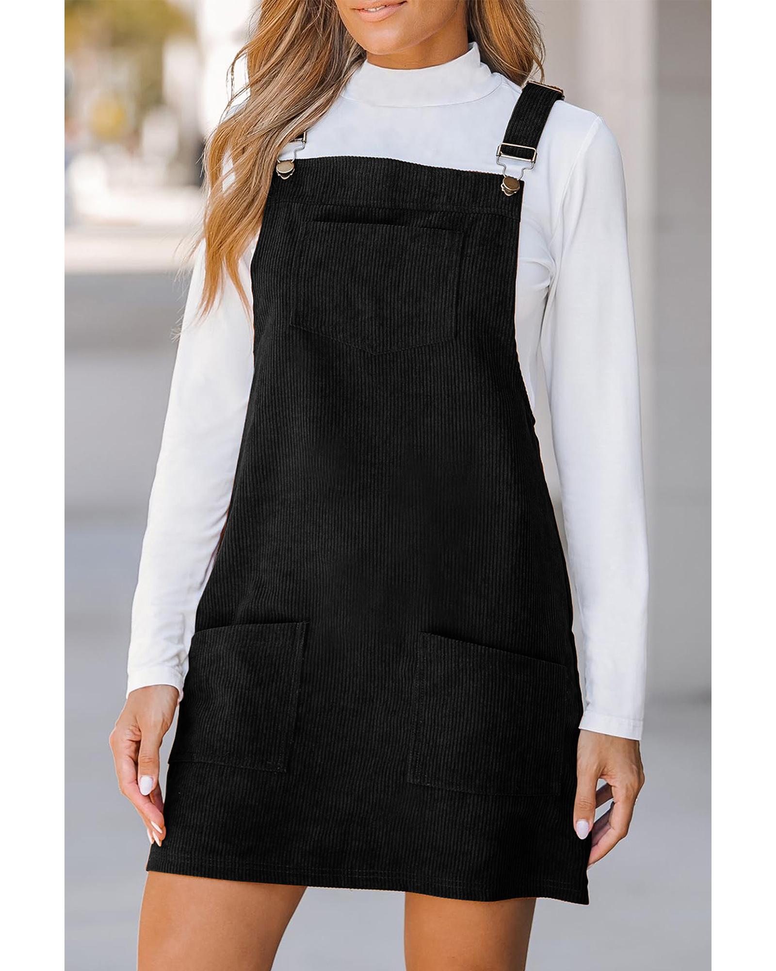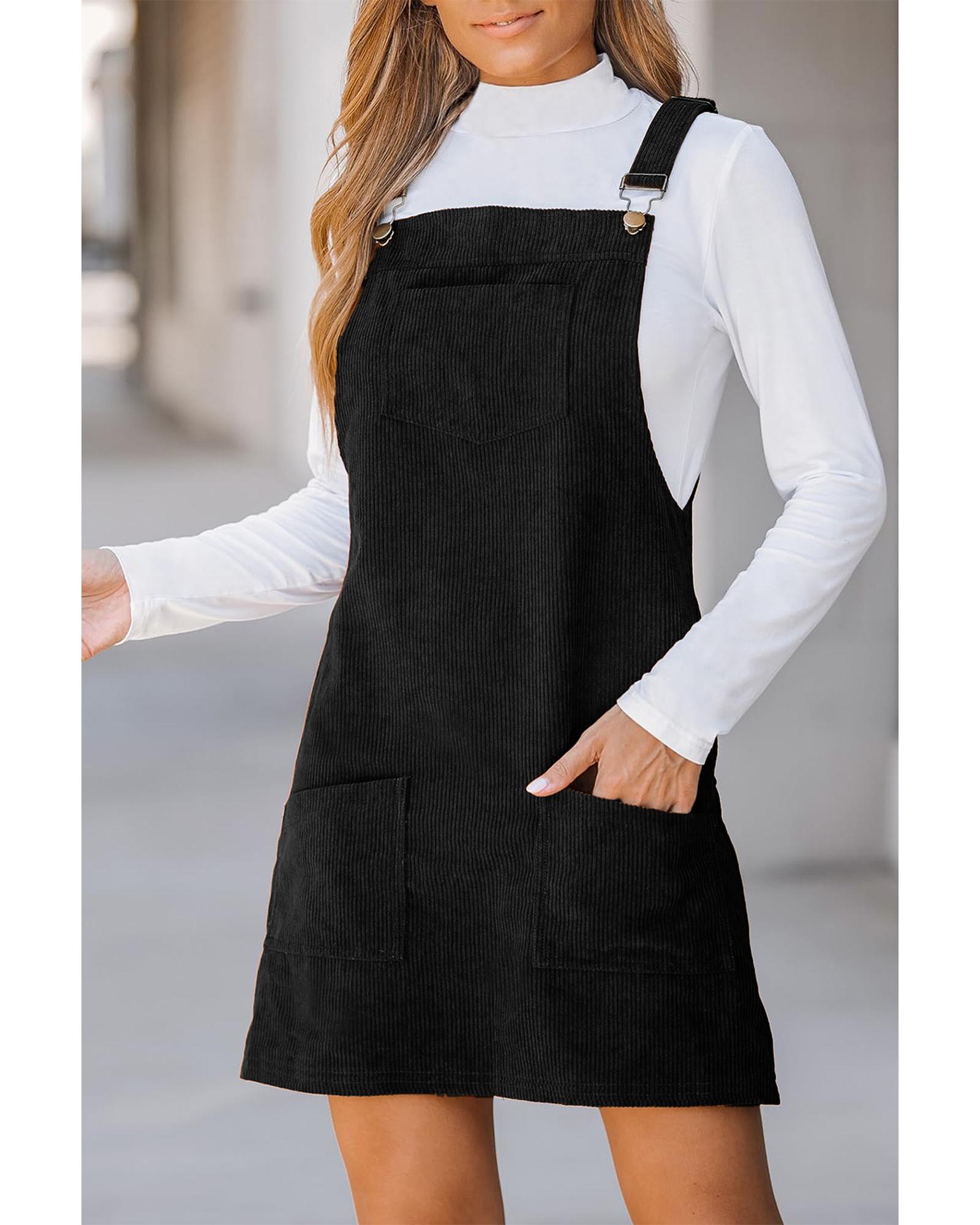 - Black Solid Front Pockets Sleeveless Corduroy Overall Dress