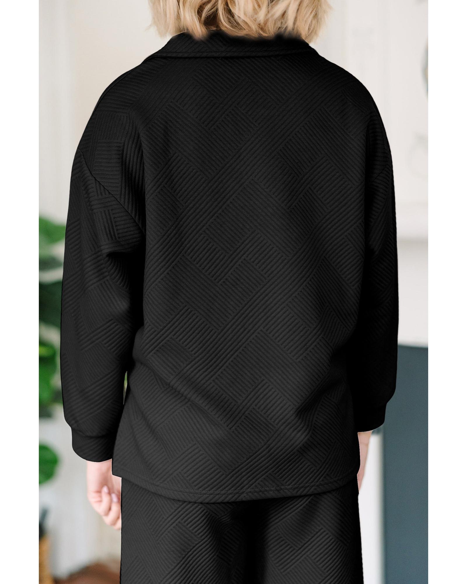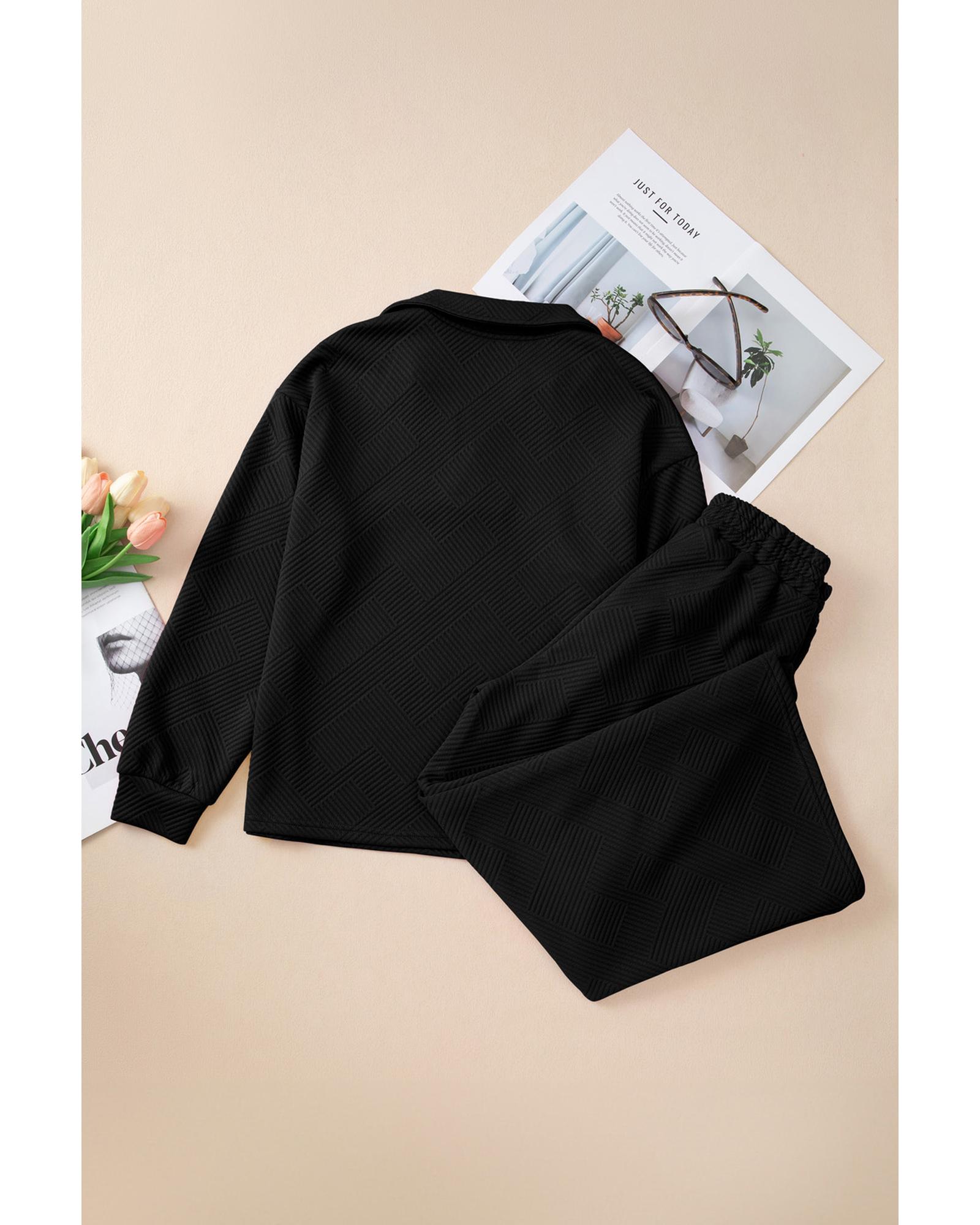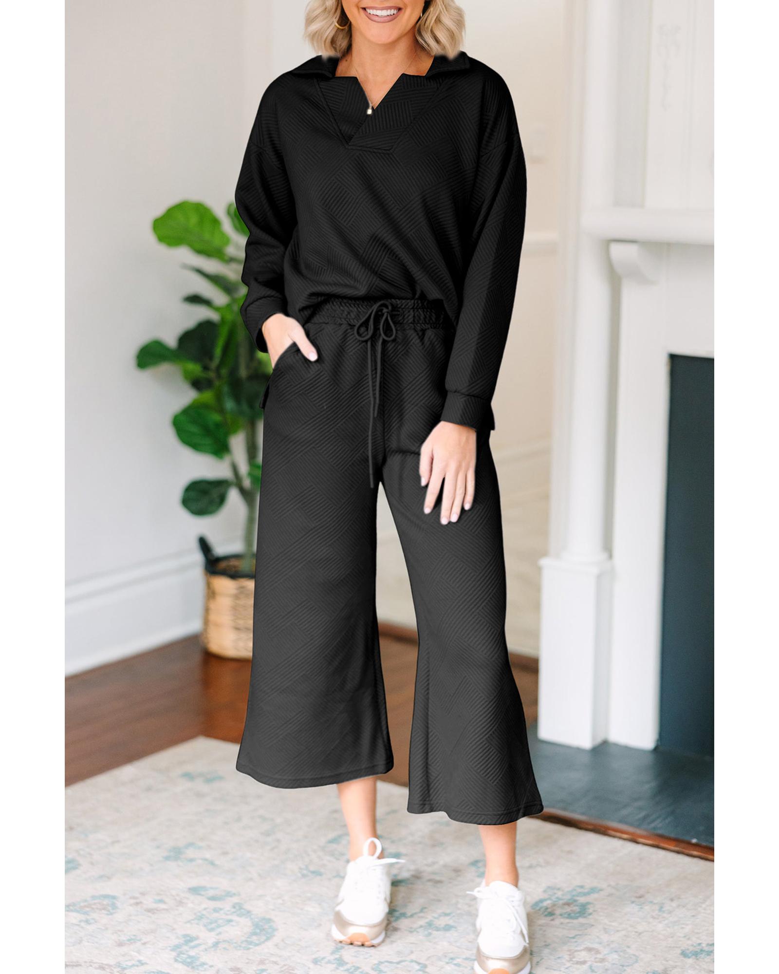 Black Solid Textured Collared V Neck Top and Wide Leg Pants Set – M