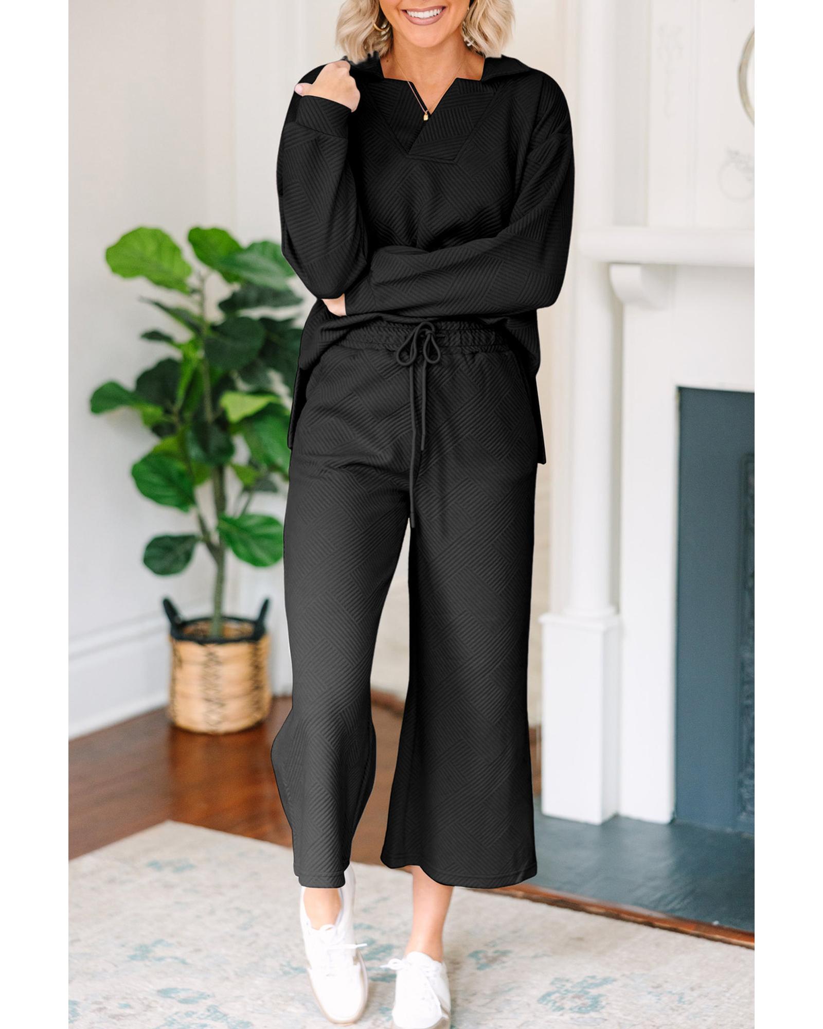 Black Solid Textured Collared V Neck Top and Wide Leg Pants Set – XL