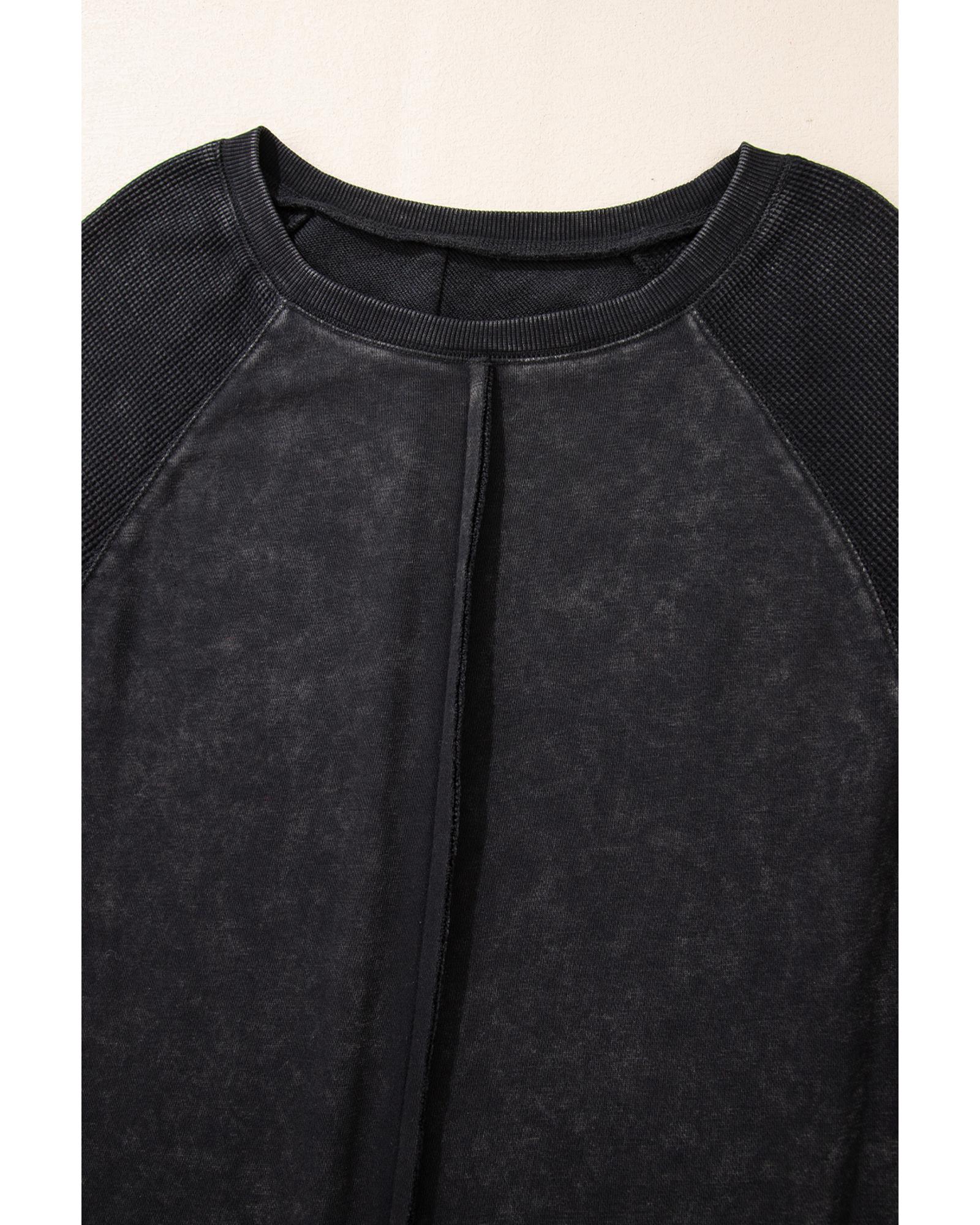 Black Solid Waffle Knit Patchwork Raglan Sleeve Sweatshirt – M