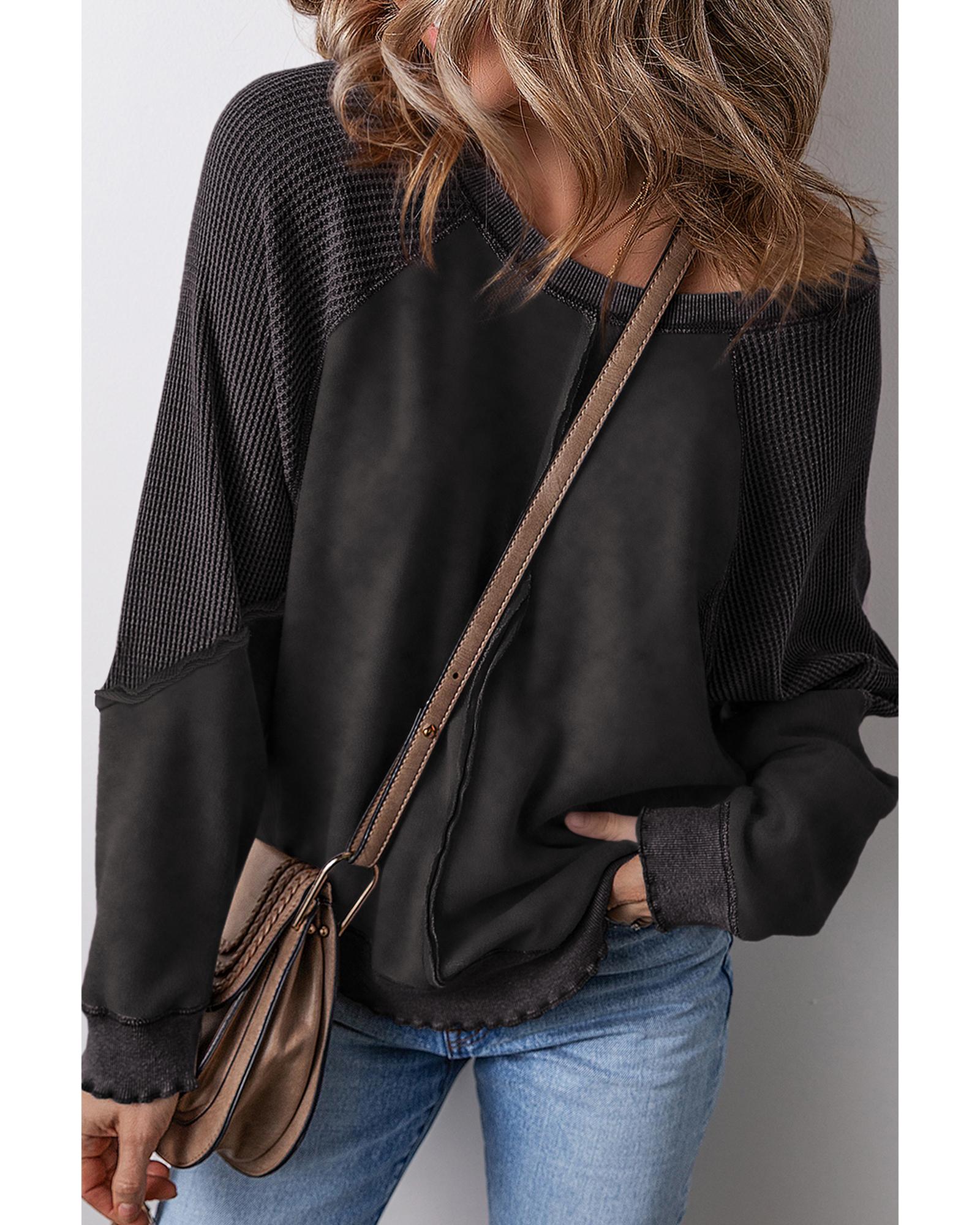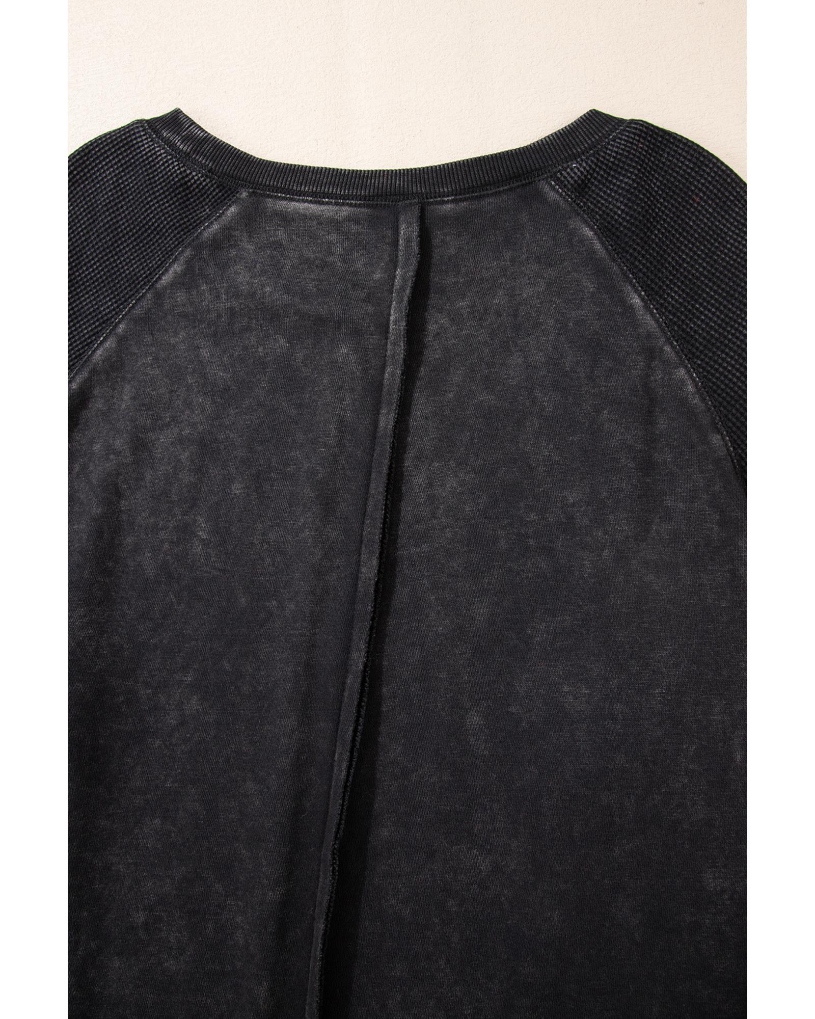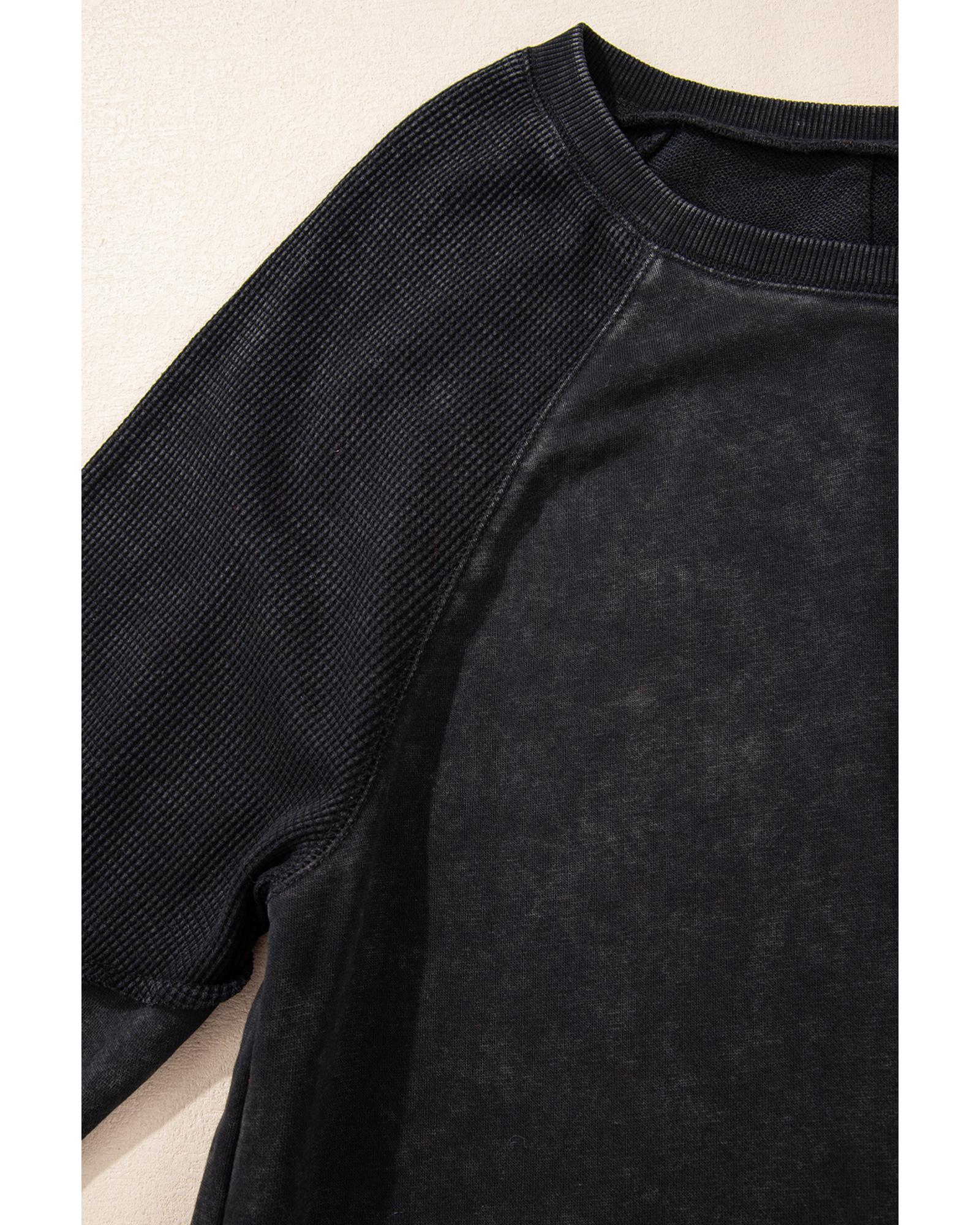 Black Solid Waffle Knit Patchwork Raglan Sleeve Sweatshirt – S