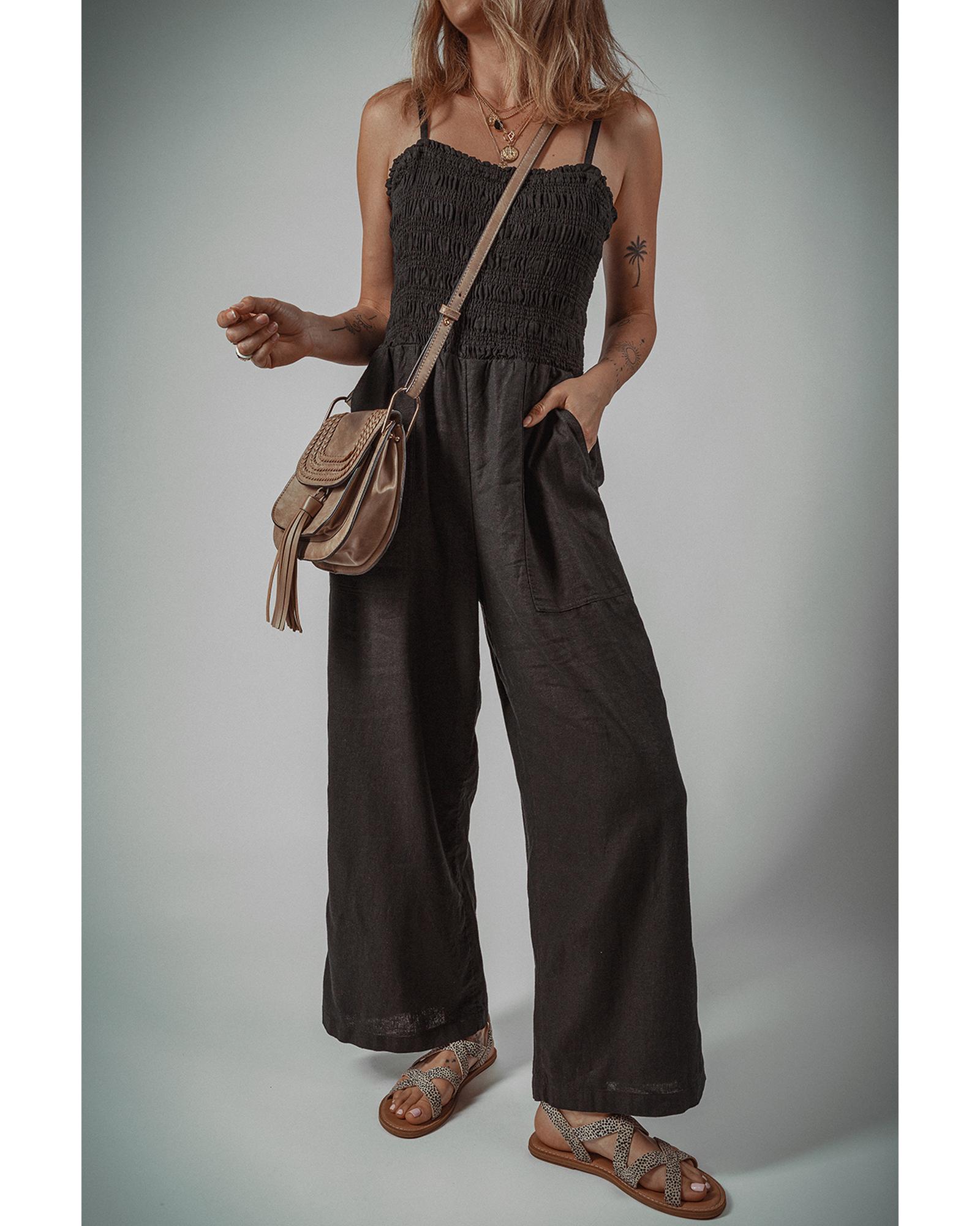 Black Spaghetti Straps Shirred Bodice Pocketed Wide Leg Jumpsuit – L