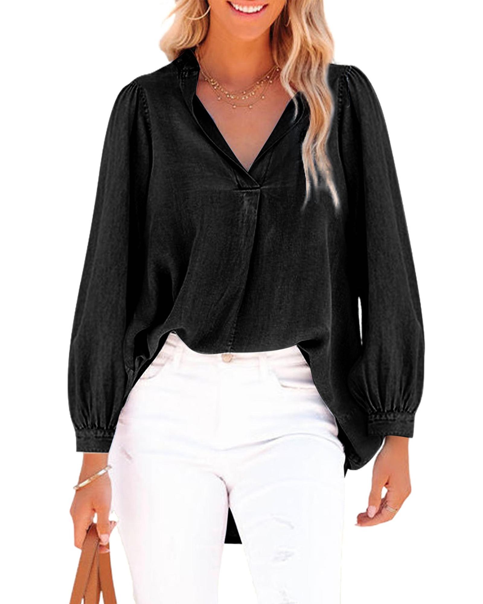 Black Split V-Neck Balloon Sleeve Ruched Denim Top – XL