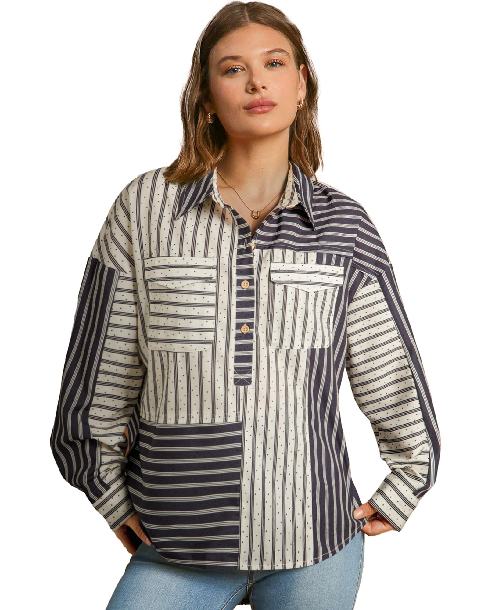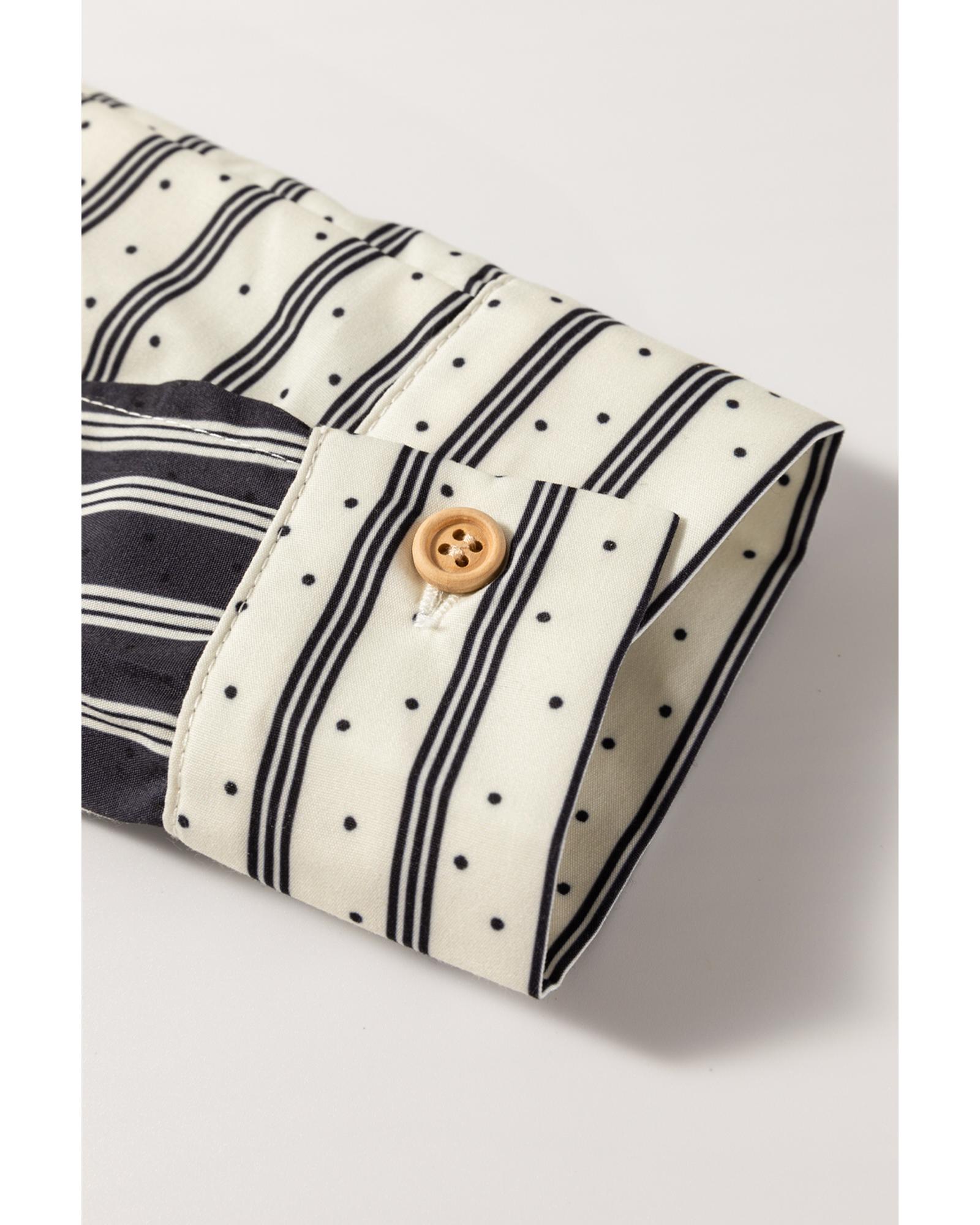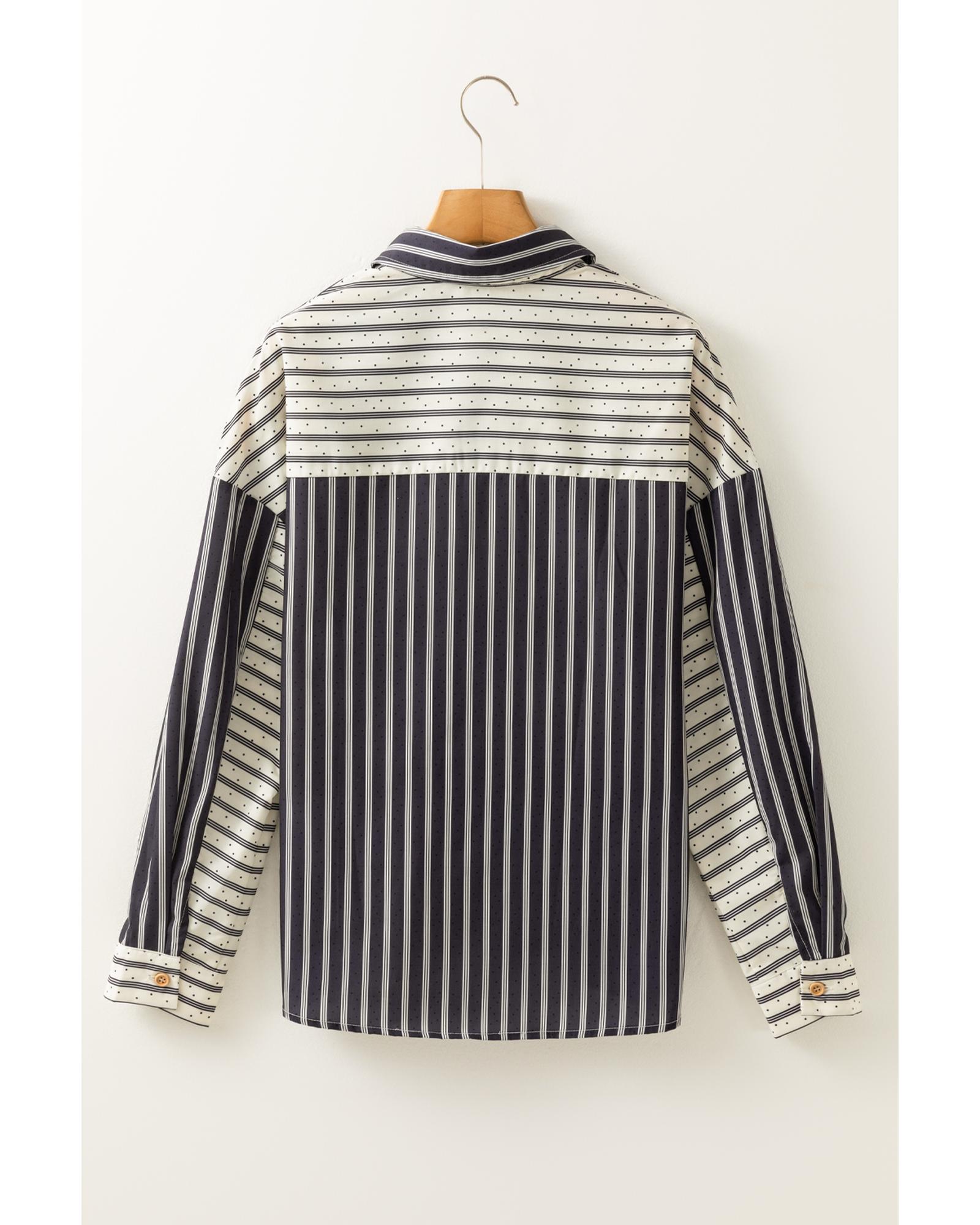 Black Stripe 2-tone Patchwork Half Buttons Chest Pockets Casual Blouse – M