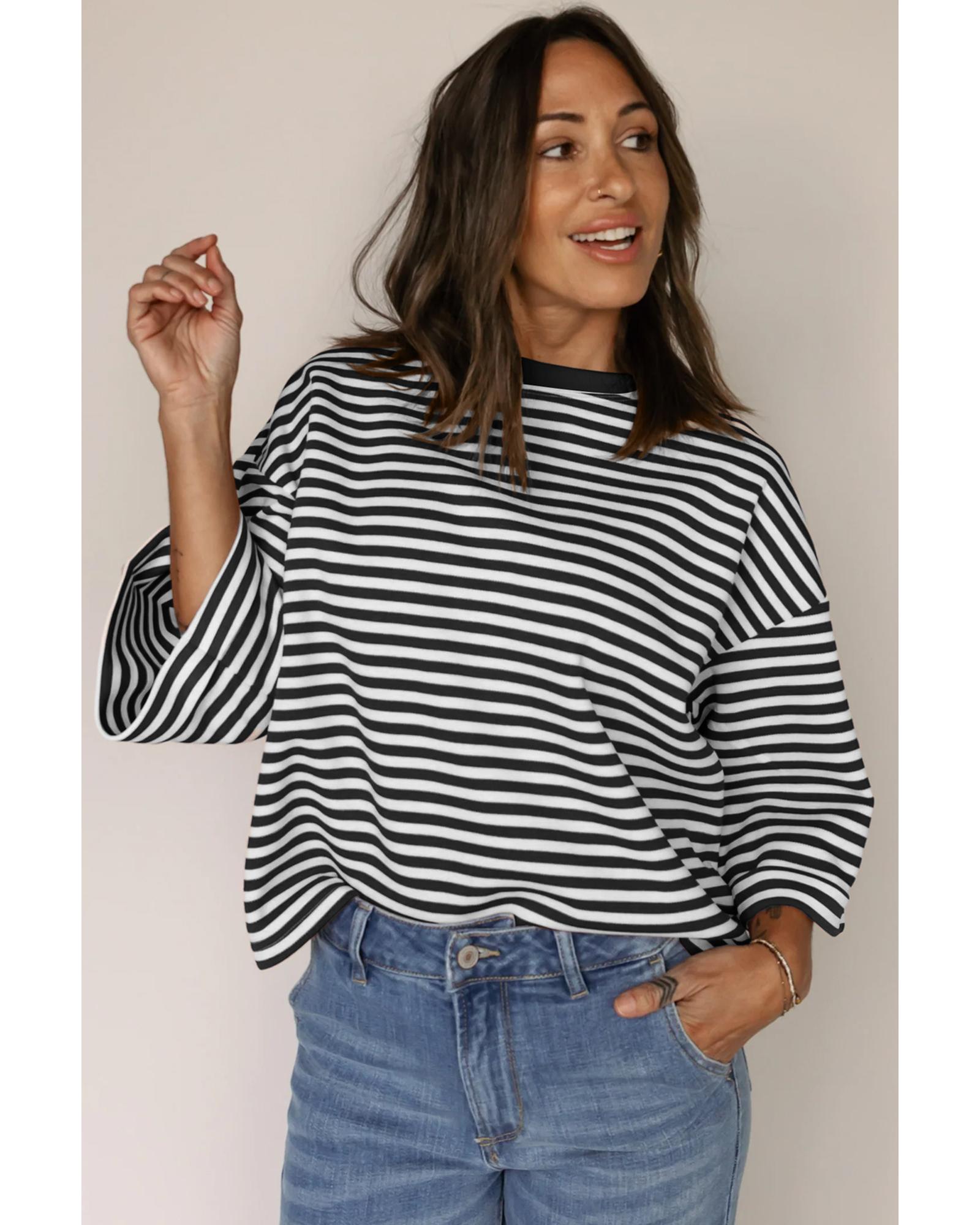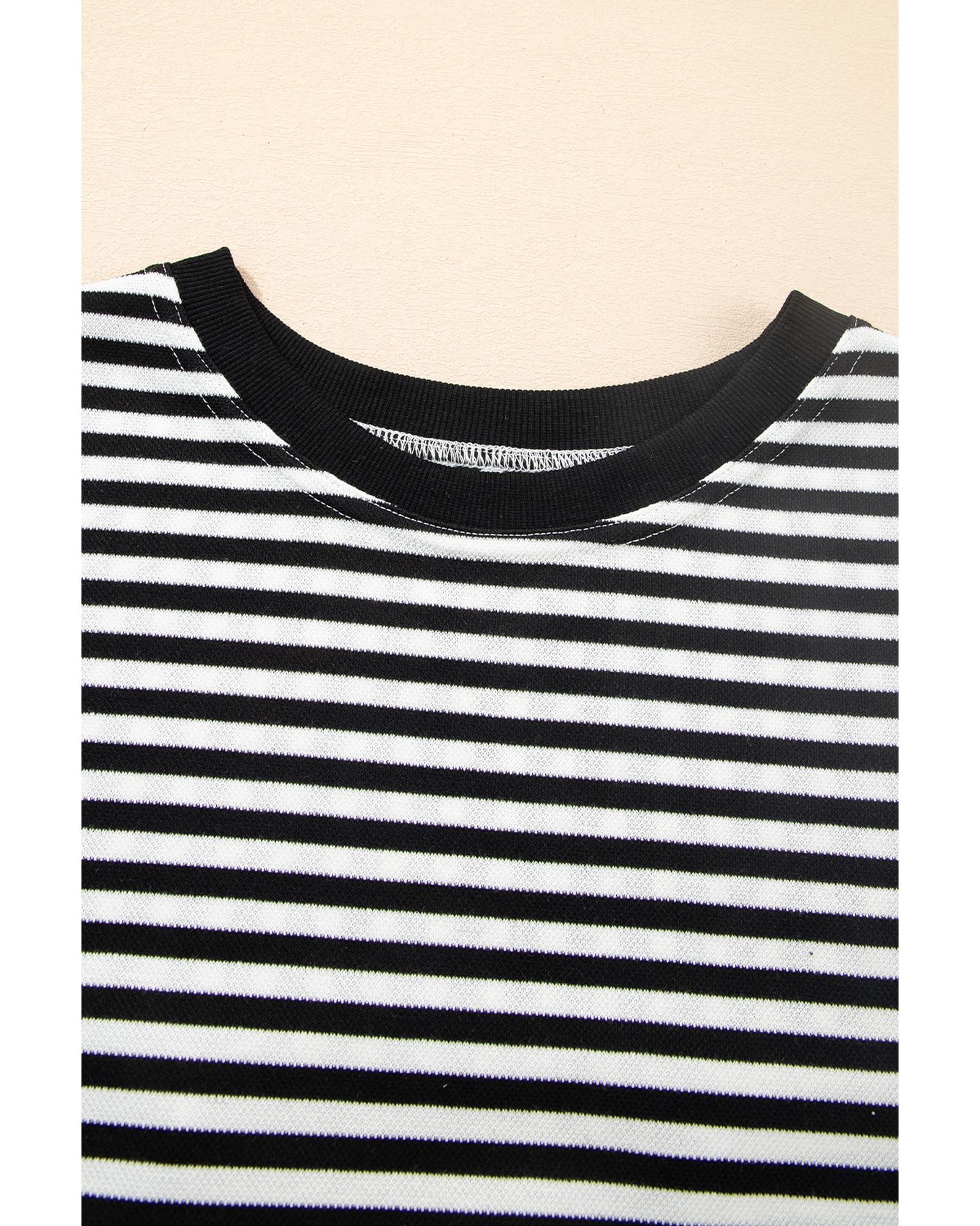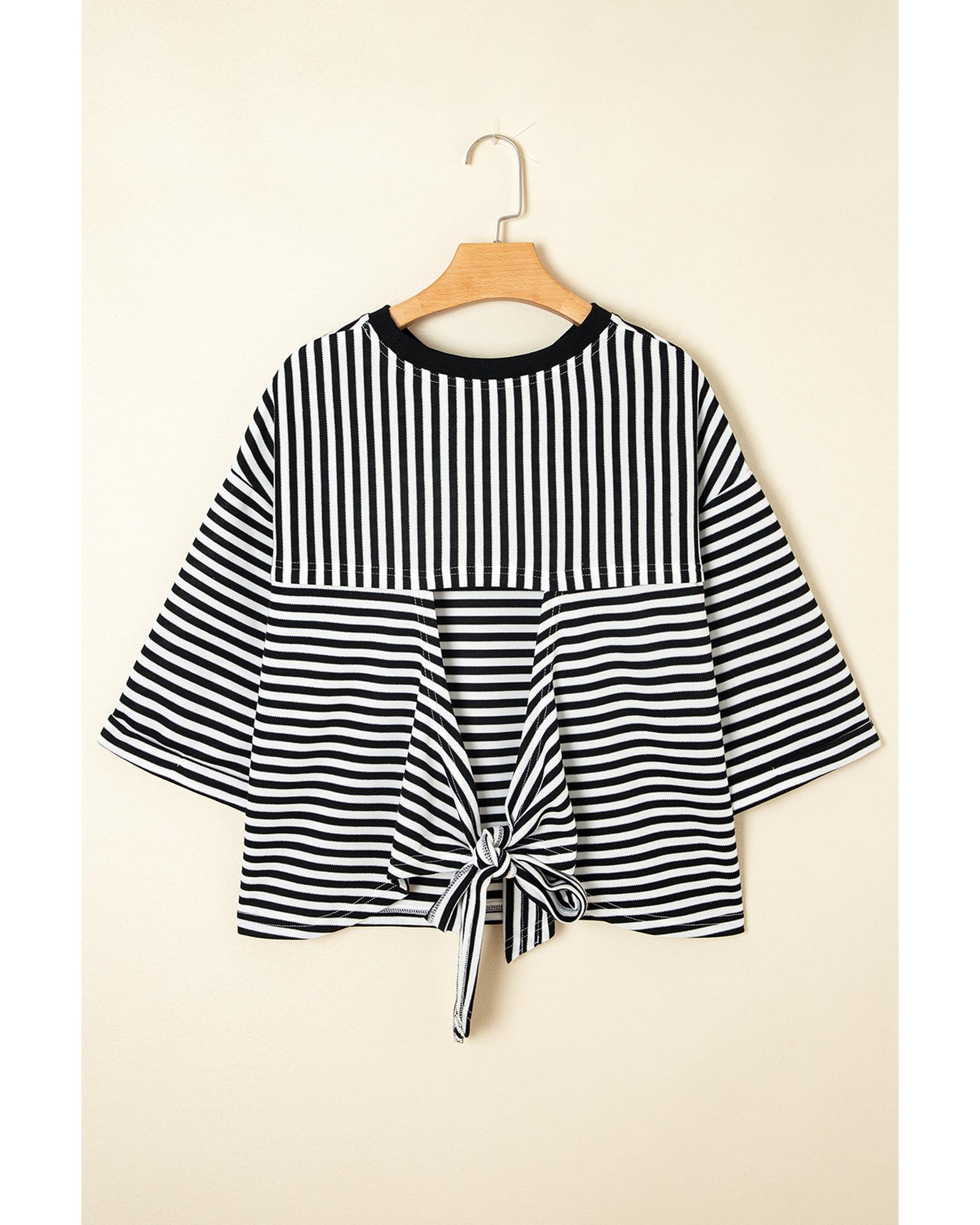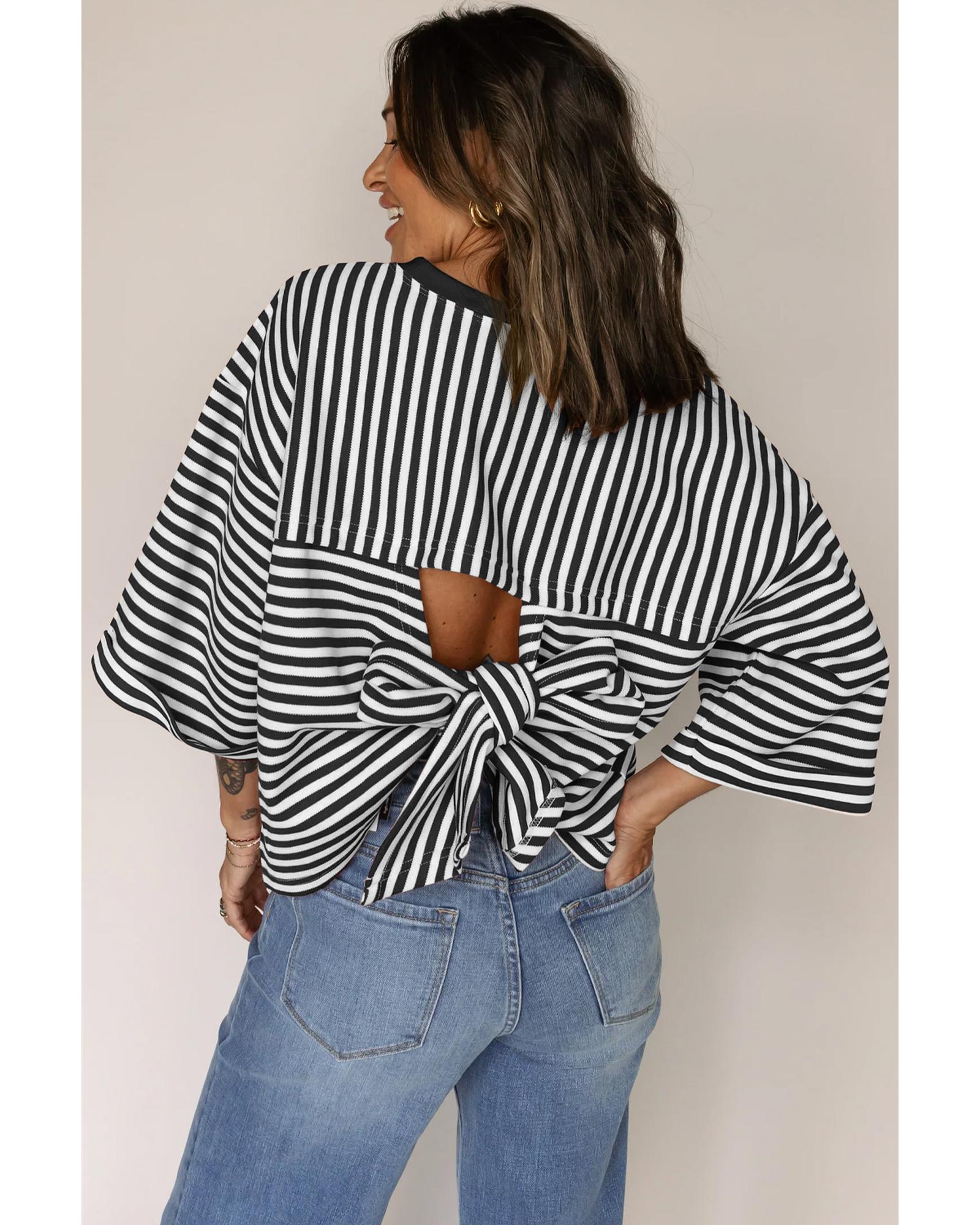 Black Stripe Bowknot Cutout Back Drop Shoulder Wide Bracelet Sleeve Loose Tee – L