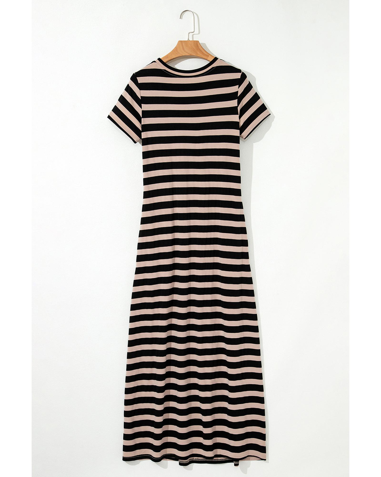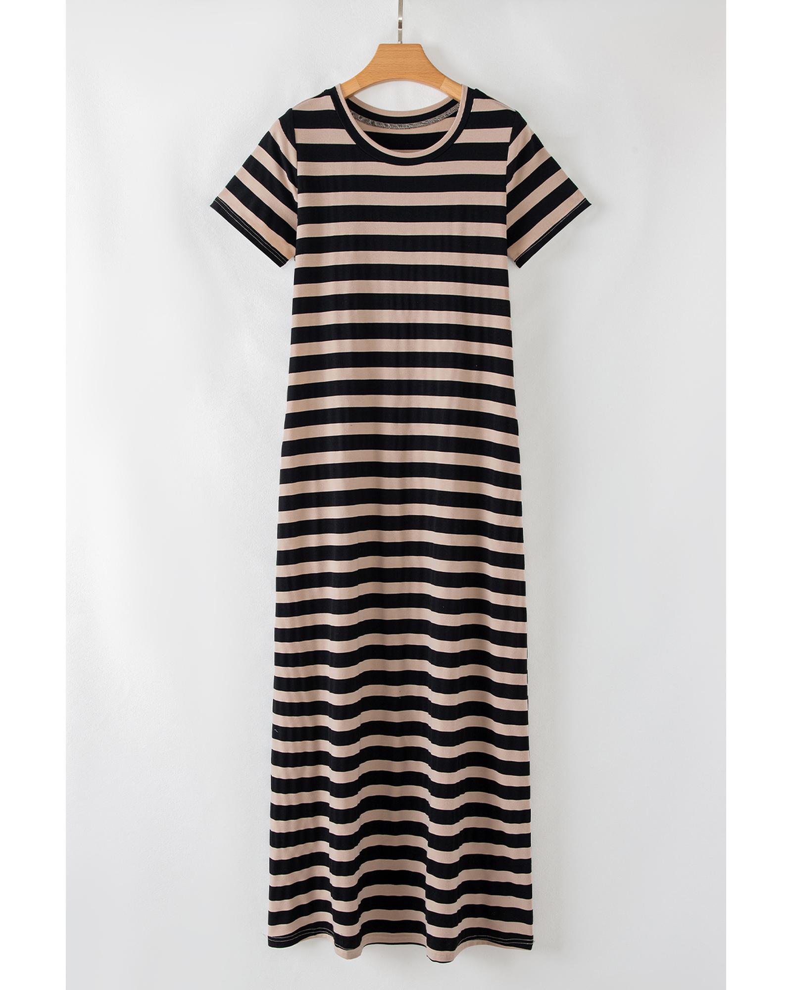 Black Stripe Casual Round Neck T-shirt Maxi Dress with Pockets – L
